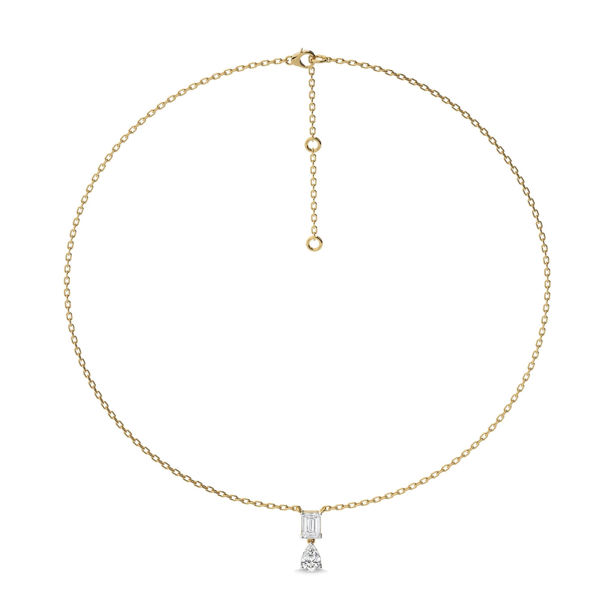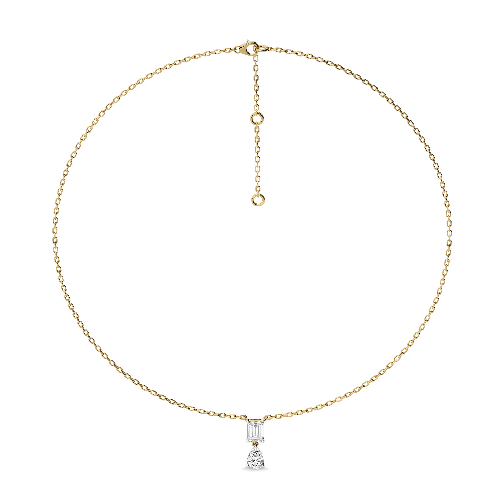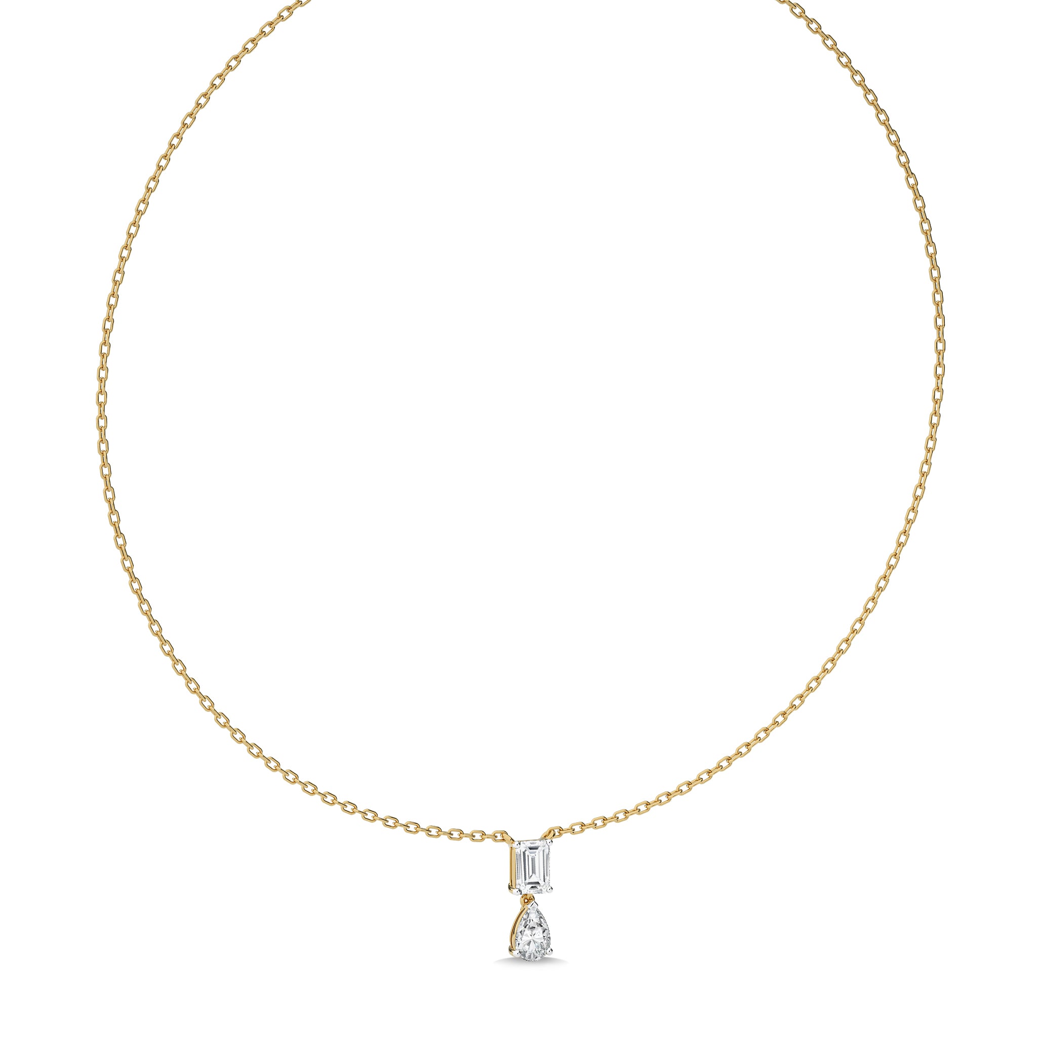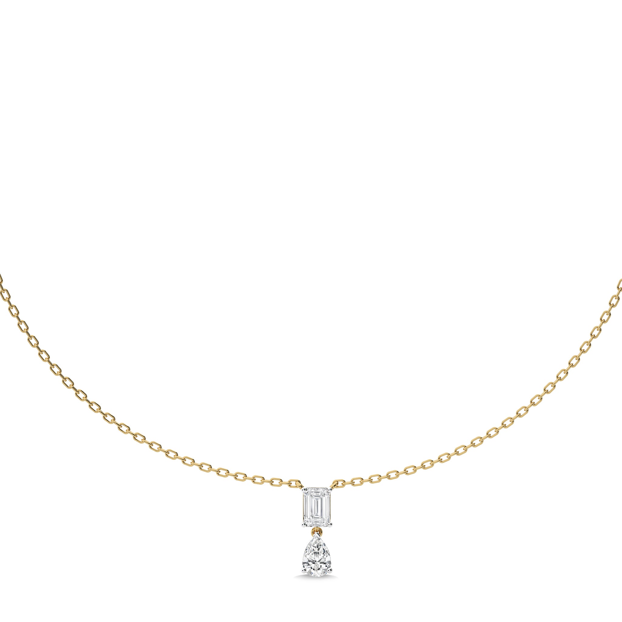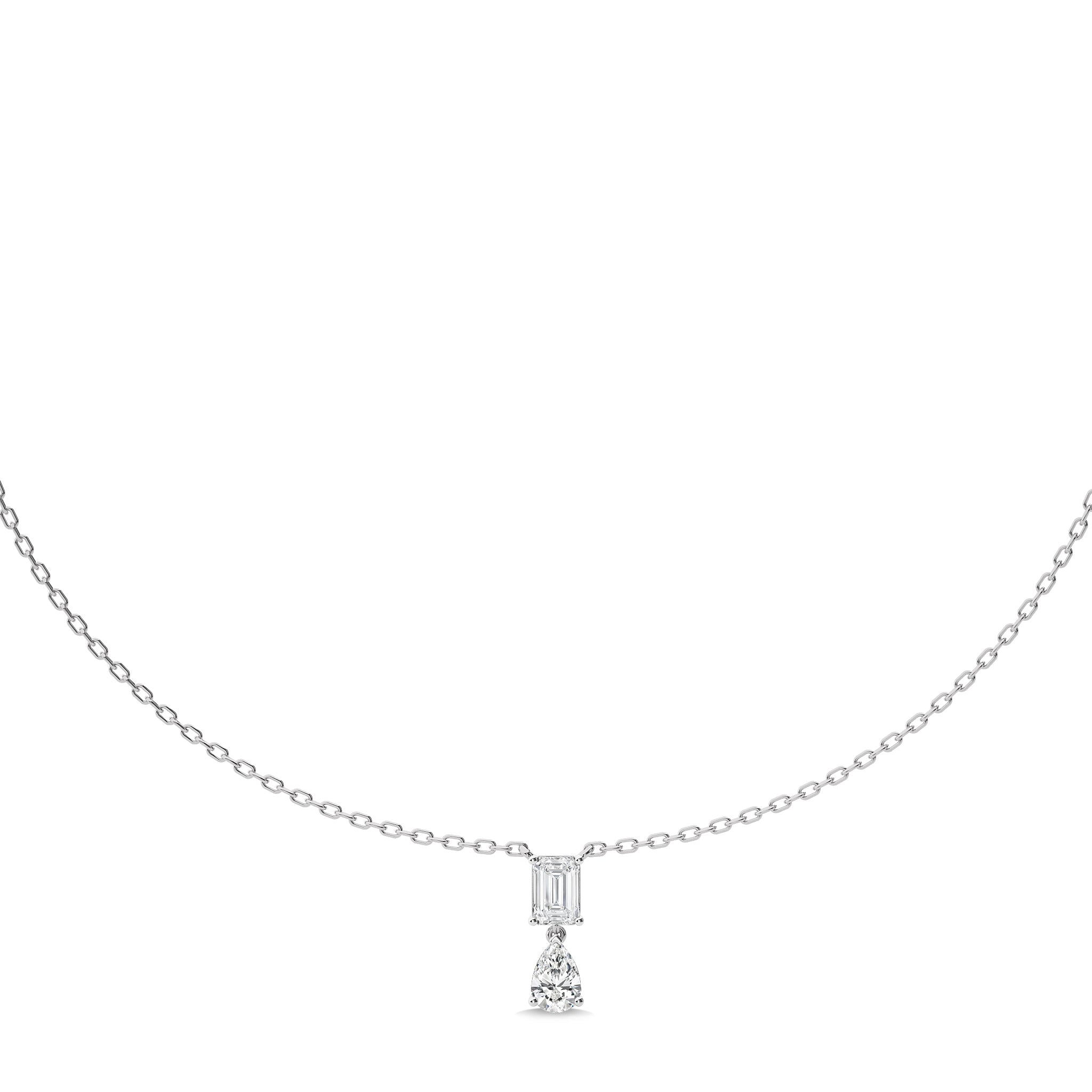 Upgrade your style with our Royal Emerald and Pear Dual Lab Created Diamond Necklace, featuring 2 carats of DEF/SI quality lab-created diamonds set in a combination of pave and prong settings for a luxurious look. This exquisite necklace is sure to turn heads and add a touch of royalty to your ensemble