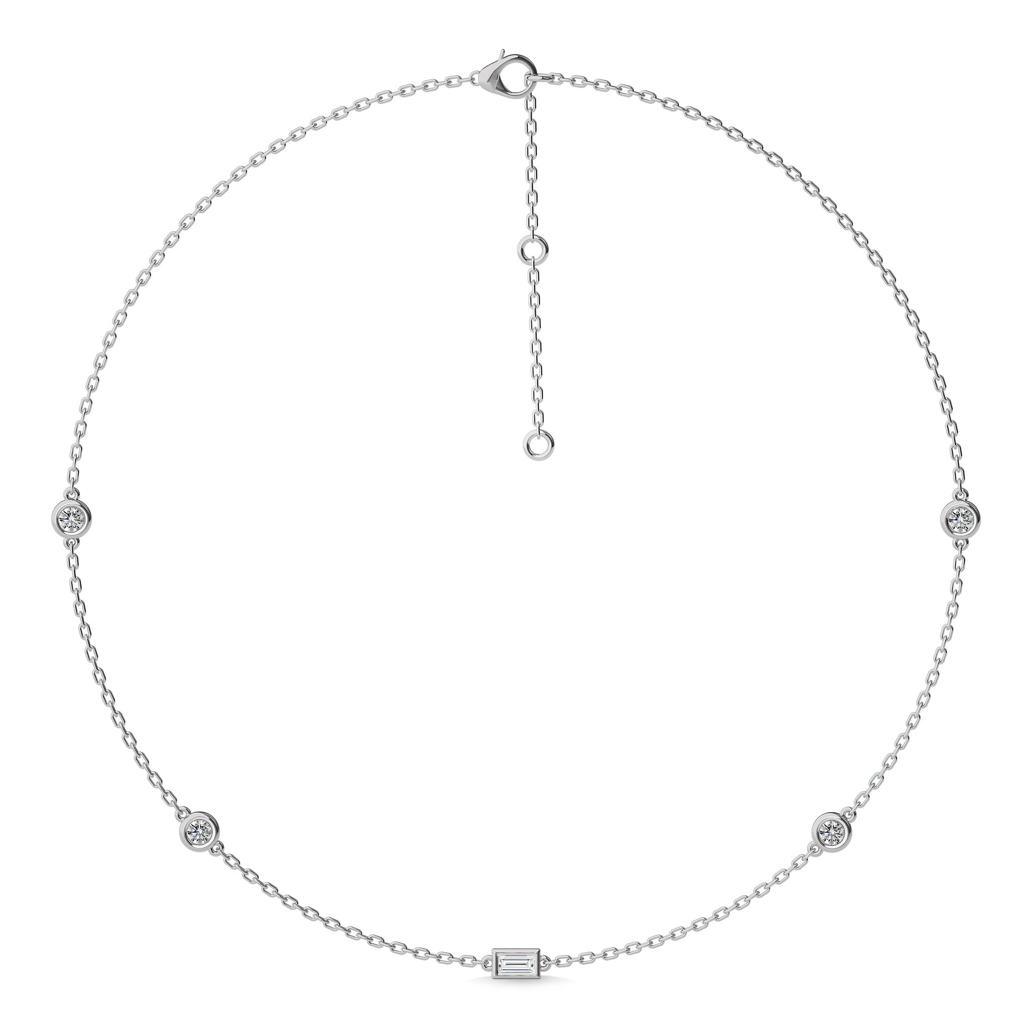 Savor the elegance of our Zenith Brilliance Fusion Necklace, a stunning blend of baguette and round Lab Created diamonds totaling 1 carat of DEF/SI quality,this necklace adds a touch of glamour to any outfit.The meticulous bezel setting of each diamond gives this necklace a contemporary elegance that enhances any attire
