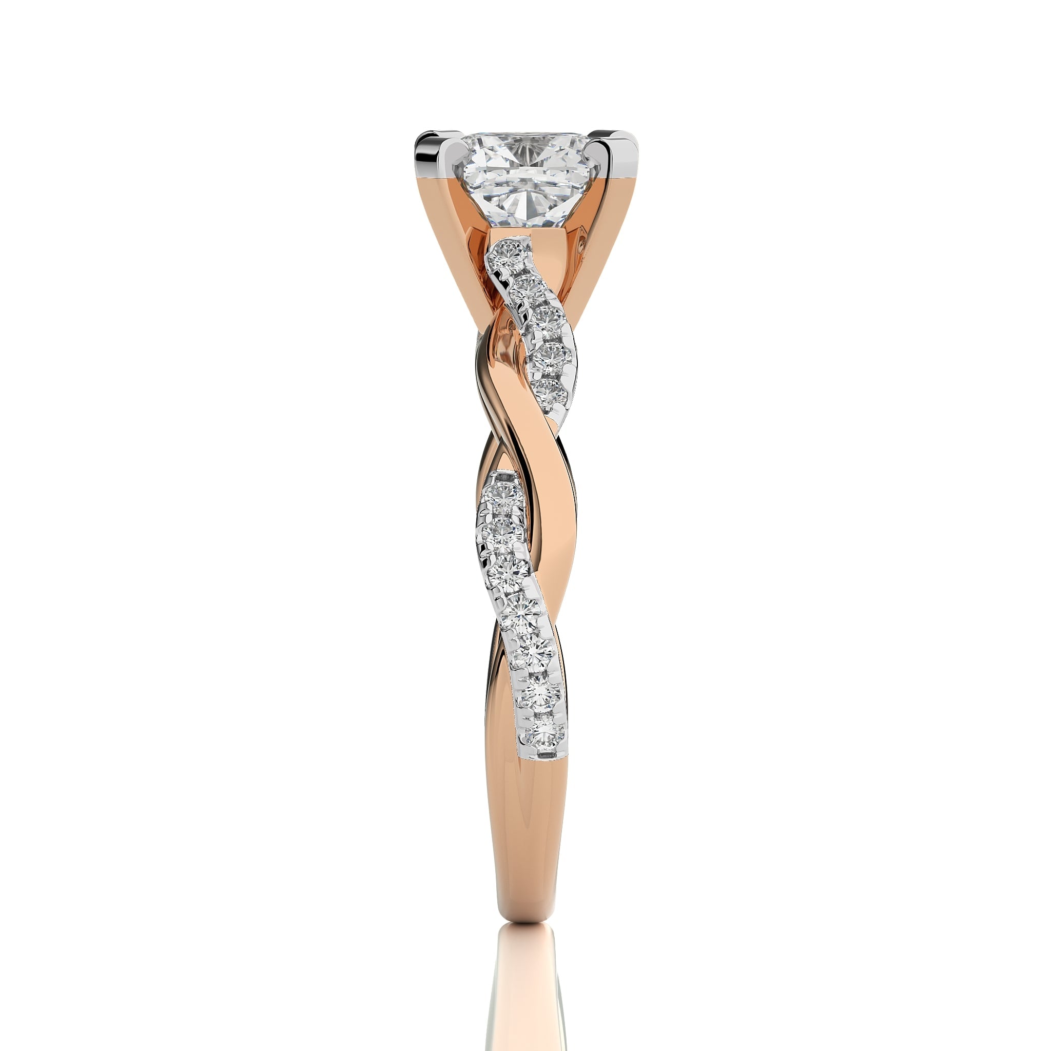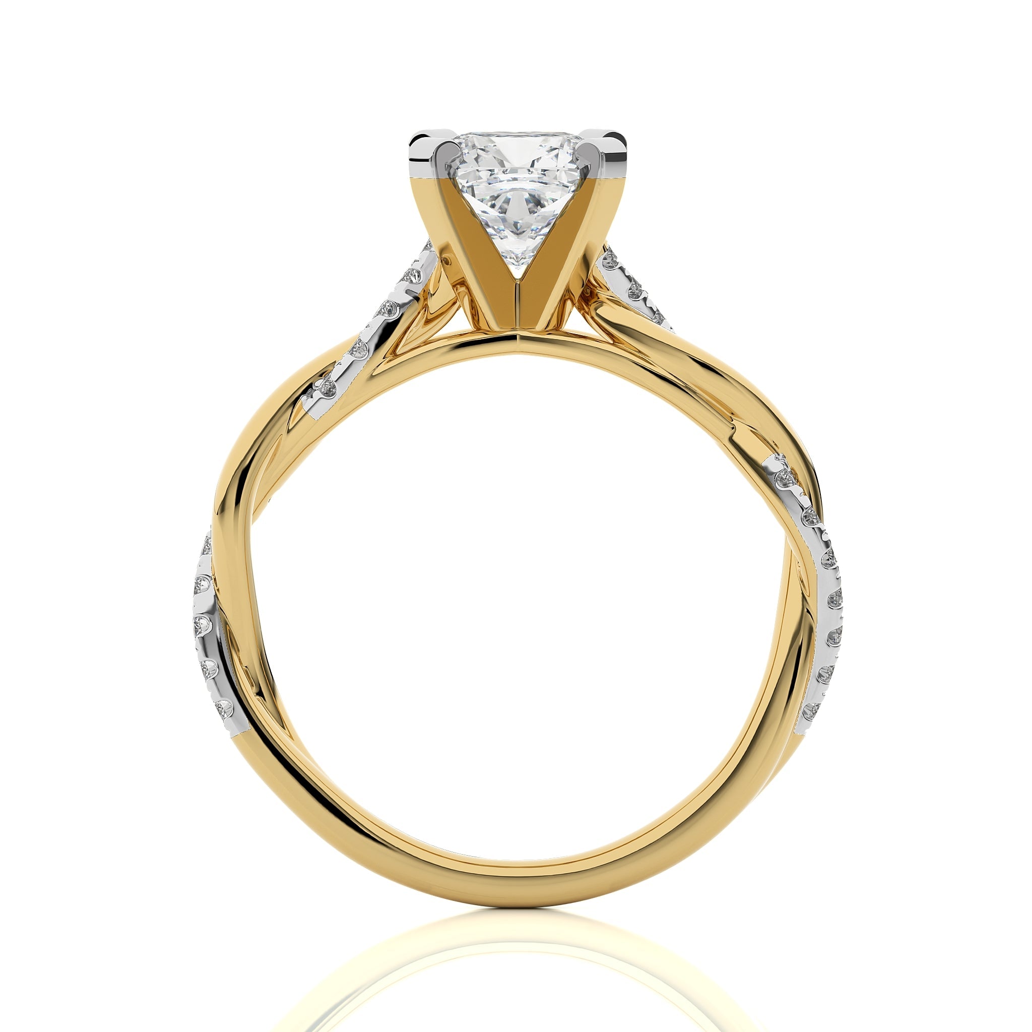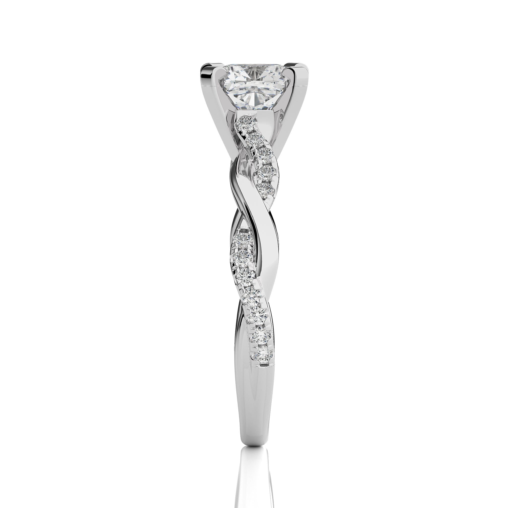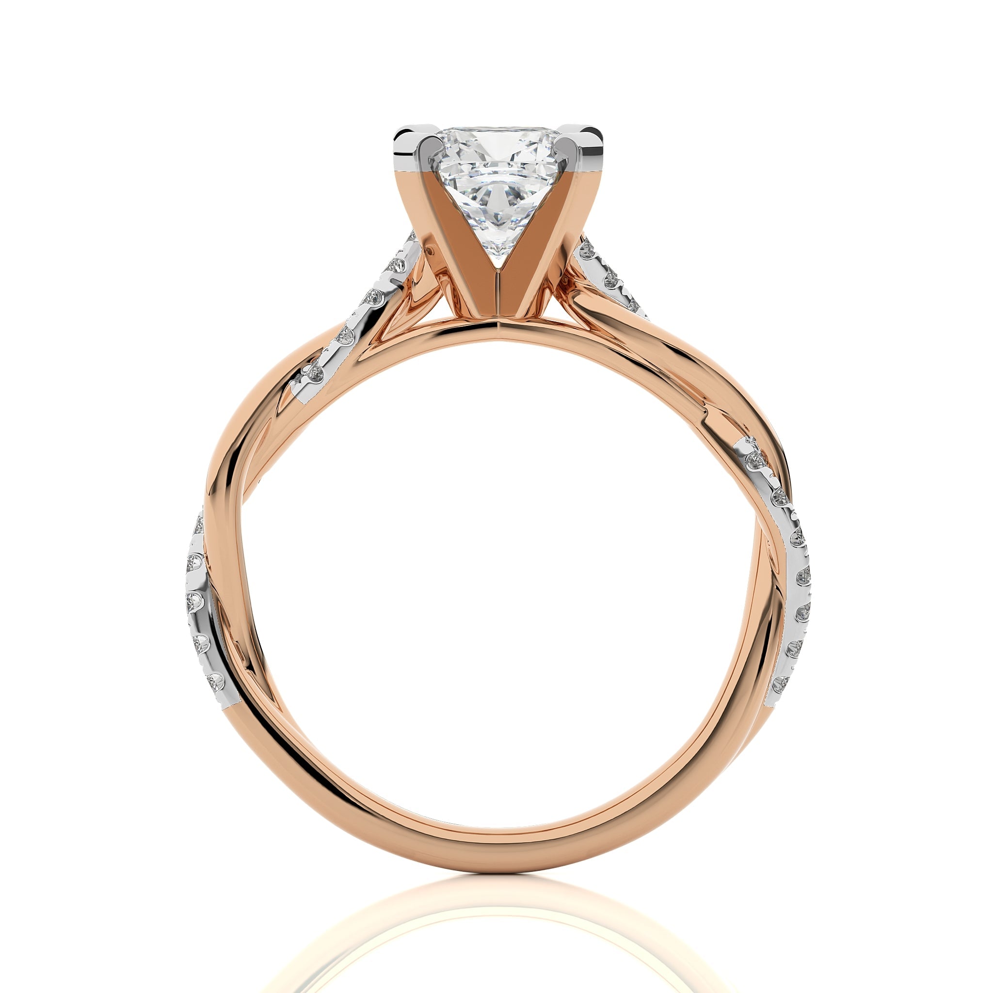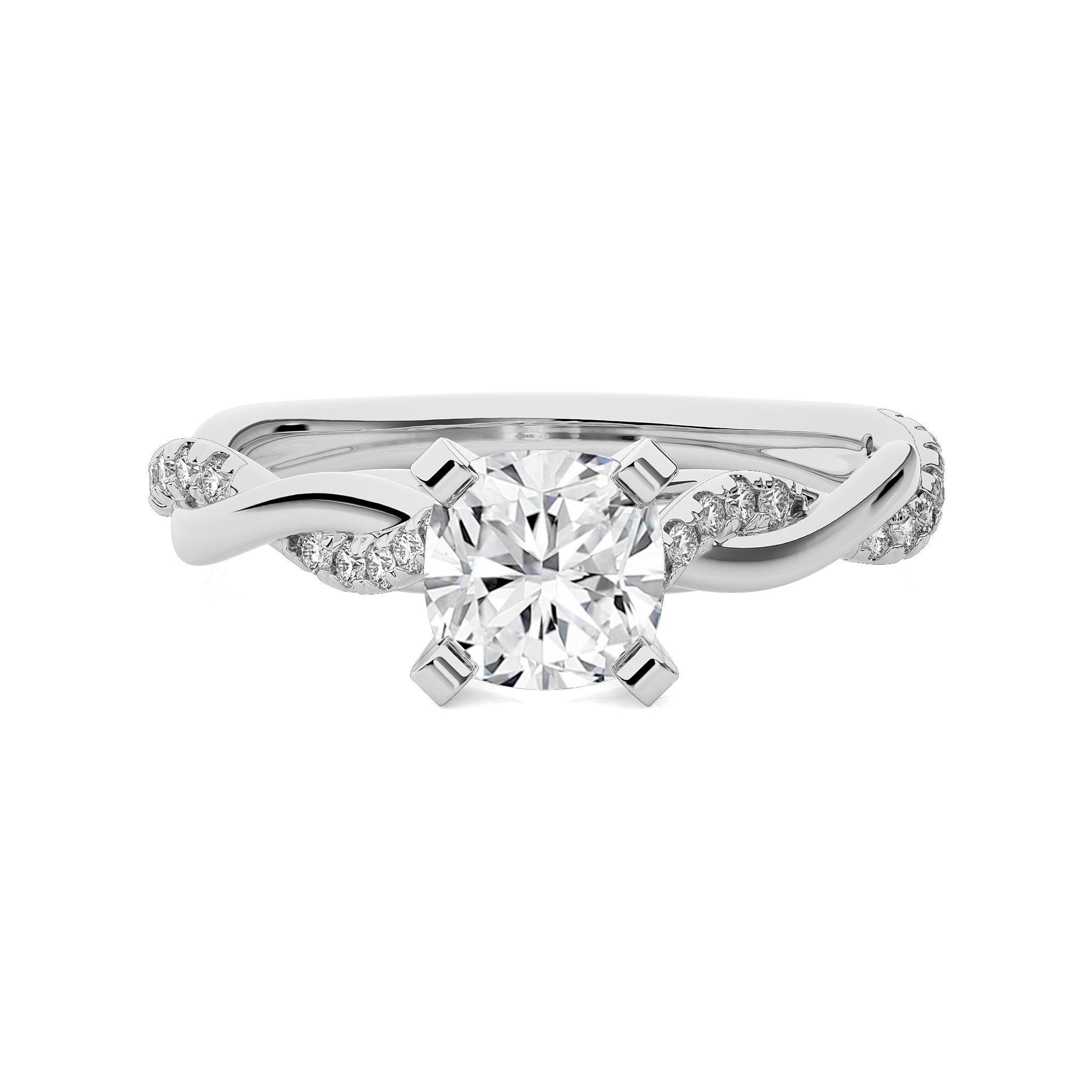 Honor timeless grace with this exquisite ring, showcasing a cushion cut available in lab created and natural diamonds set in a micro split and prong setting, the bypass design elegantly intertwines, symbolizing your unique bond. Let this stunning piece be a reflection of your eternal love