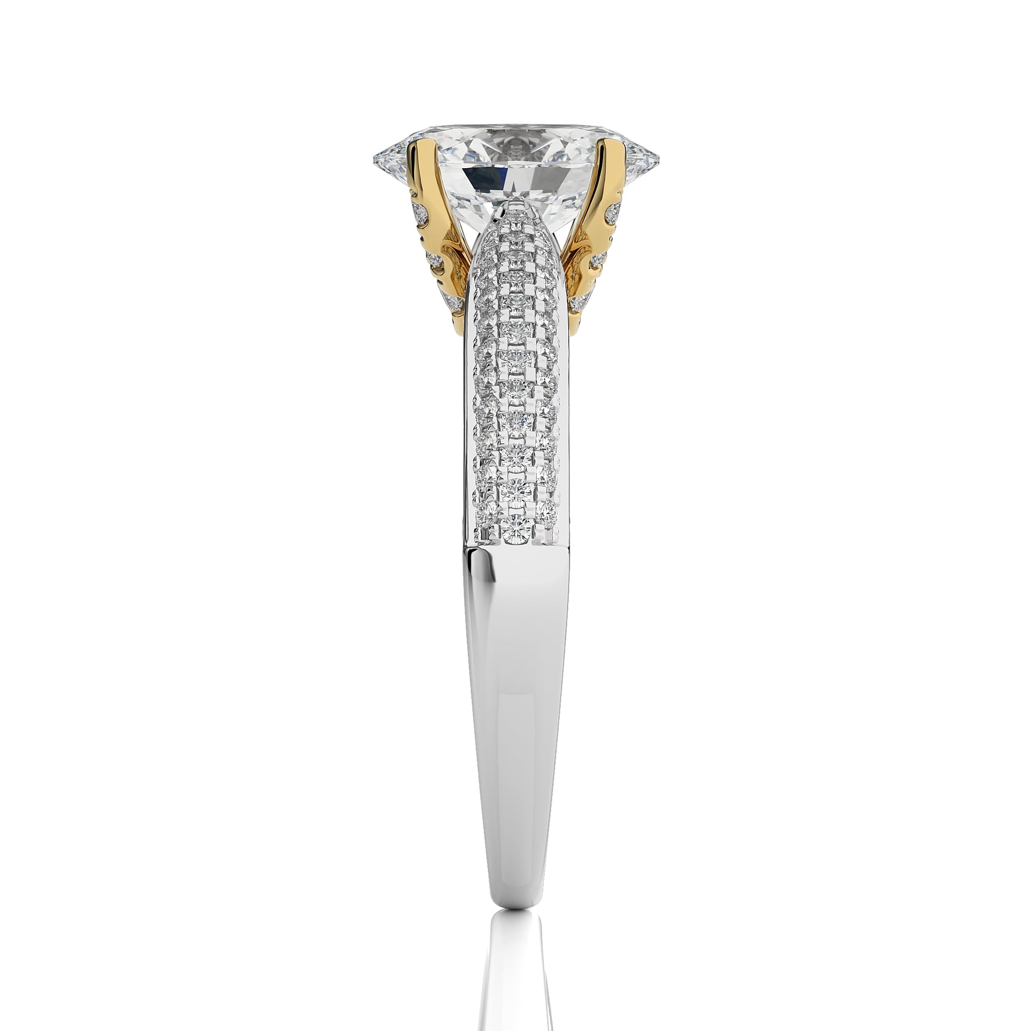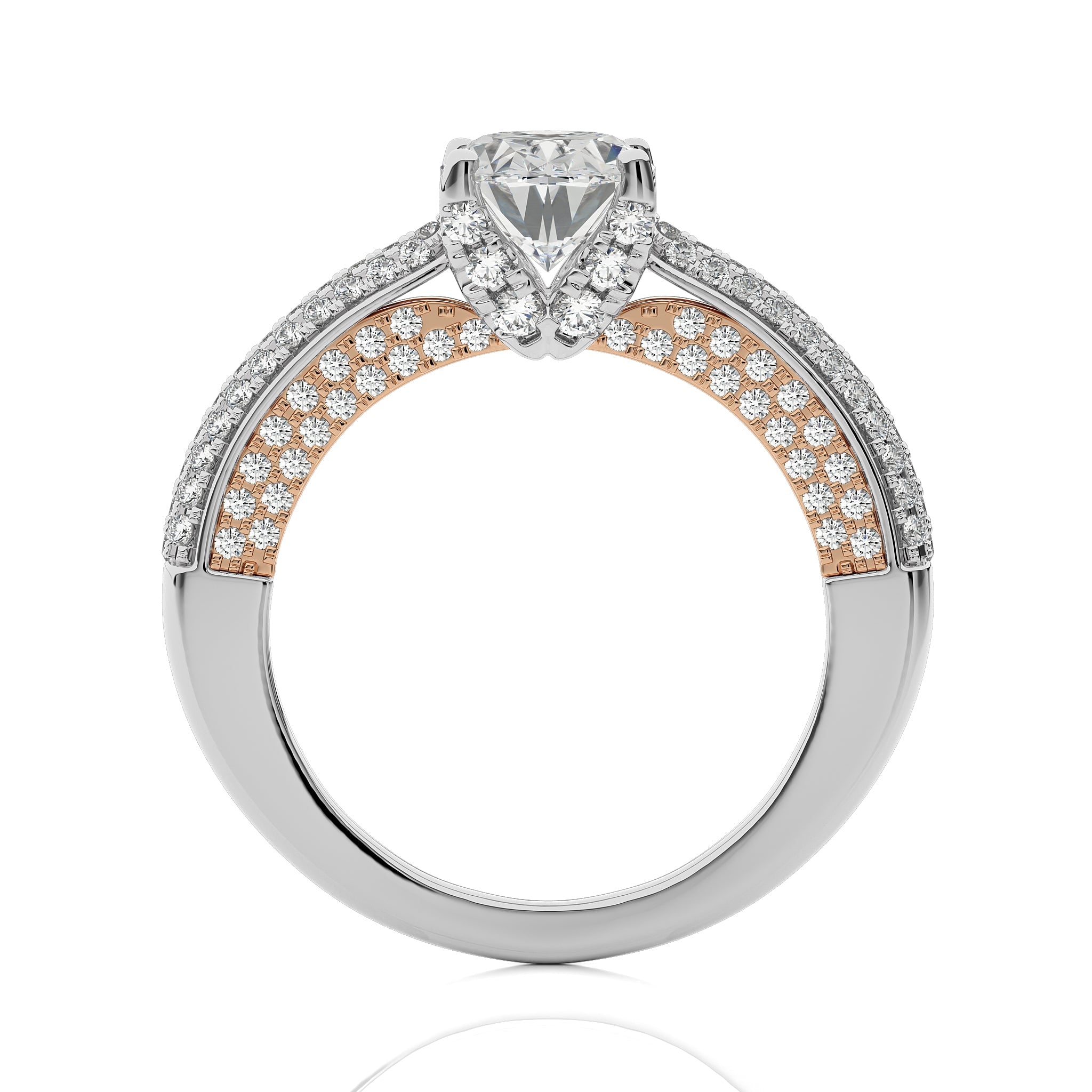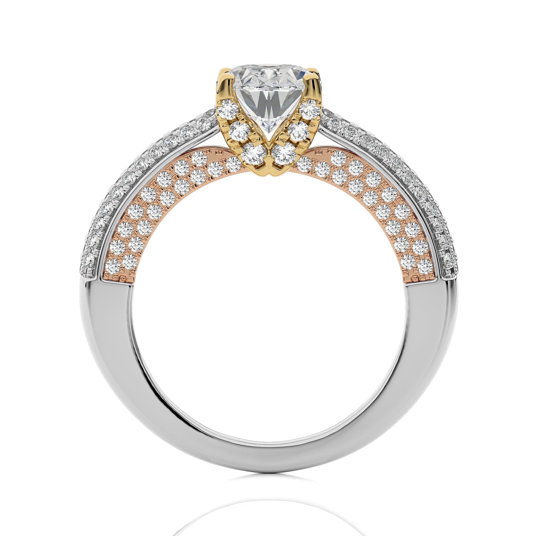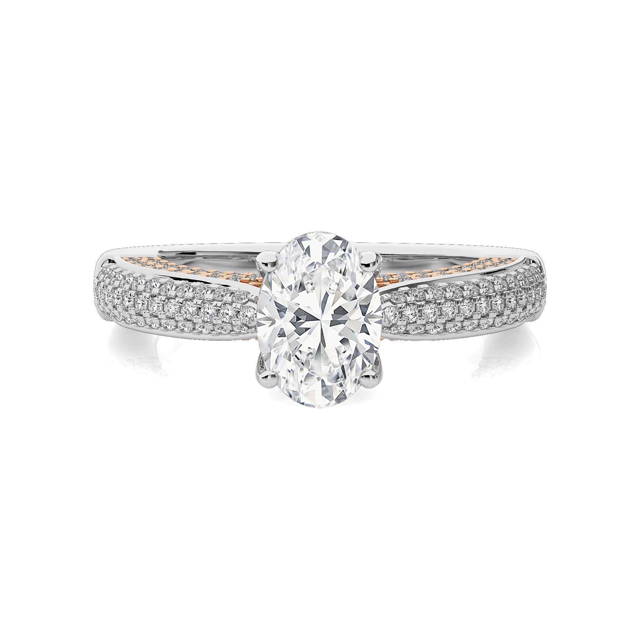 A celestial masterpiece, this three tone engagement ring showcases a oval cut available in lab-created and natural diamonds crafted in micro split and prong settings, adds a distinctive flair. This ring symbolizes the unity of your love, shining with a brilliance that reflects the merging of two hearts into one