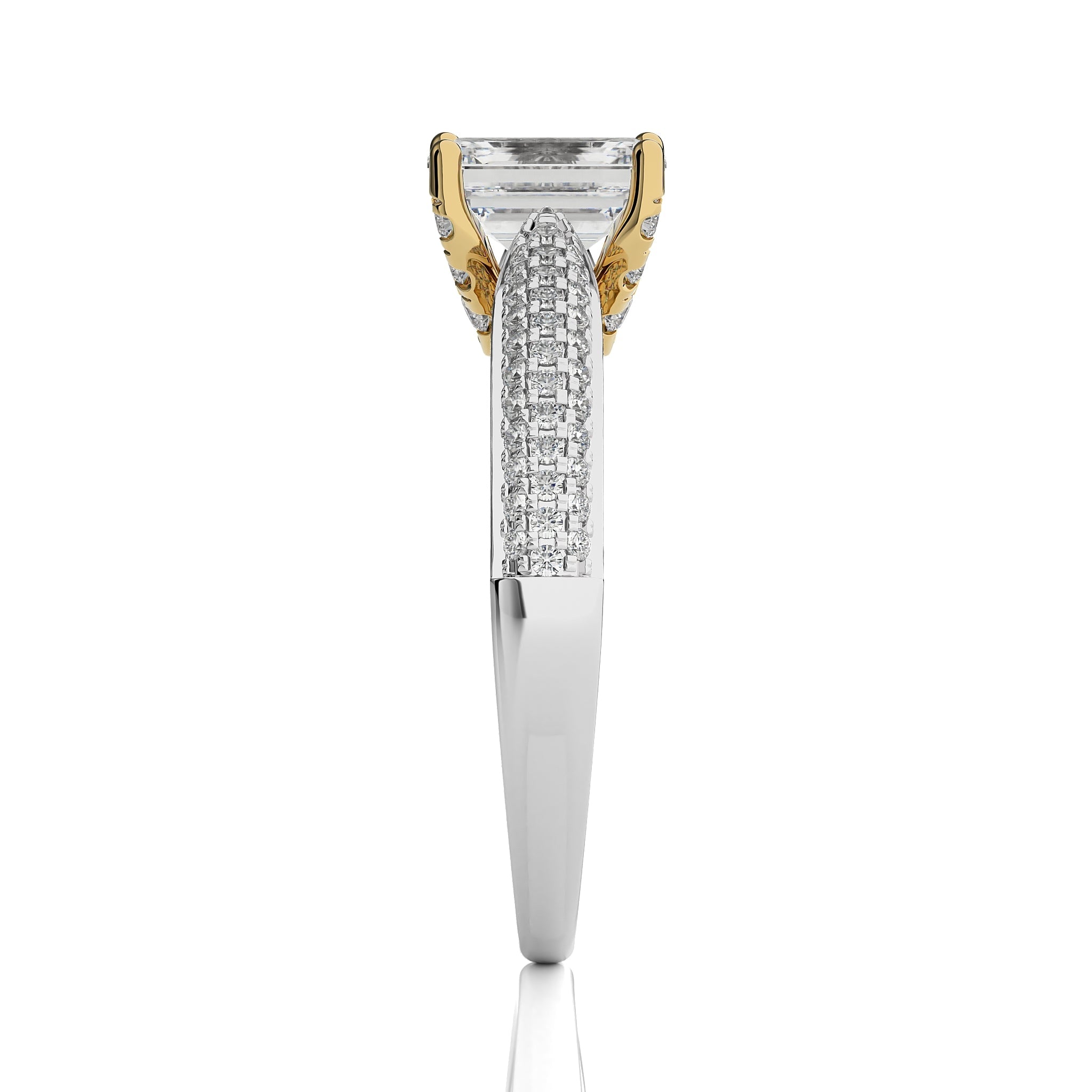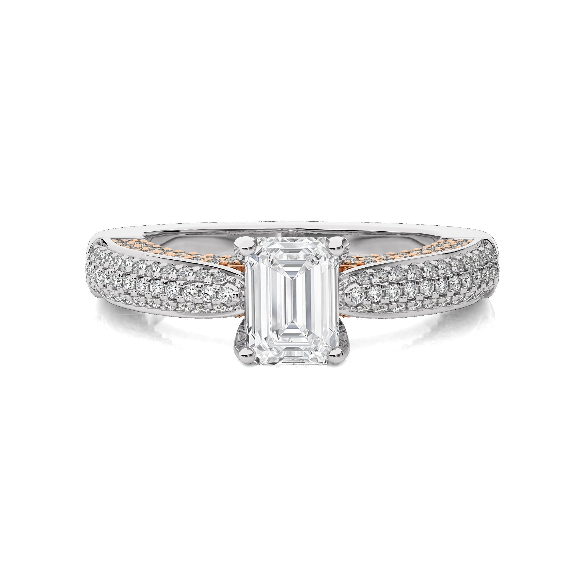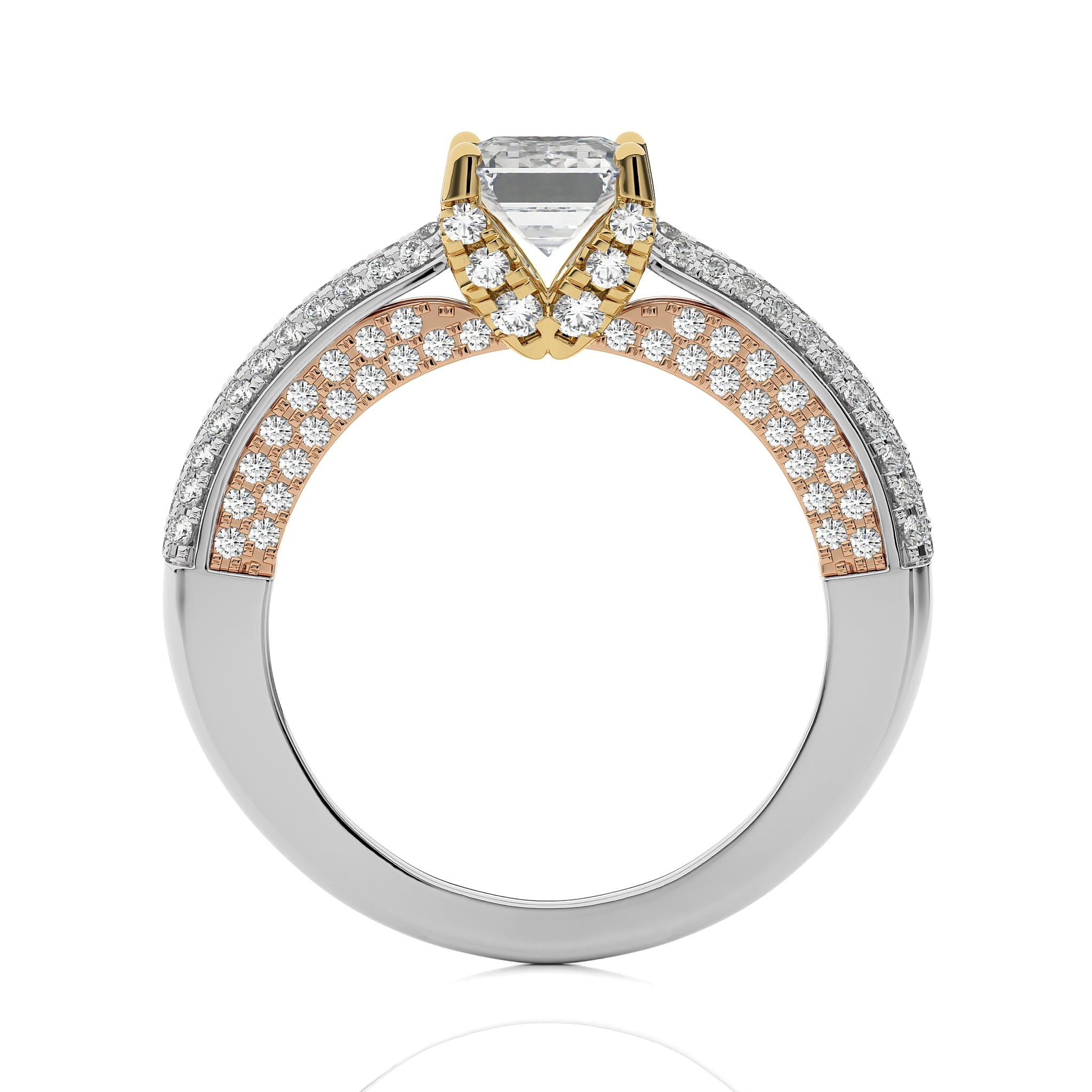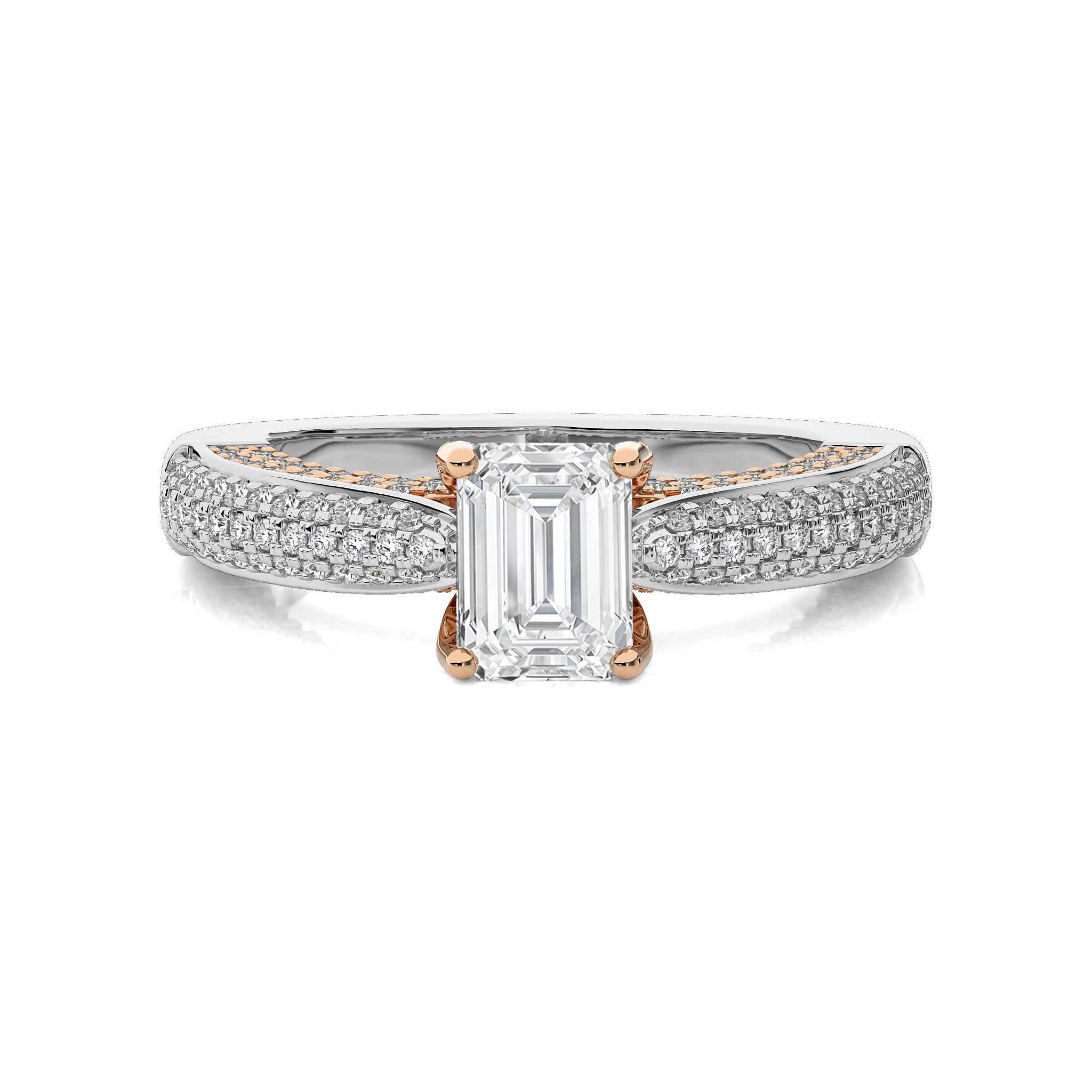 A celestial masterpiece, this three tone engagement ring showcases a emerald cut available in lab-created and natural diamonds crafted in micro split and prong settings, adds a distinctive flair. This ring symbolizes the unity of your love, shining with a brilliance that reflects the merging of two hearts into one