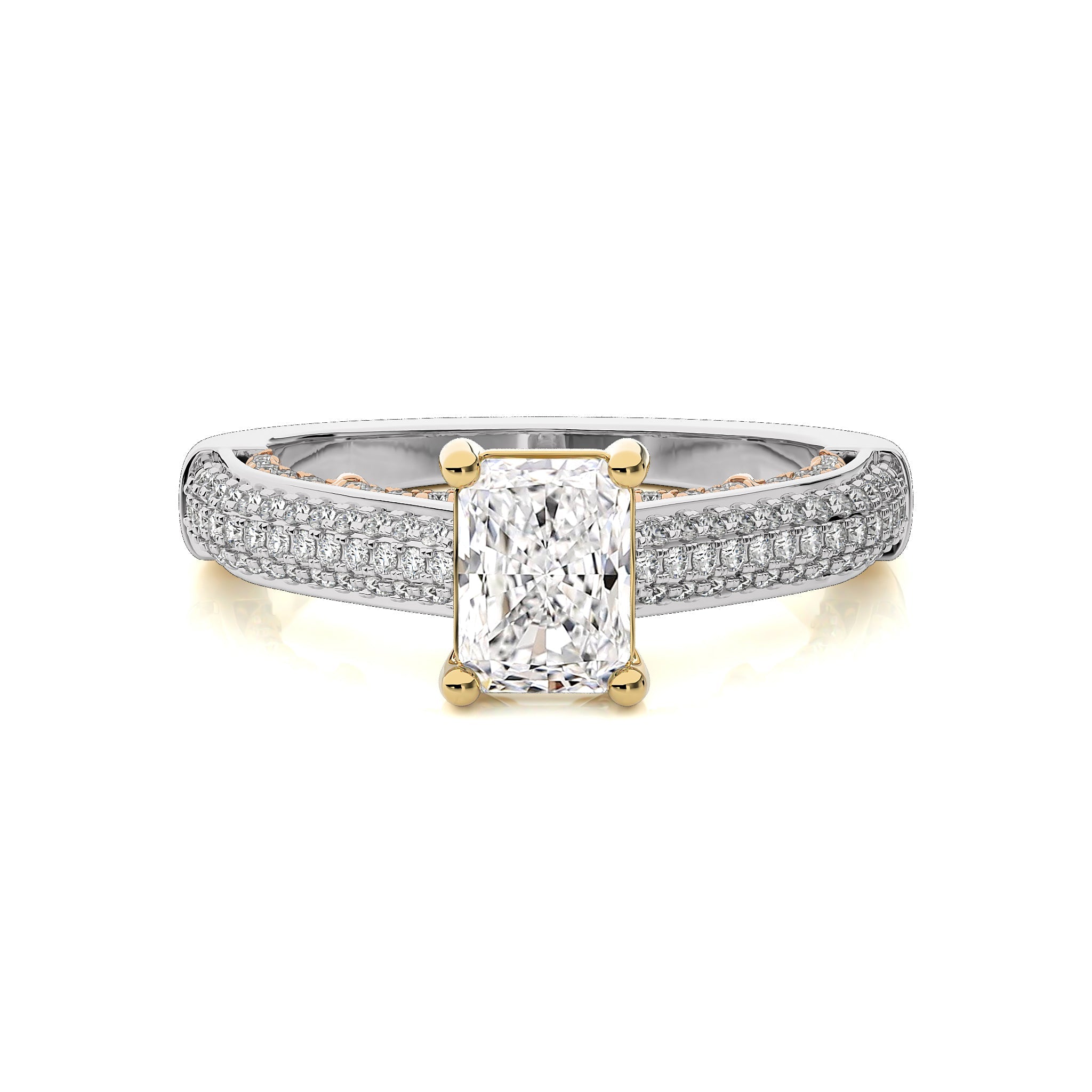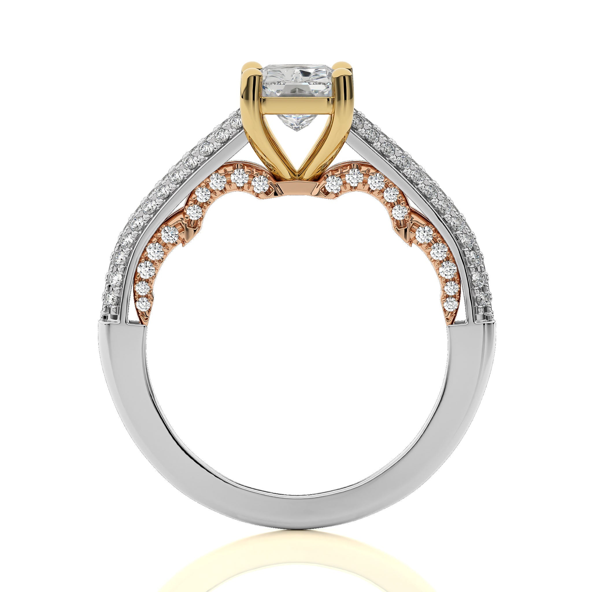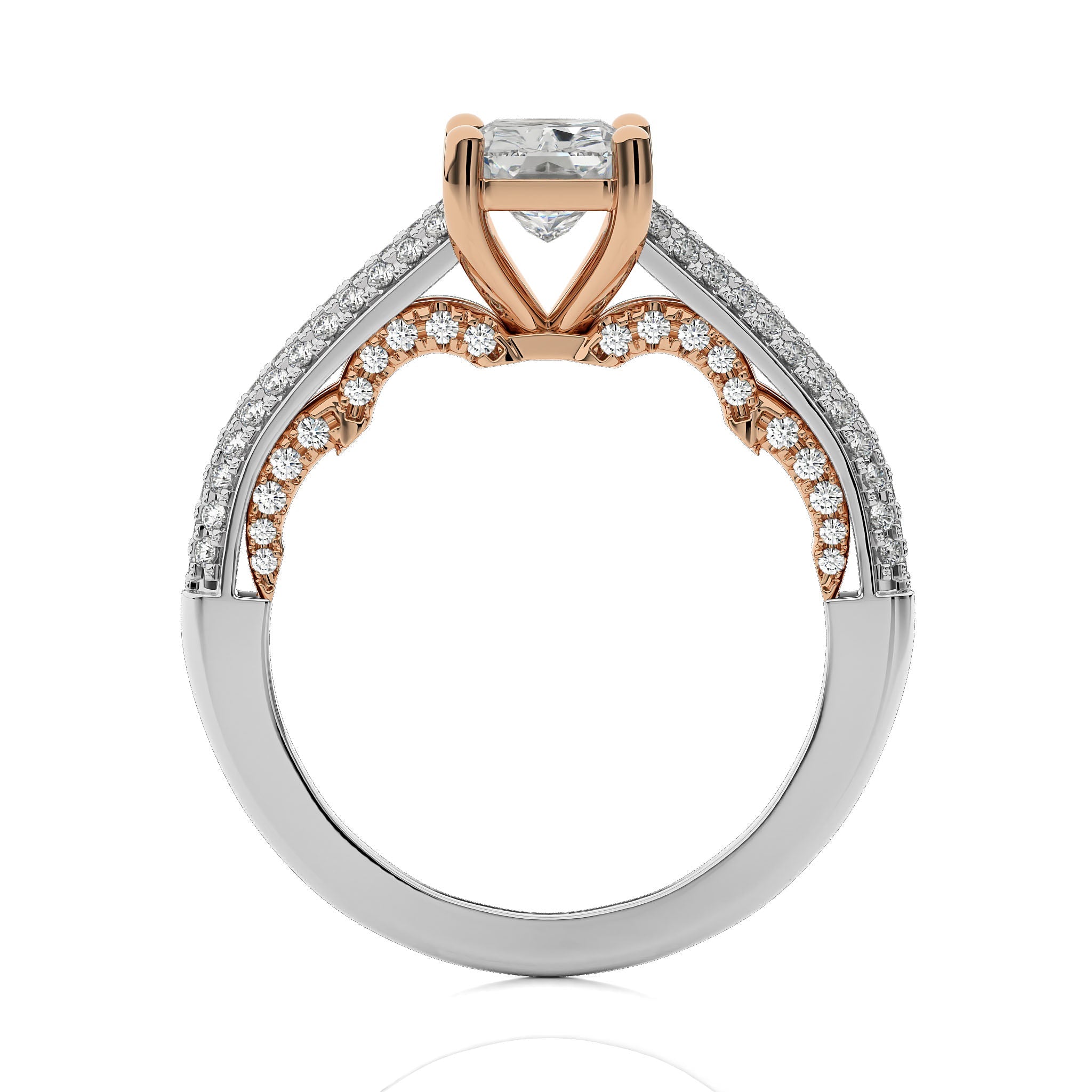 This three tone emerald cut breathtaking ring available in lab created and natural diamonds in a micro split setting, this ring radiates an enchanting brilliance. The Lunar Embrace symbolizes the merging of two hearts, capturing the luminous glow of a love that transcends time