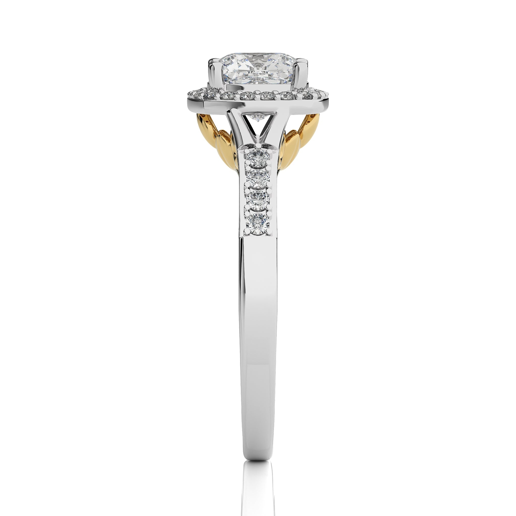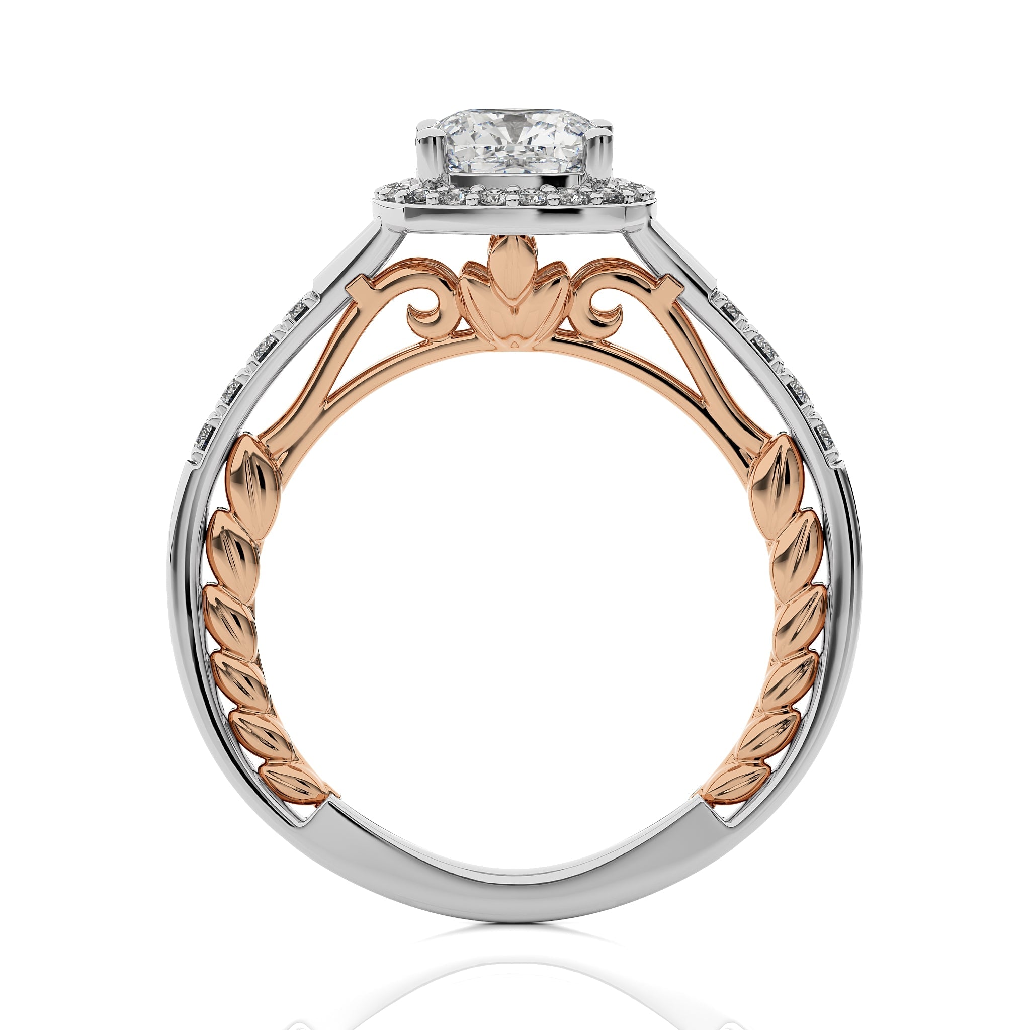 Experience timeless elegance with this split bliss cushion cut available in lab created and natural diamond halo engagement Ring.This two tone design crafted in a prong setting.Refresh your mood with wearing this stunning ring on special occasions