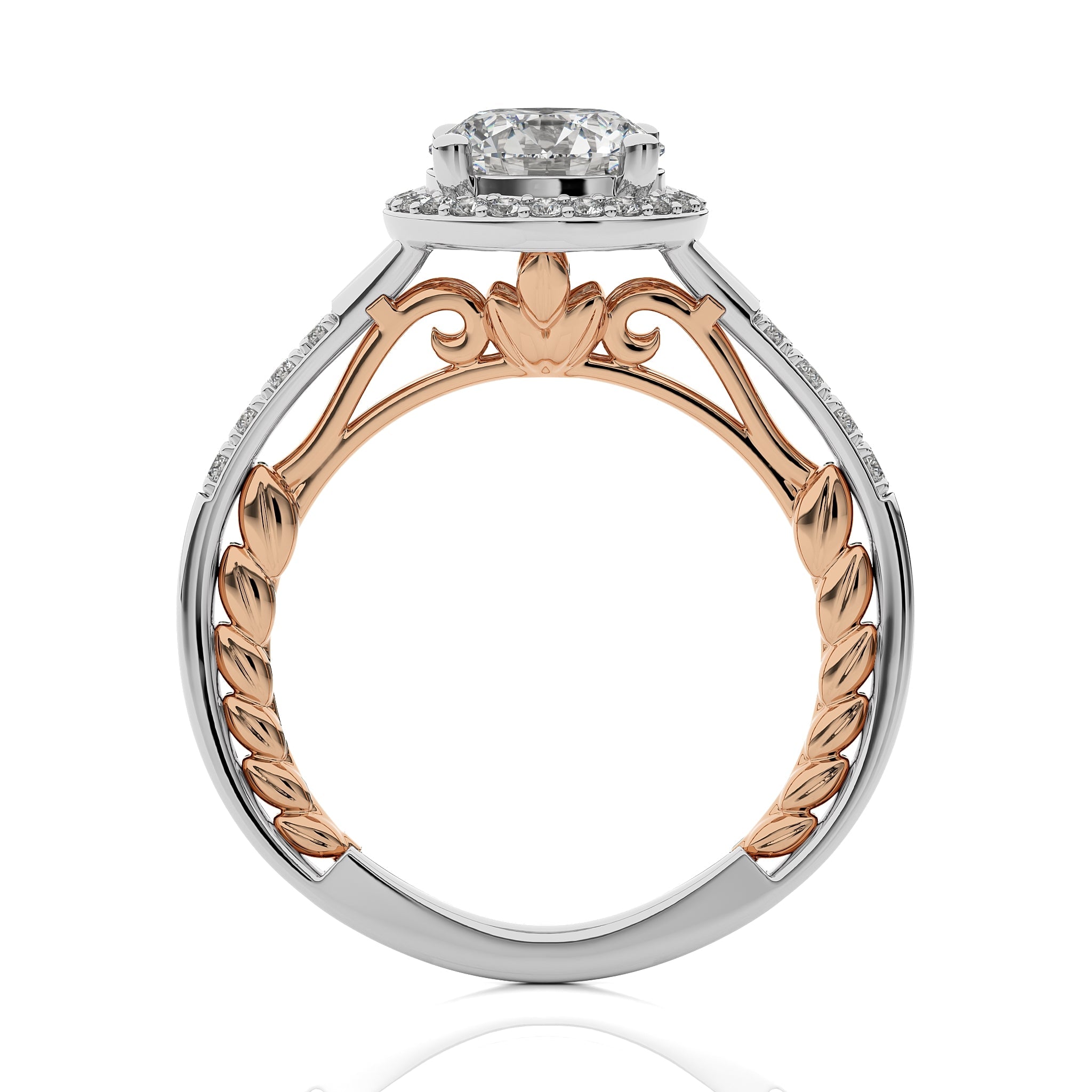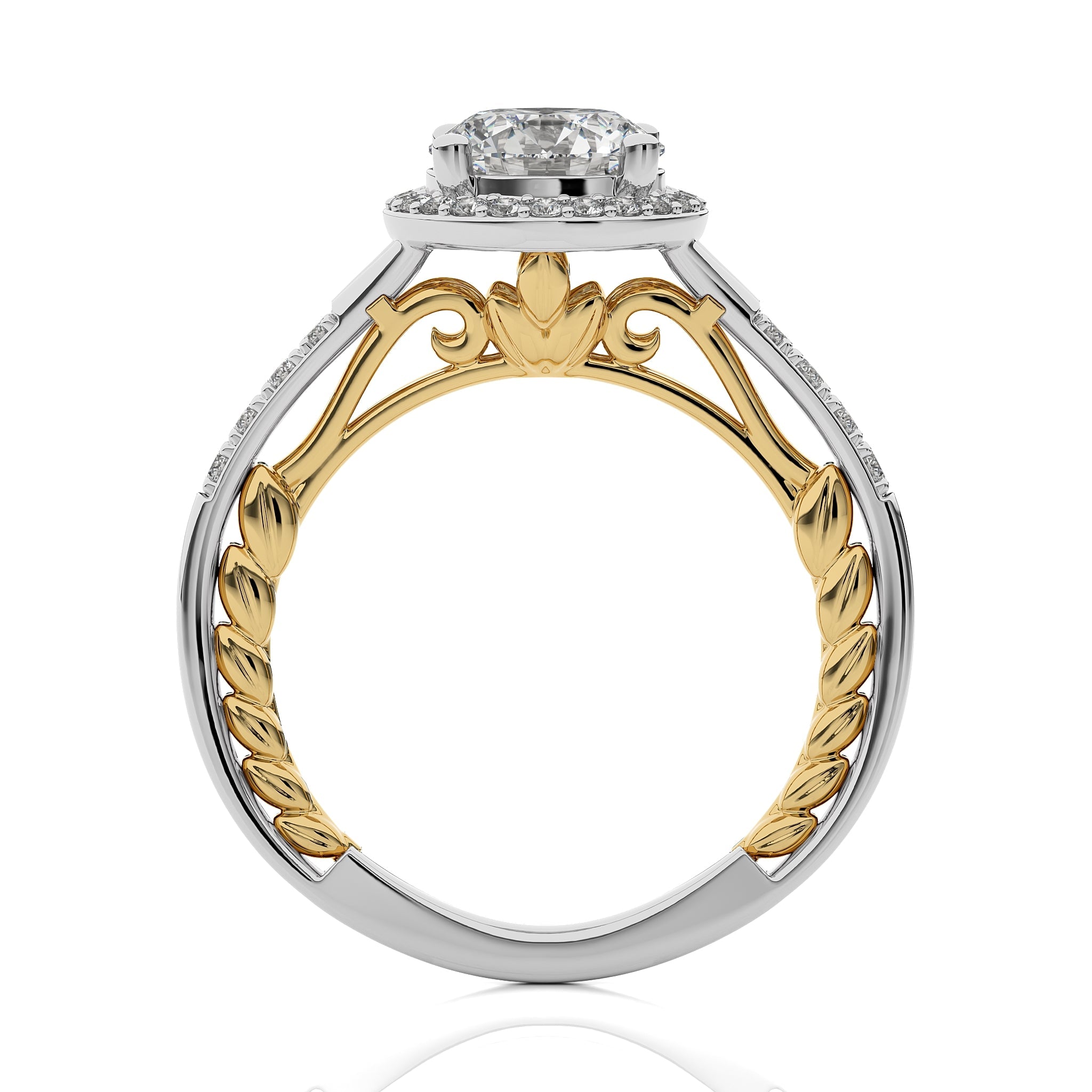 Experience timeless elegance with this split bliss round cut available in lab created and natural diamond halo engagement Ring.This two tone design crafted in a prong setting.Refresh your mood with wearing this stunning ring on special occasions