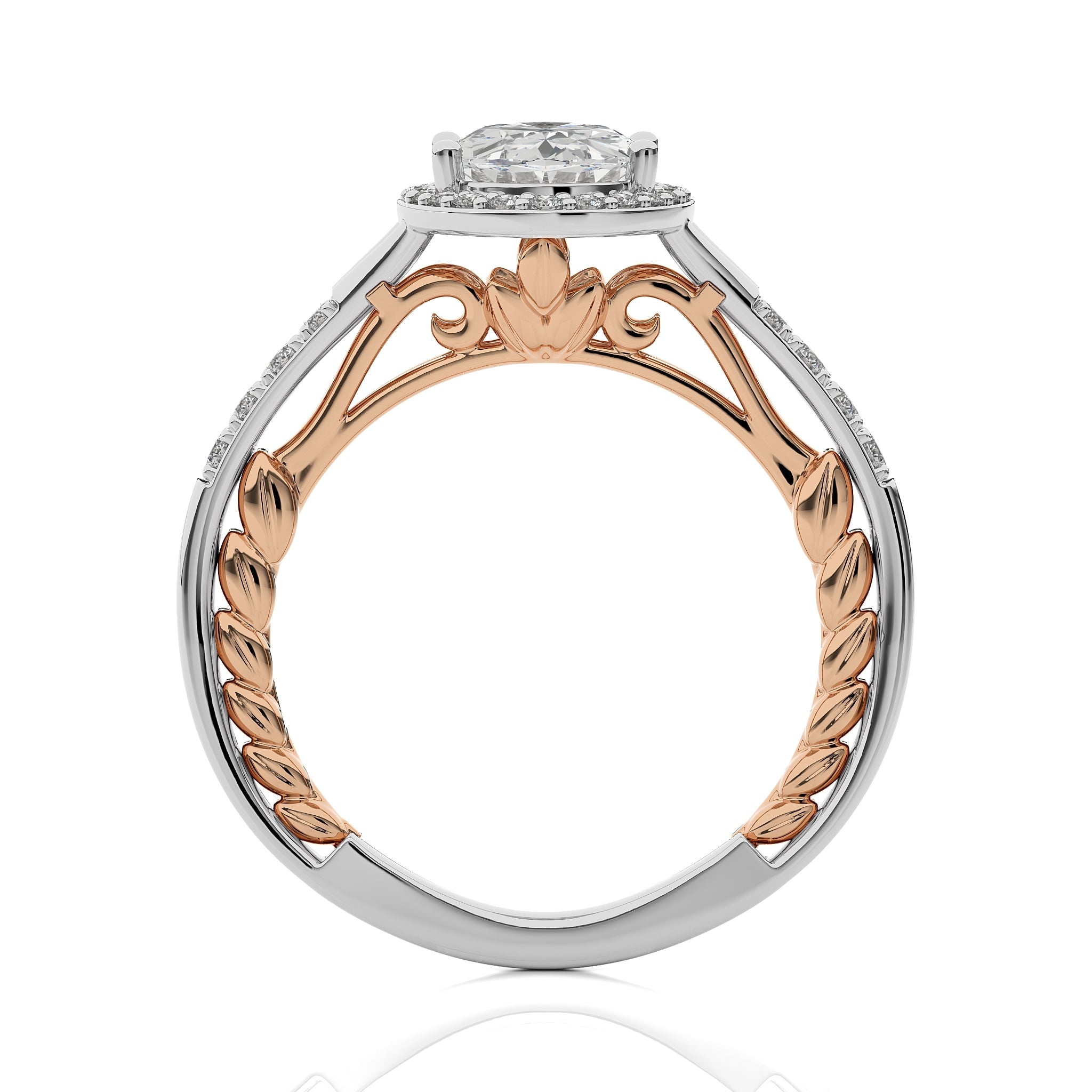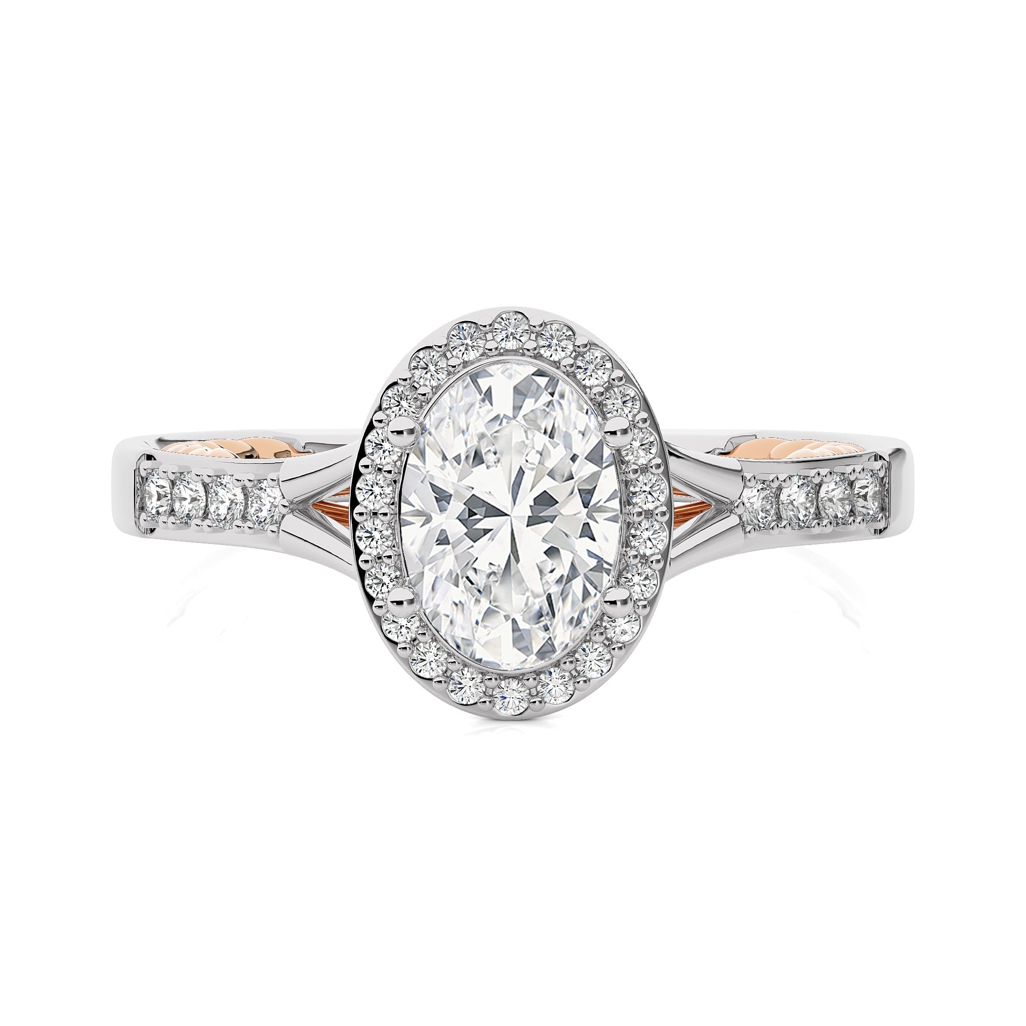 Experience timeless elegance with this split bliss oval cut available in lab created and natural diamond halo engagement Ring.This two tone design crafted in a prong setting.Refresh your mood with wearing this stunning ring on special occasions
