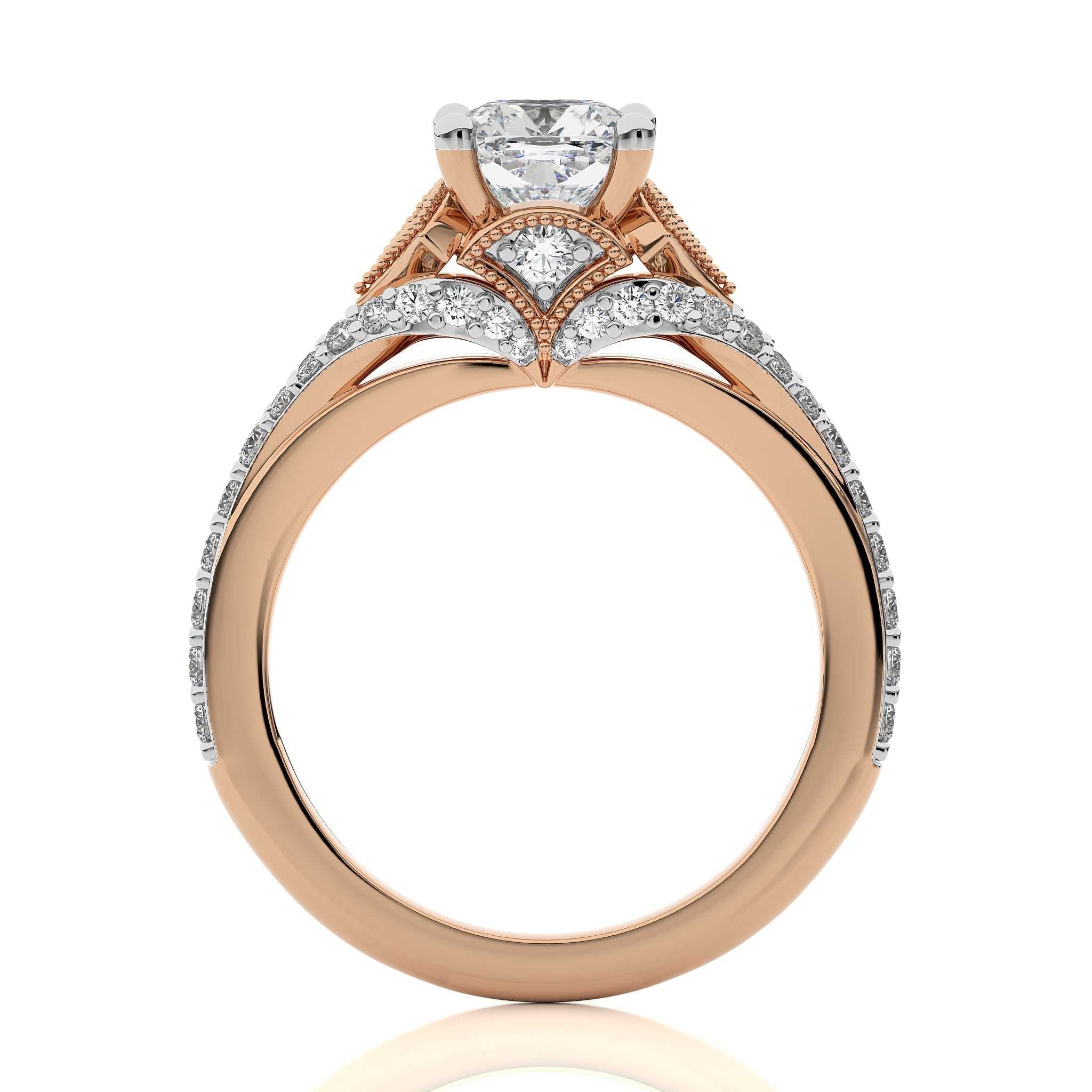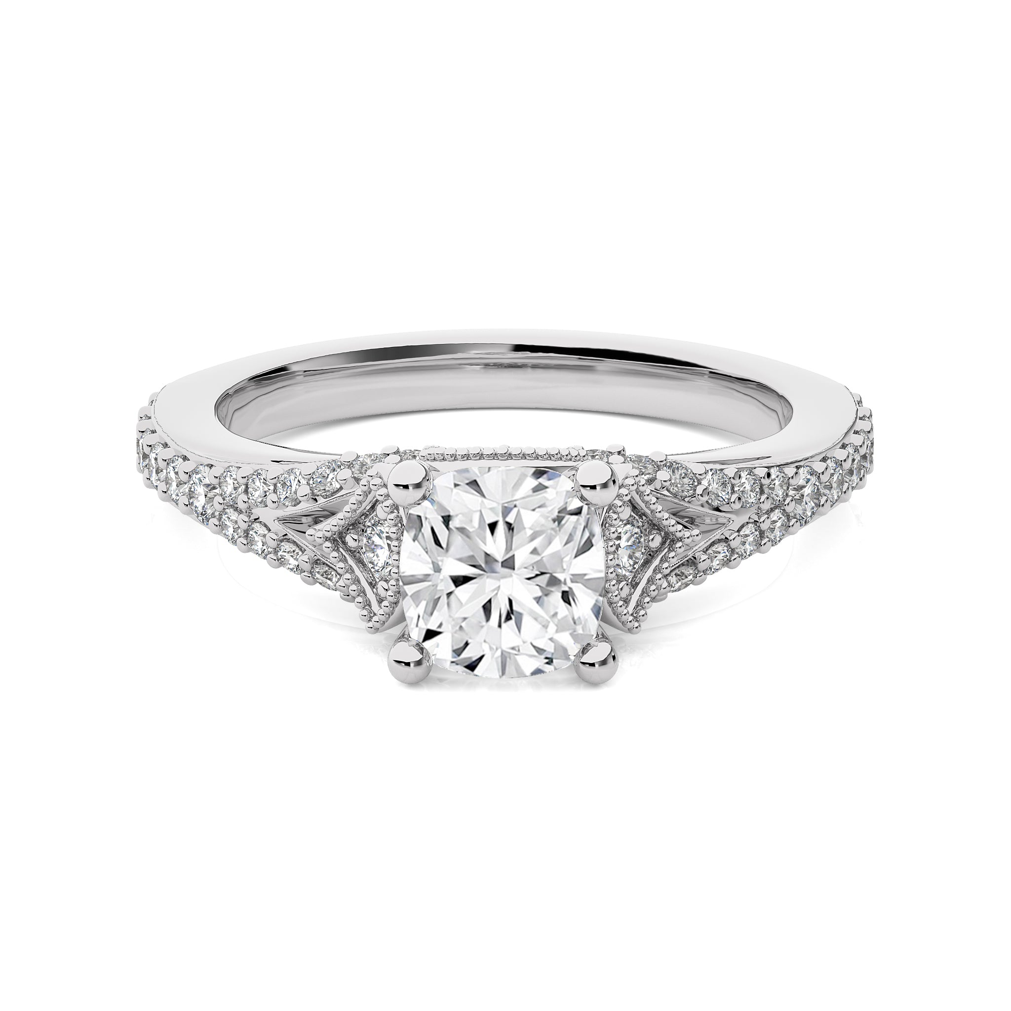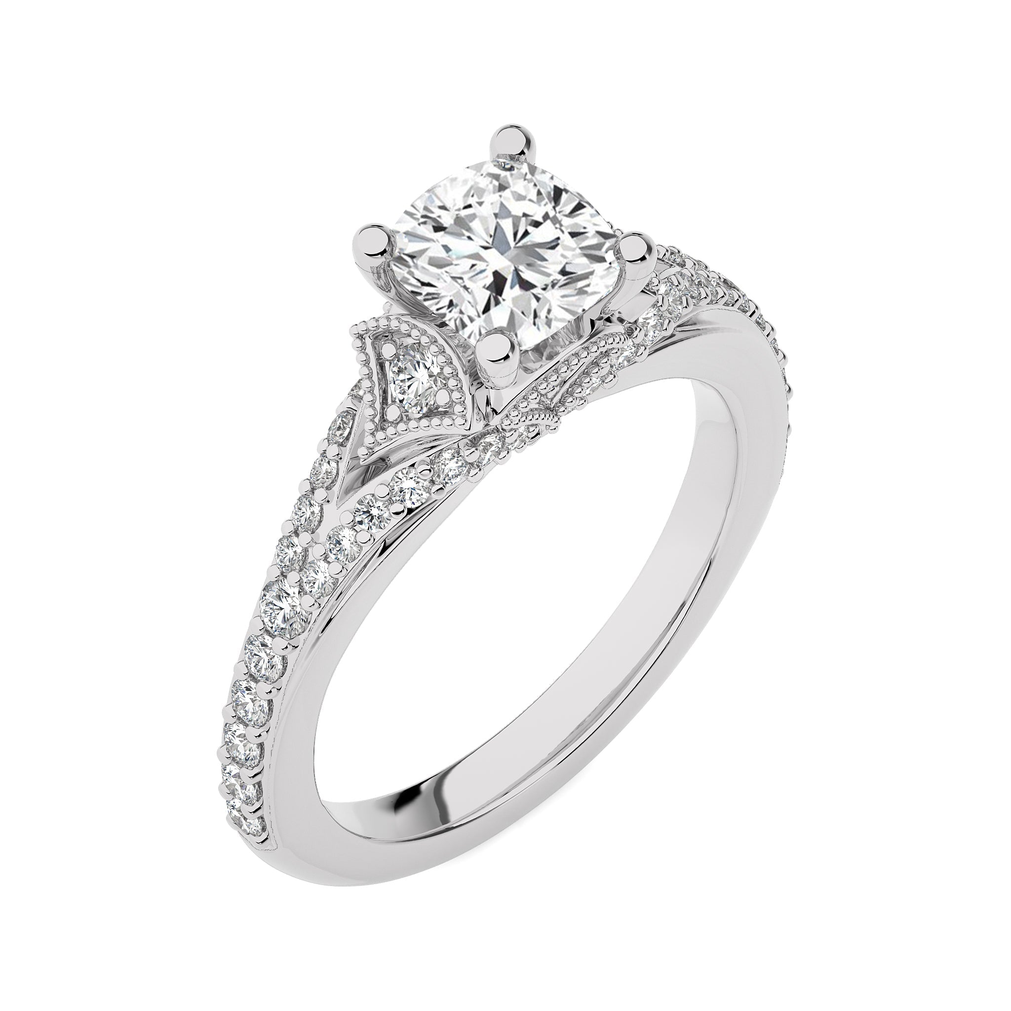 Behold the vortex of grace vintage split shank cushion cut available in lab created and natural diamond engagement ring set in both prong and pavé settings. Embrace the elegance of this ring as a symbol of your lasting love