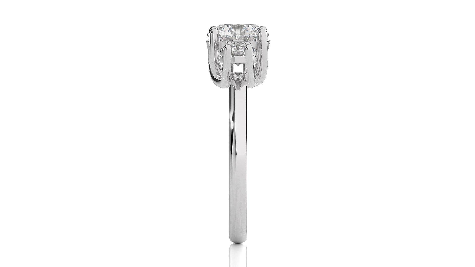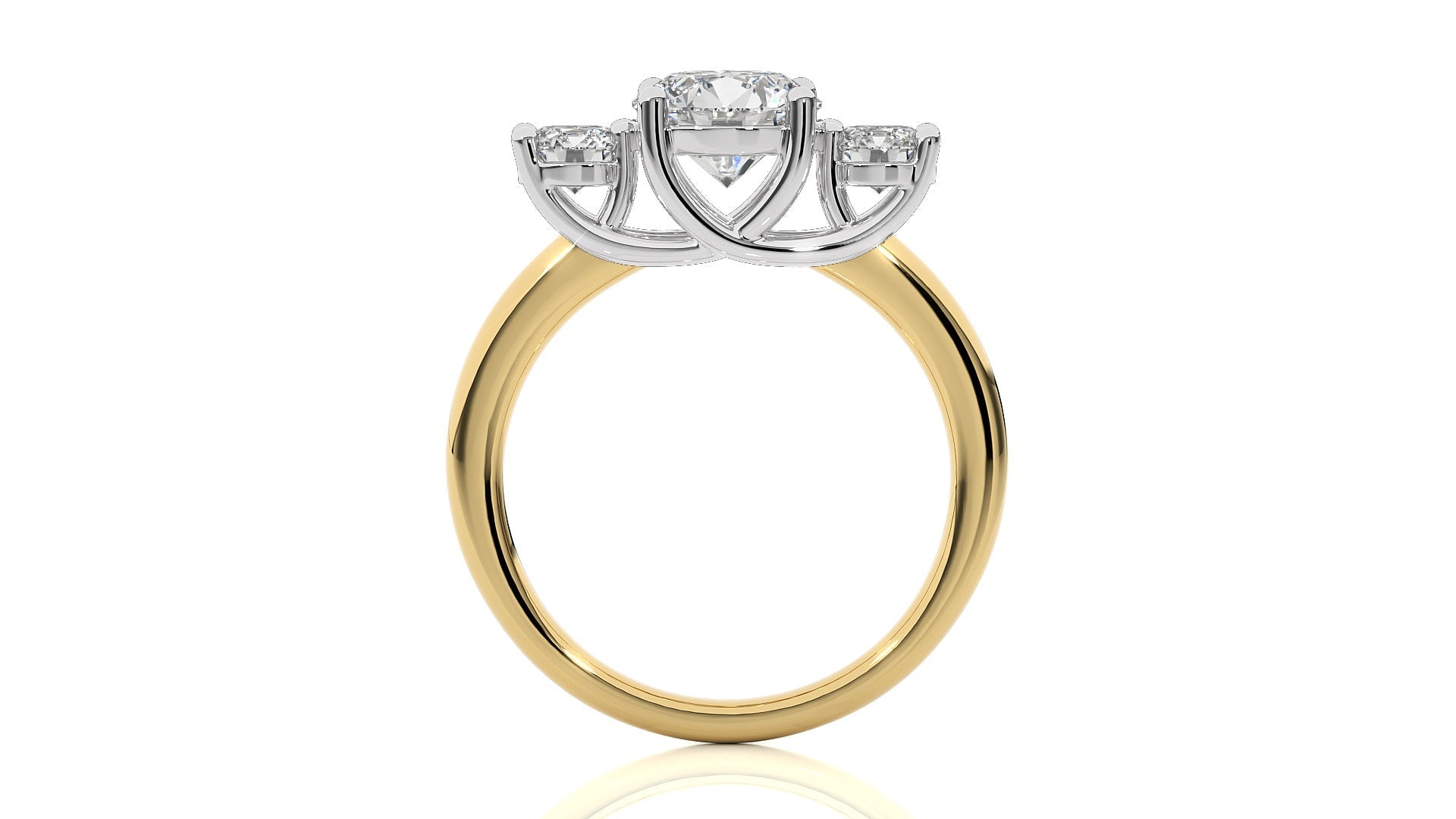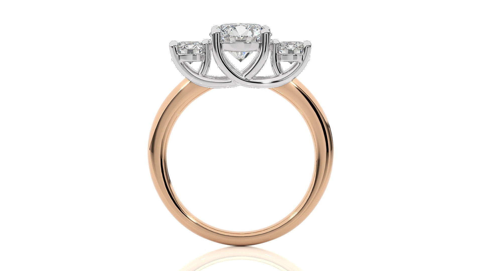Celebrate your love story with our Classic Three-Stone Diamond Engagement Ring. Meticulously set in a harmonious combination of pave and prong settings, this timeless piece symbolizes the past, present, and future of your enduring commitment.