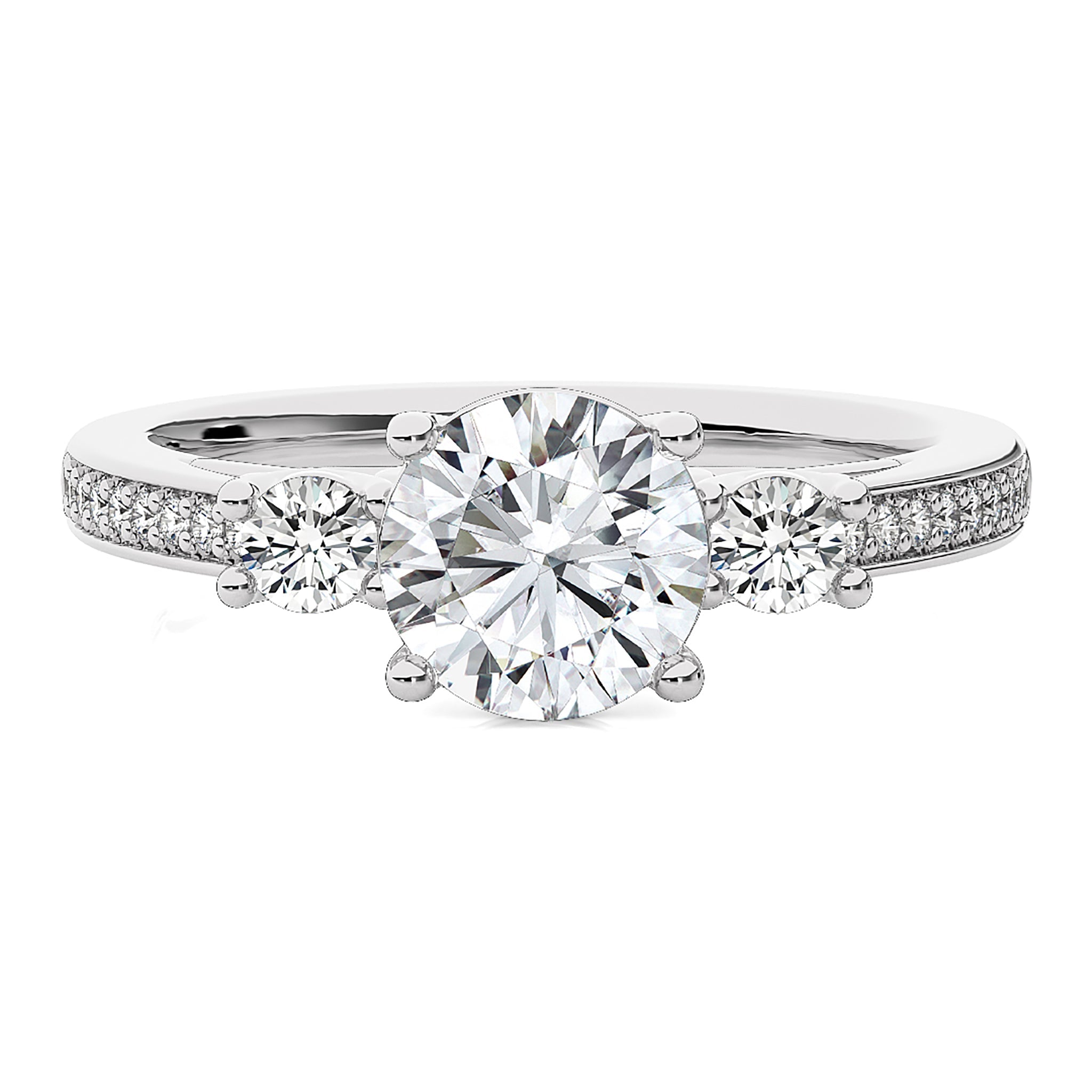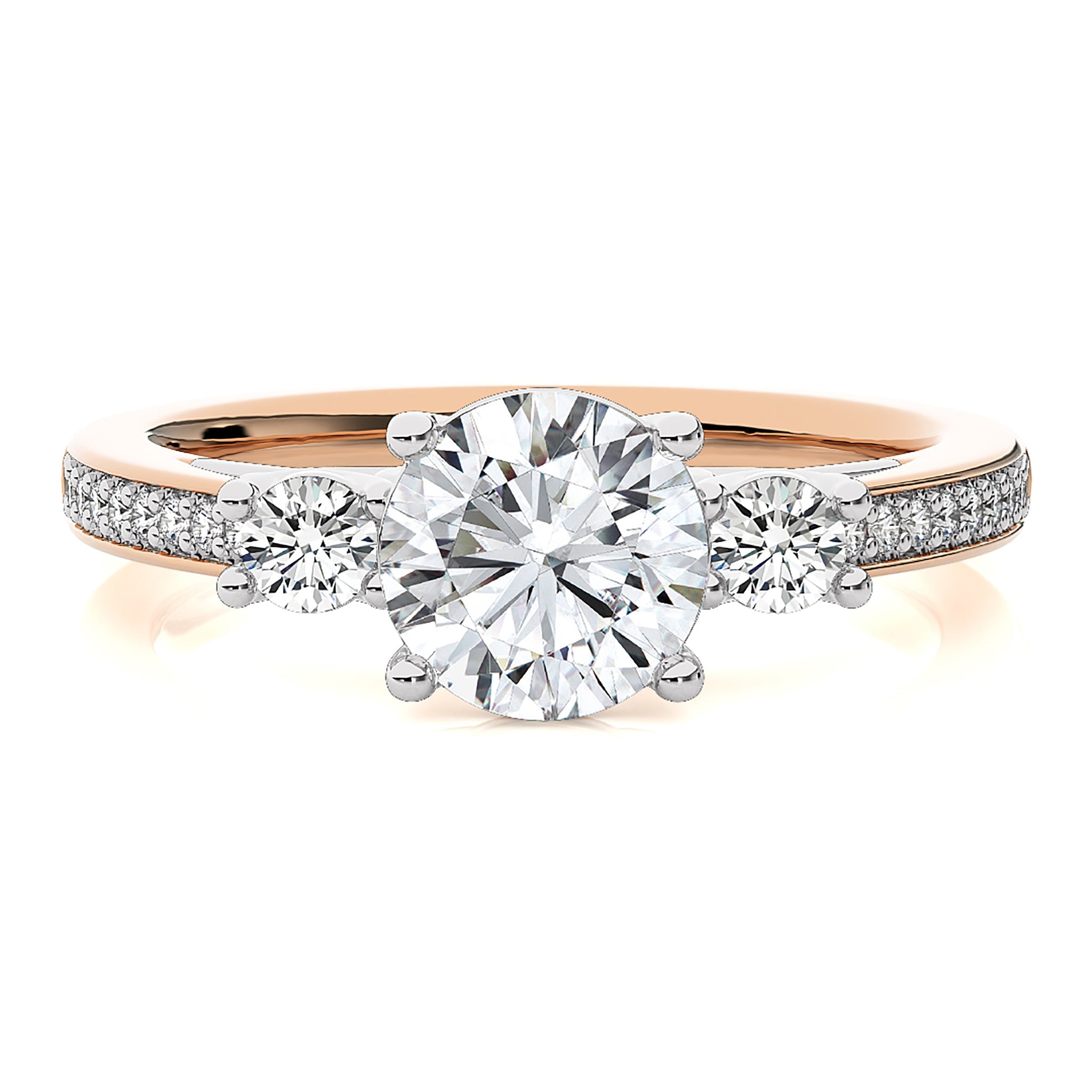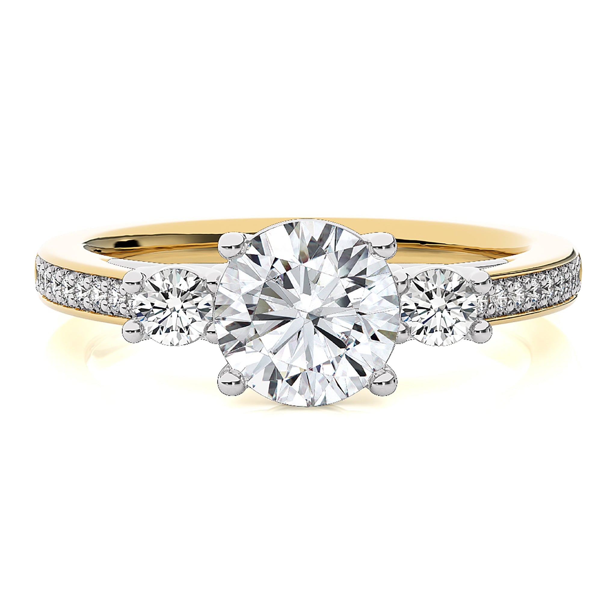 Celebrate your love story with our Classic Three-Stone Diamond Engagement Ring. Meticulously set in a harmonious combination of pave and prong settings, this timeless piece symbolizes the past, present, and future of your enduring commitment.
