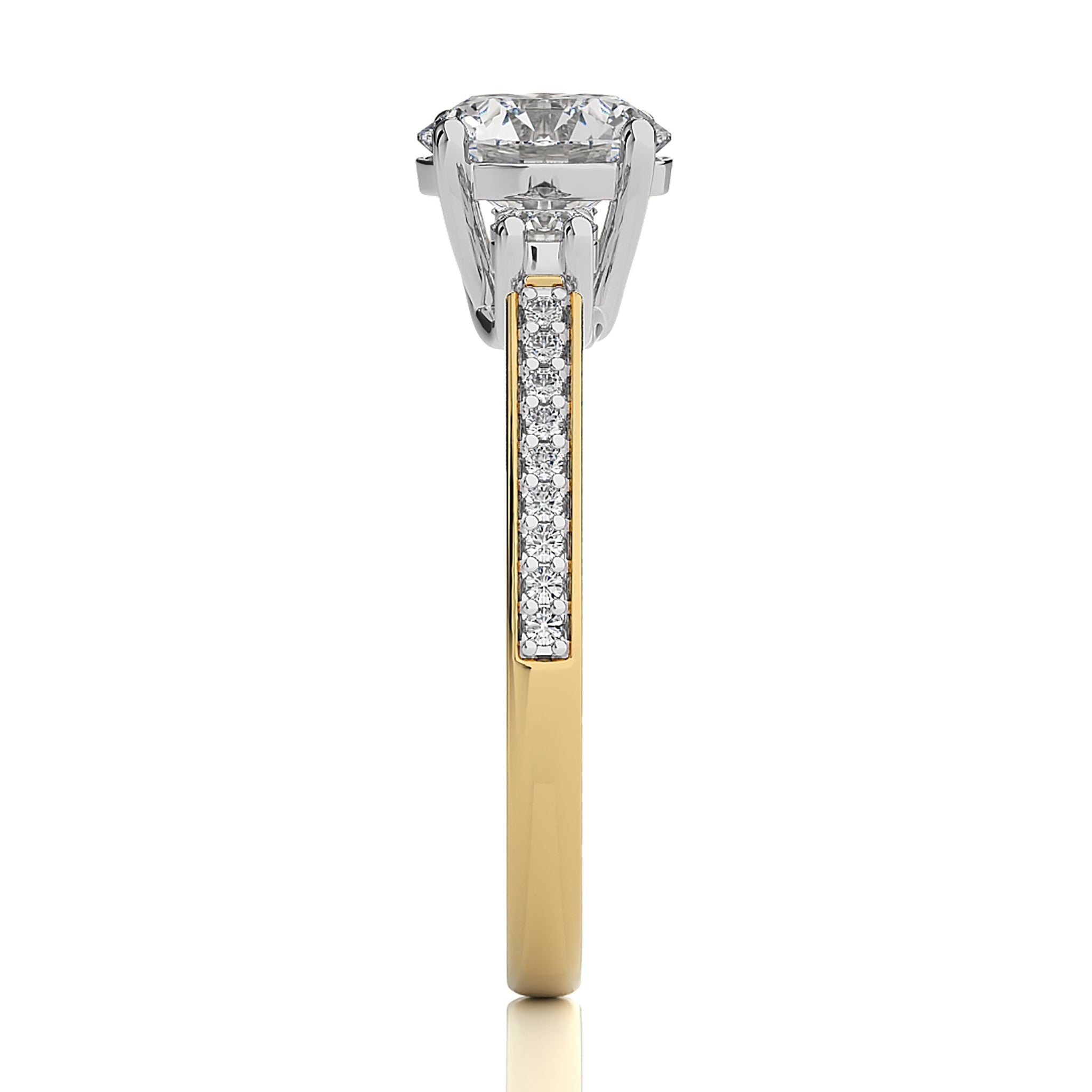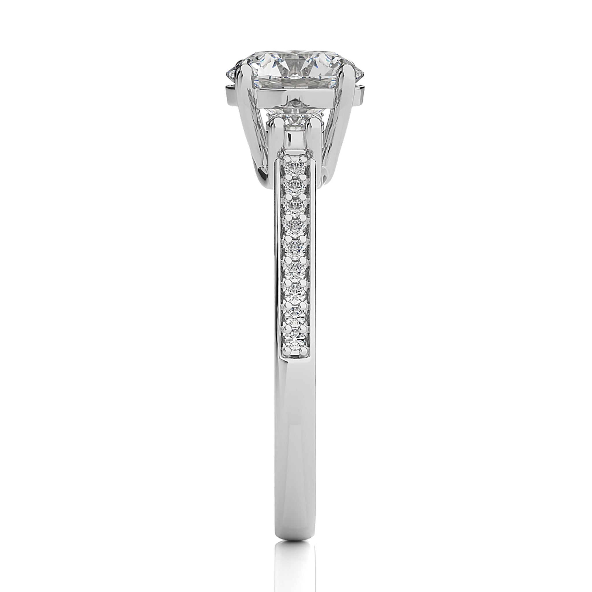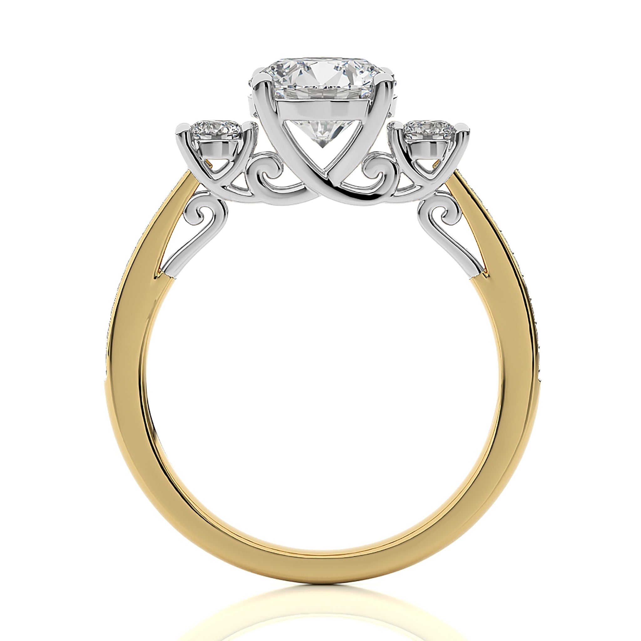 Celebrate your love story with our Classic Three-Stone Diamond Engagement Ring. Meticulously set in a harmonious combination of pave and prong settings, this timeless piece symbolizes the past, present, and future of your enduring commitment.
