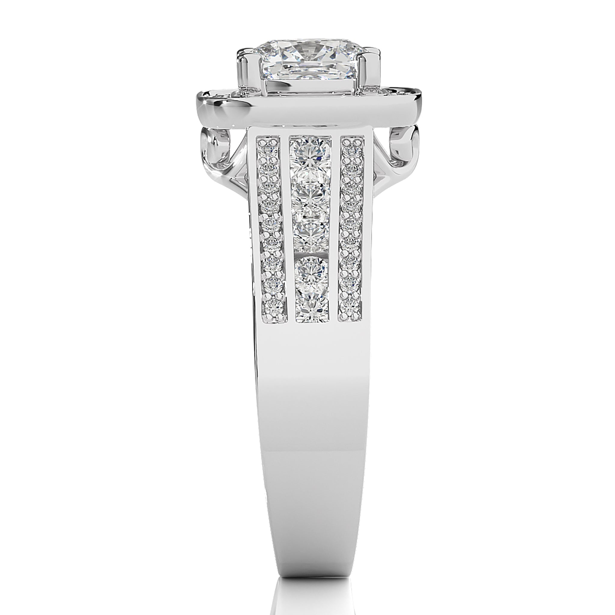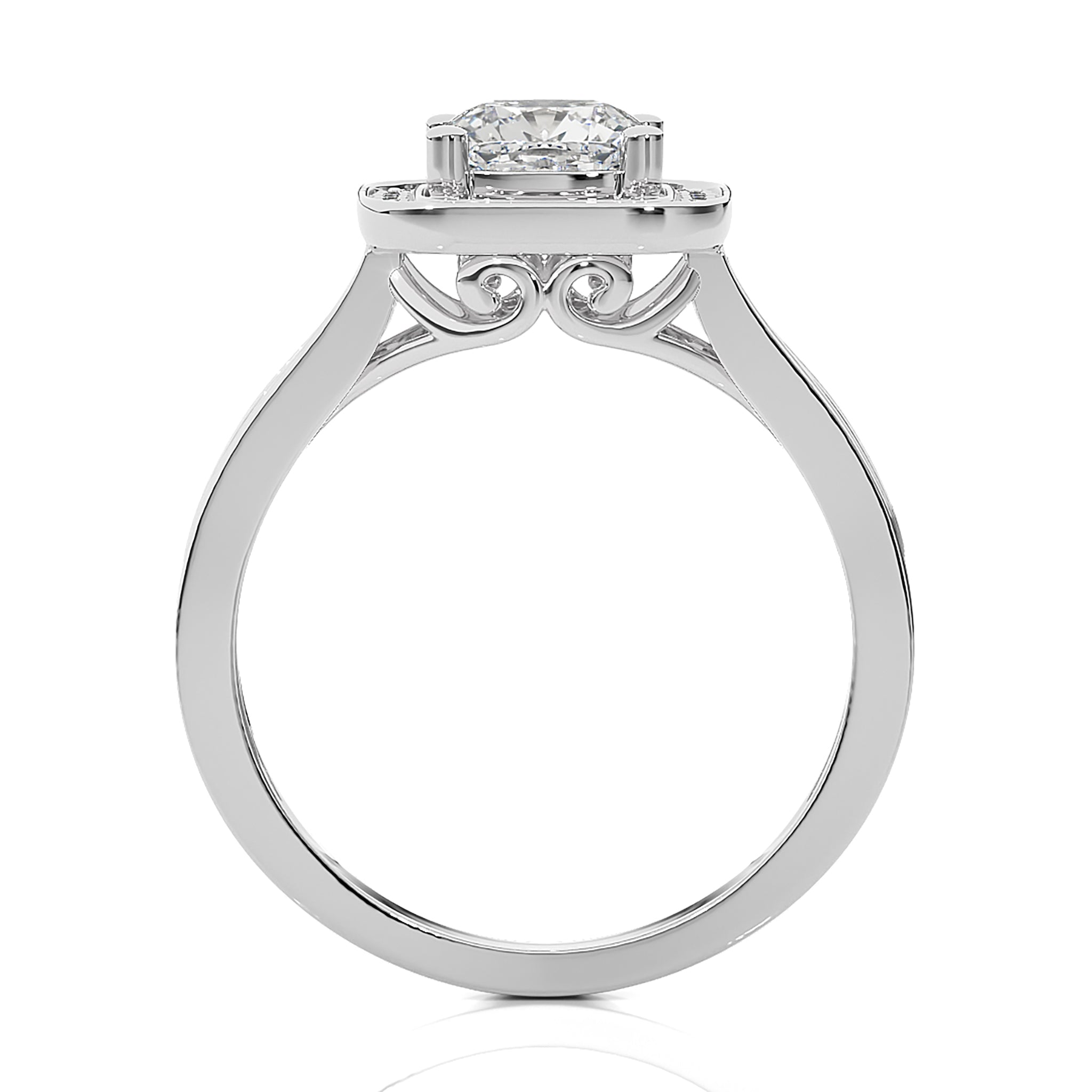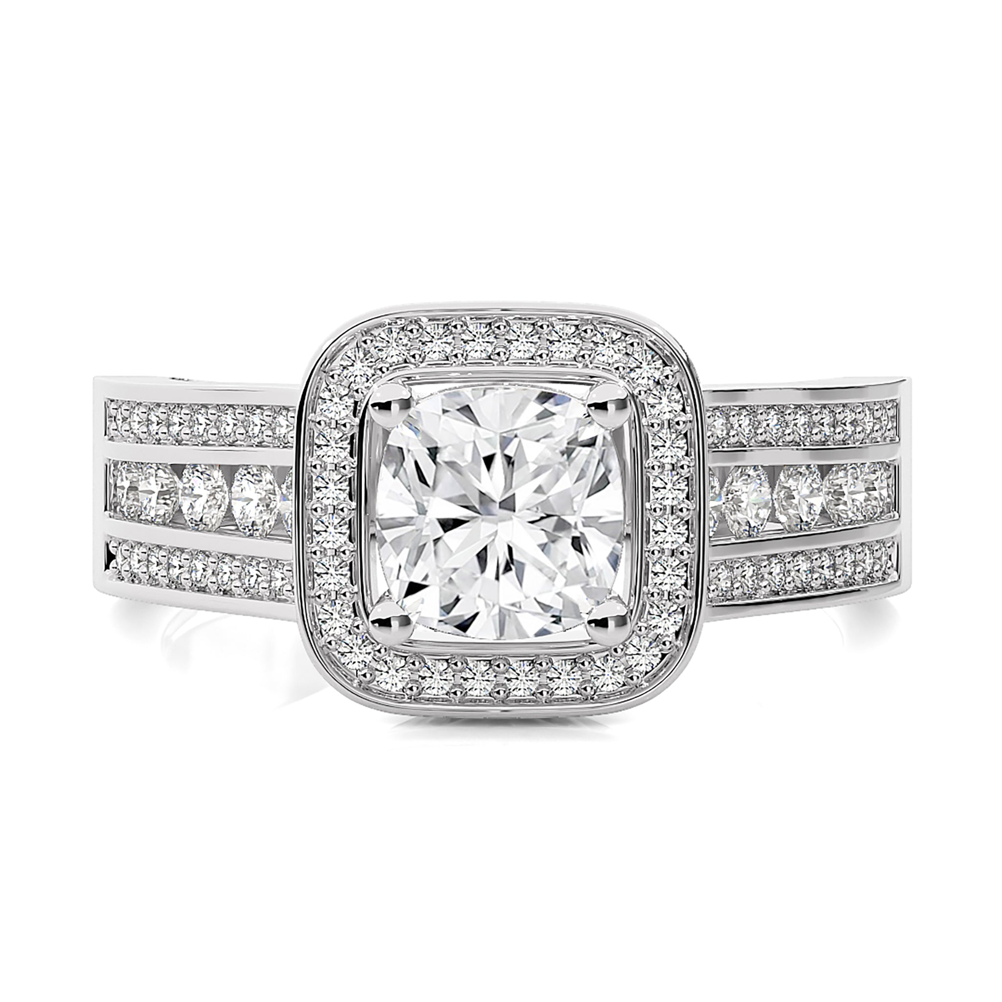 Embrace eternal love with our Contemporary Diamond Halo Engagement Ring. Set in a refined pave channel and held by graceful prong settings, this ring epitomizes classic elegance with a touch of modern brilliance. A timeless symbol of commitment and sophistication.