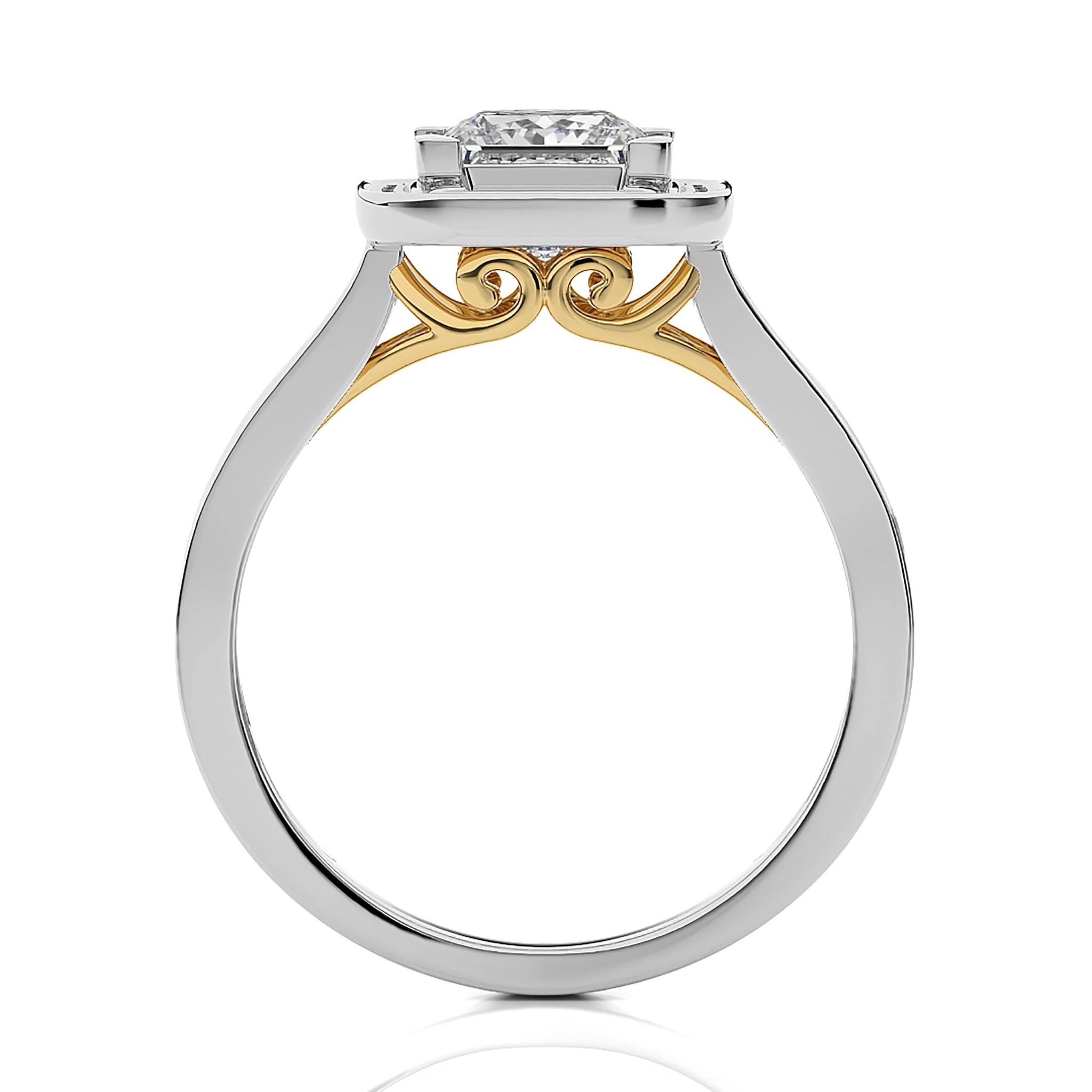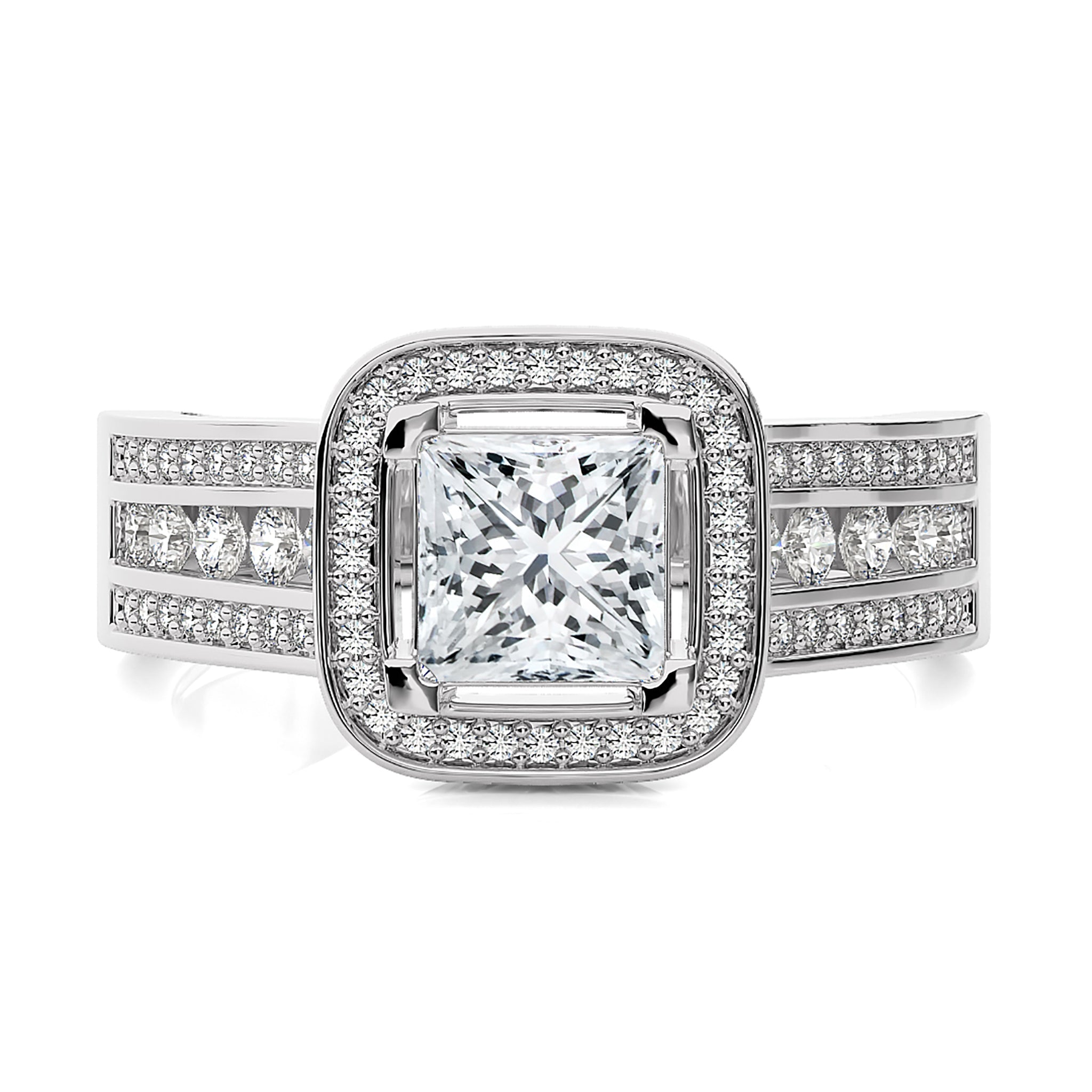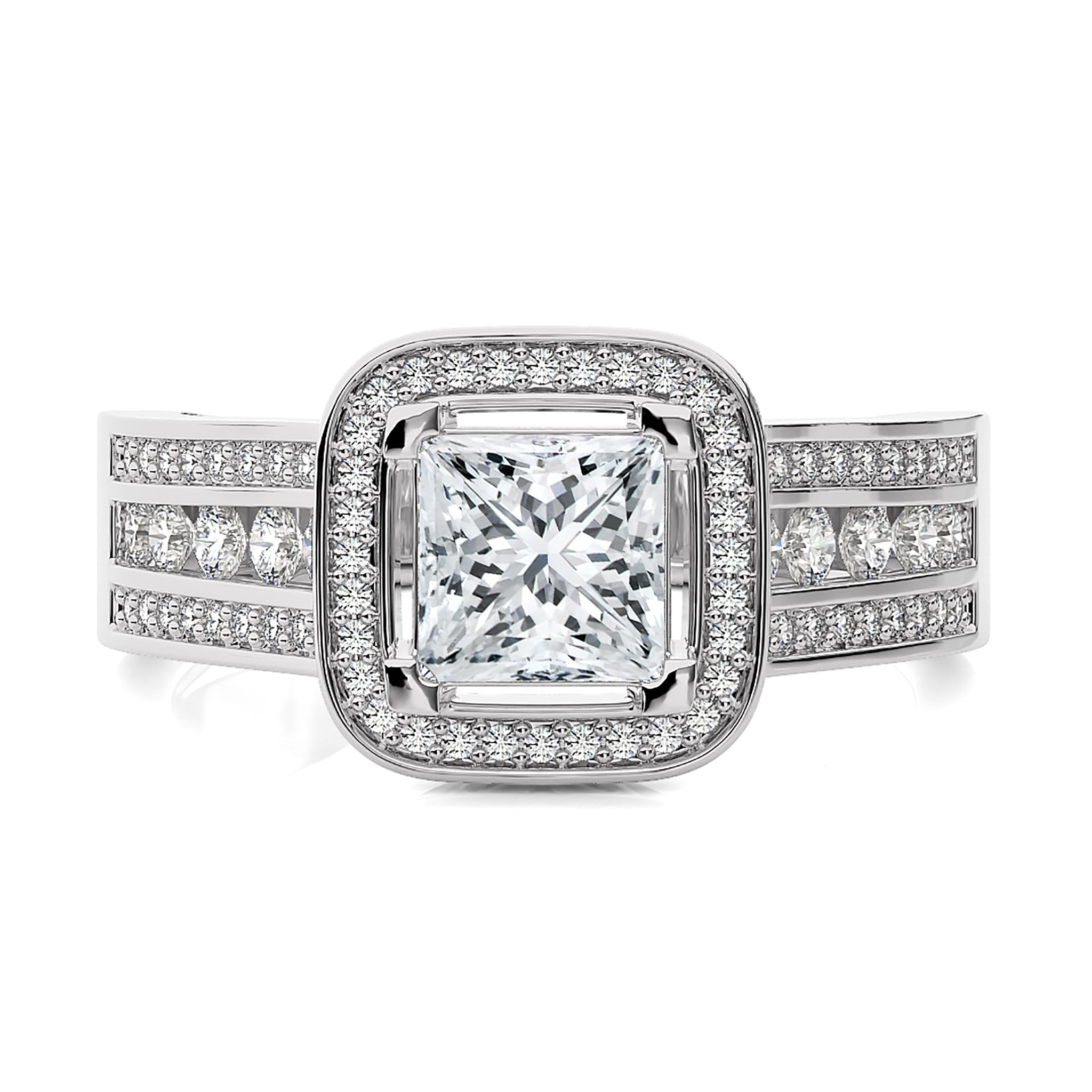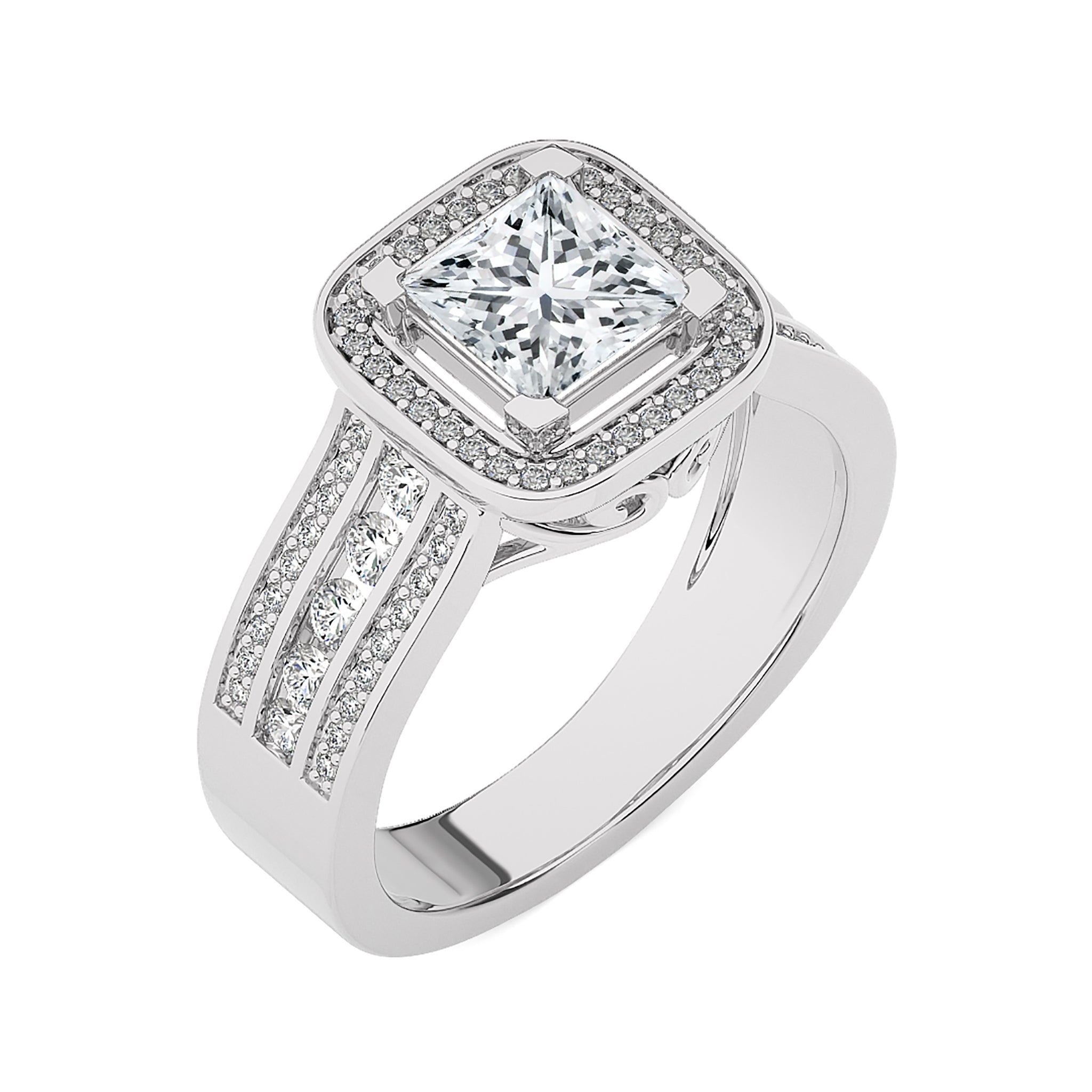 Embrace eternal love with our Contemporary Diamond Halo Engagement Ring. Set in a refined pave channel and held by graceful prong settings, this ring epitomizes classic elegance with a touch of modern brilliance. A timeless symbol of commitment and sophistication.