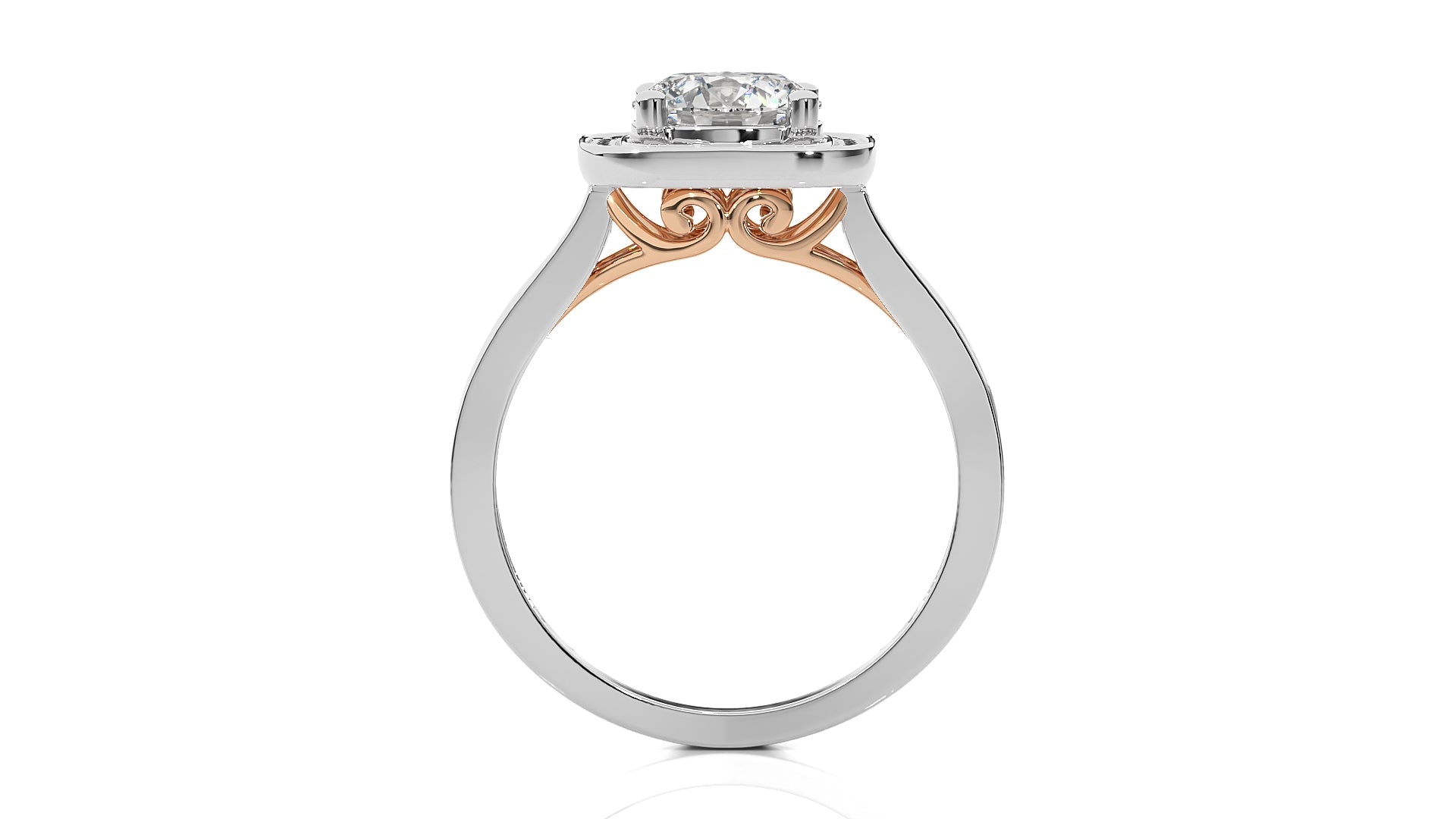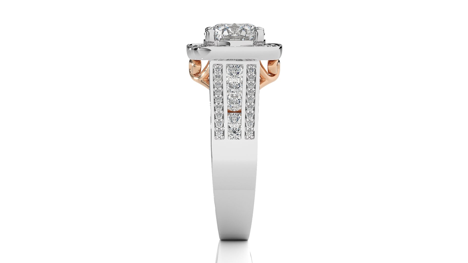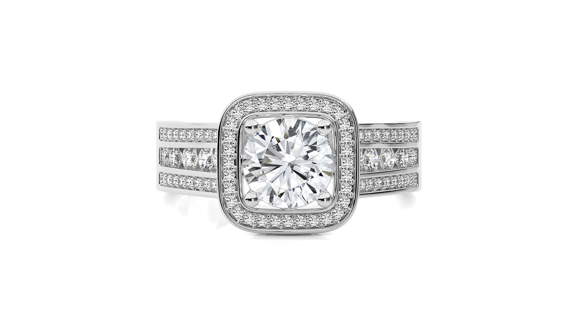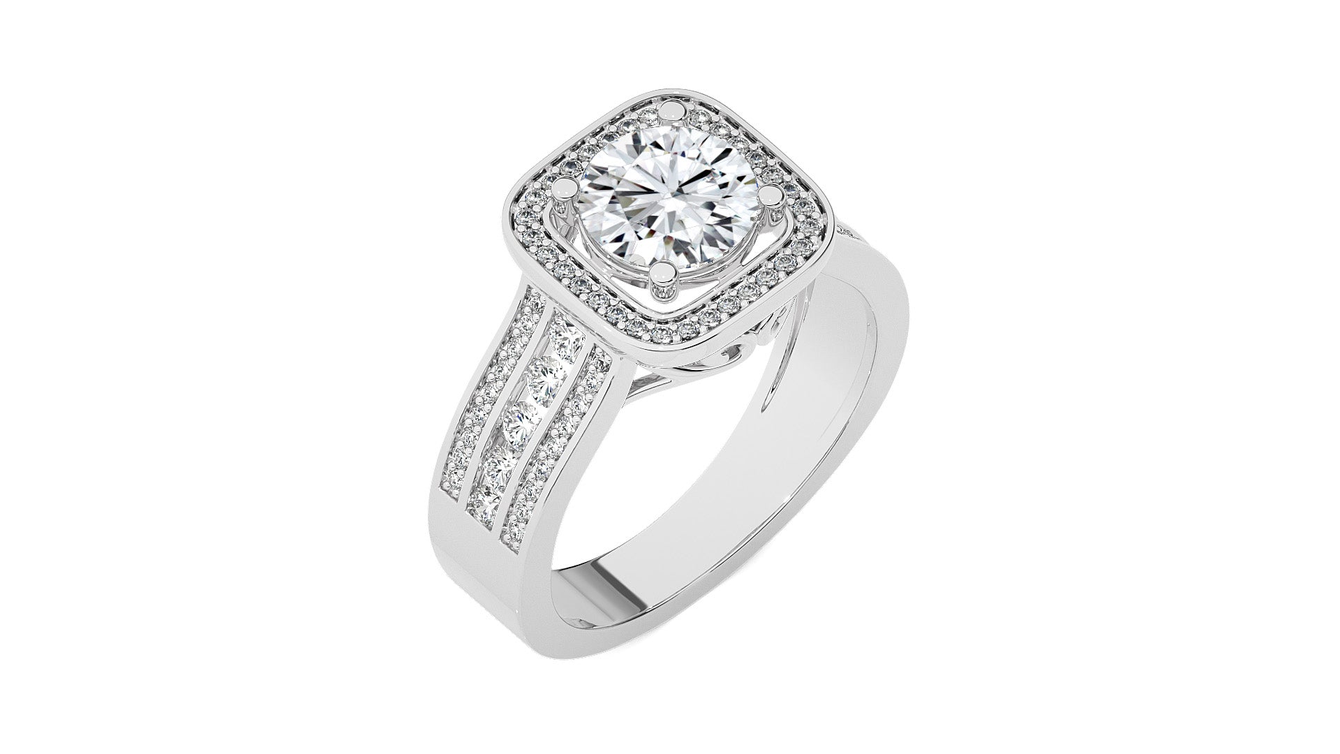 Embrace eternal love with our Contemporary Diamond Halo Engagement Ring. Set in a refined pave channel and held by graceful prong settings, this ring epitomizes classic elegance with a touch of modern brilliance. A timeless symbol of commitment and sophistication.