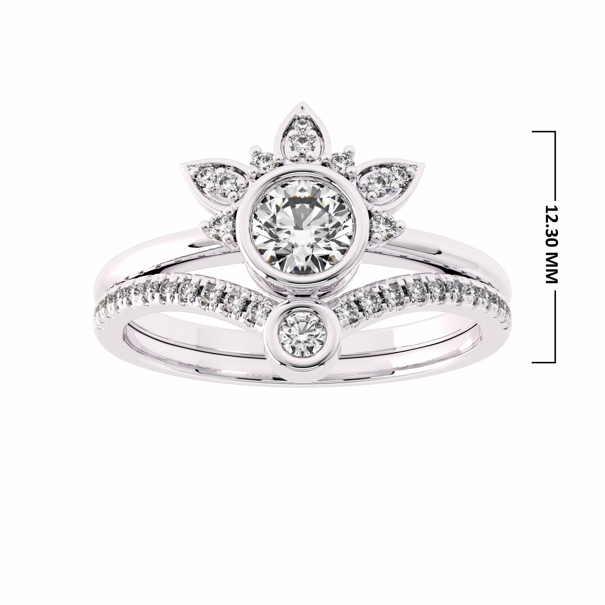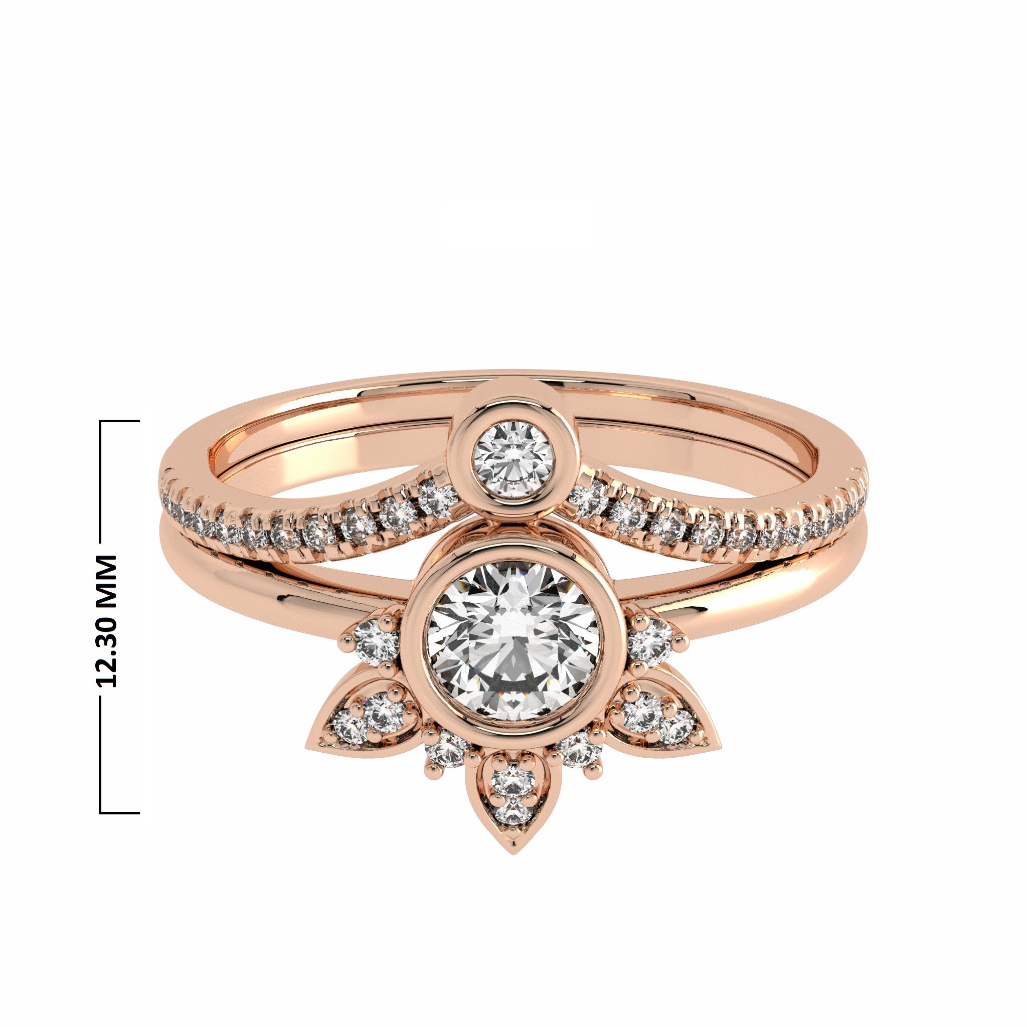 This 1/2 carat vintage bridal set is a timeless masterpiece. The central diamond, boasting G-H color and SI quality, takes center stage in a combination of micro split and bezel settings, exuding vintage charm and grace. It's a classic symbol of love with a touch of history, capturing the essence of enduring romance.