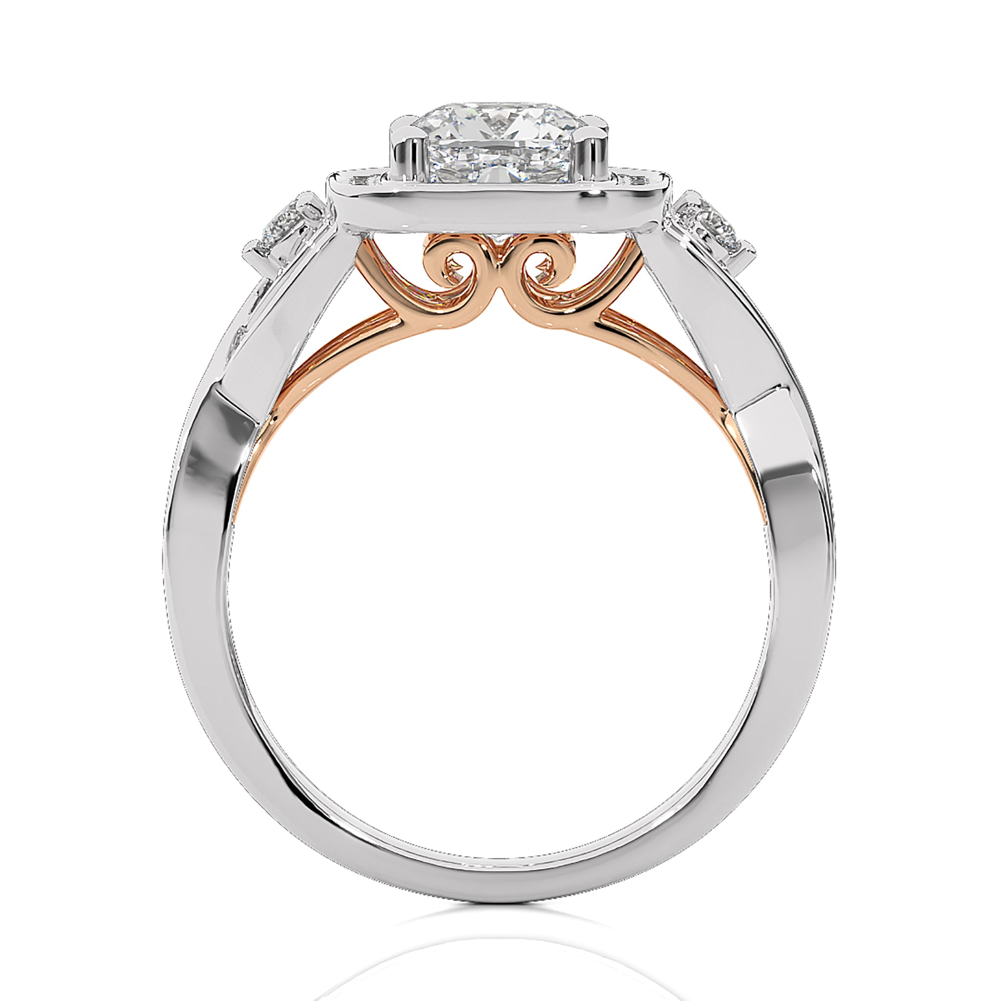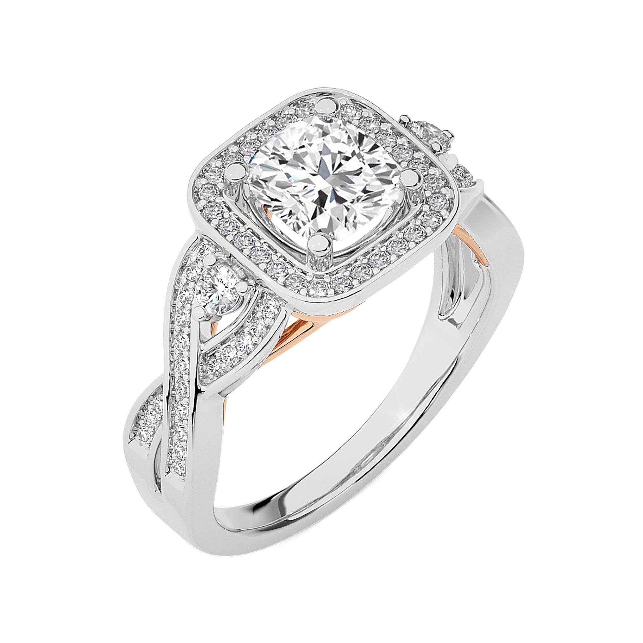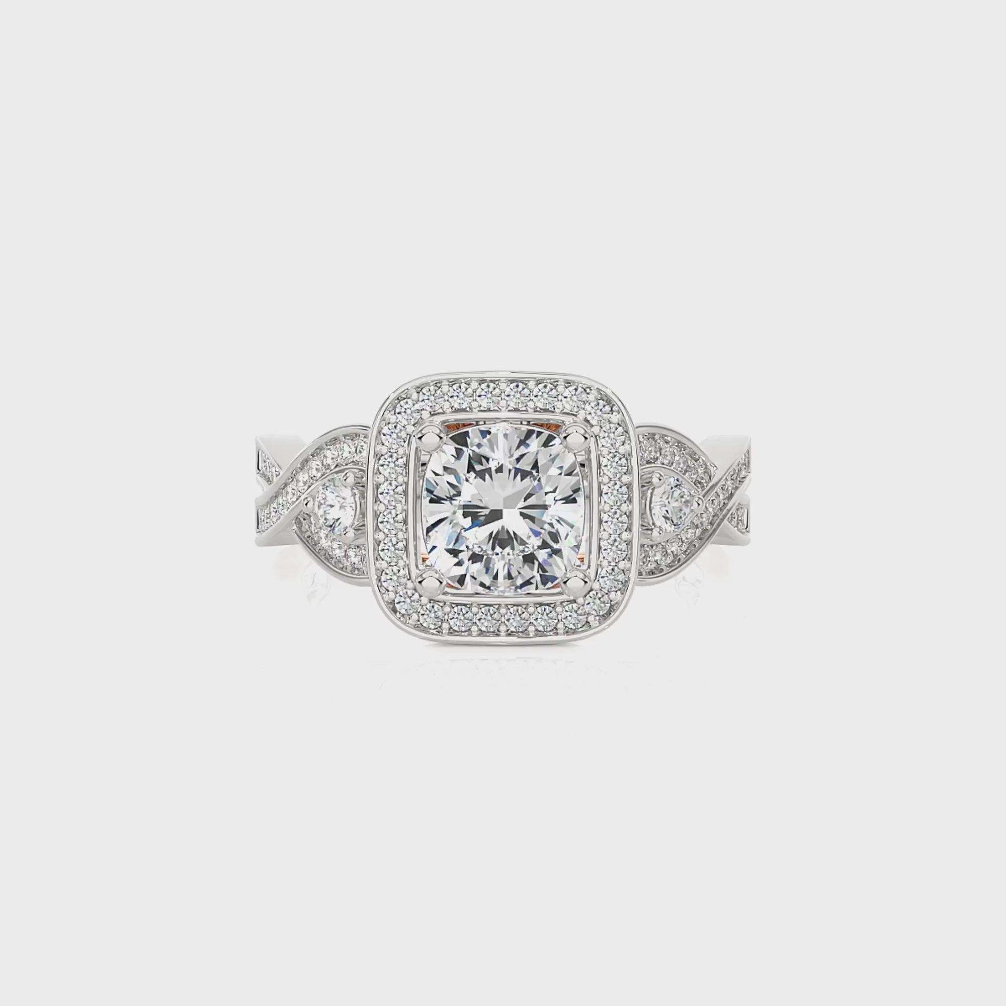 Enhance your love story with our Classic Nimbus Double Twist Split Shank Halo Diamond Engagement Ring. Expertly set in a harmonious blend of pave and prong settings. The double twist split shank design adds a touch of grace, framing the brilliant halo center, symbolizing a union that's as enduring as it is elegant.