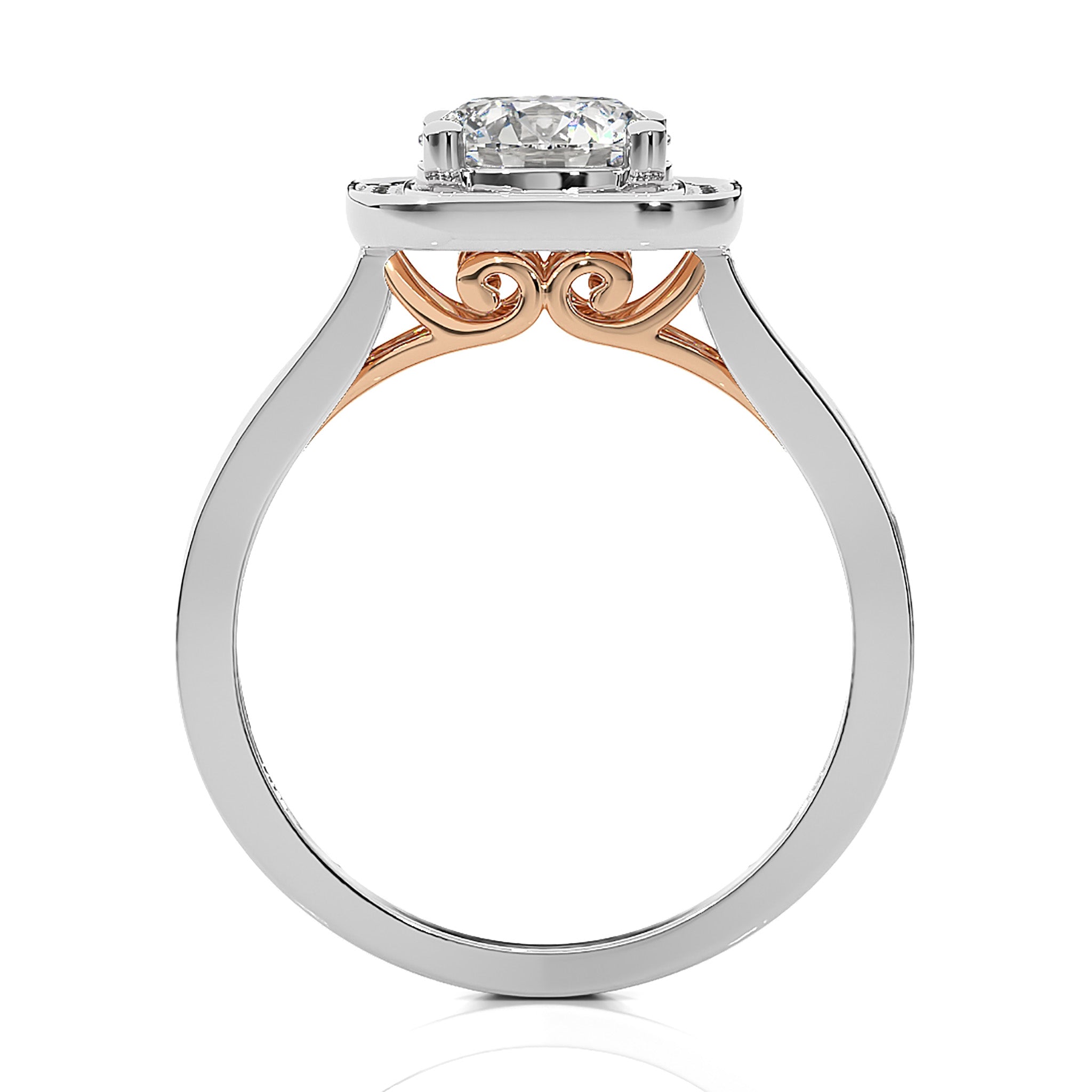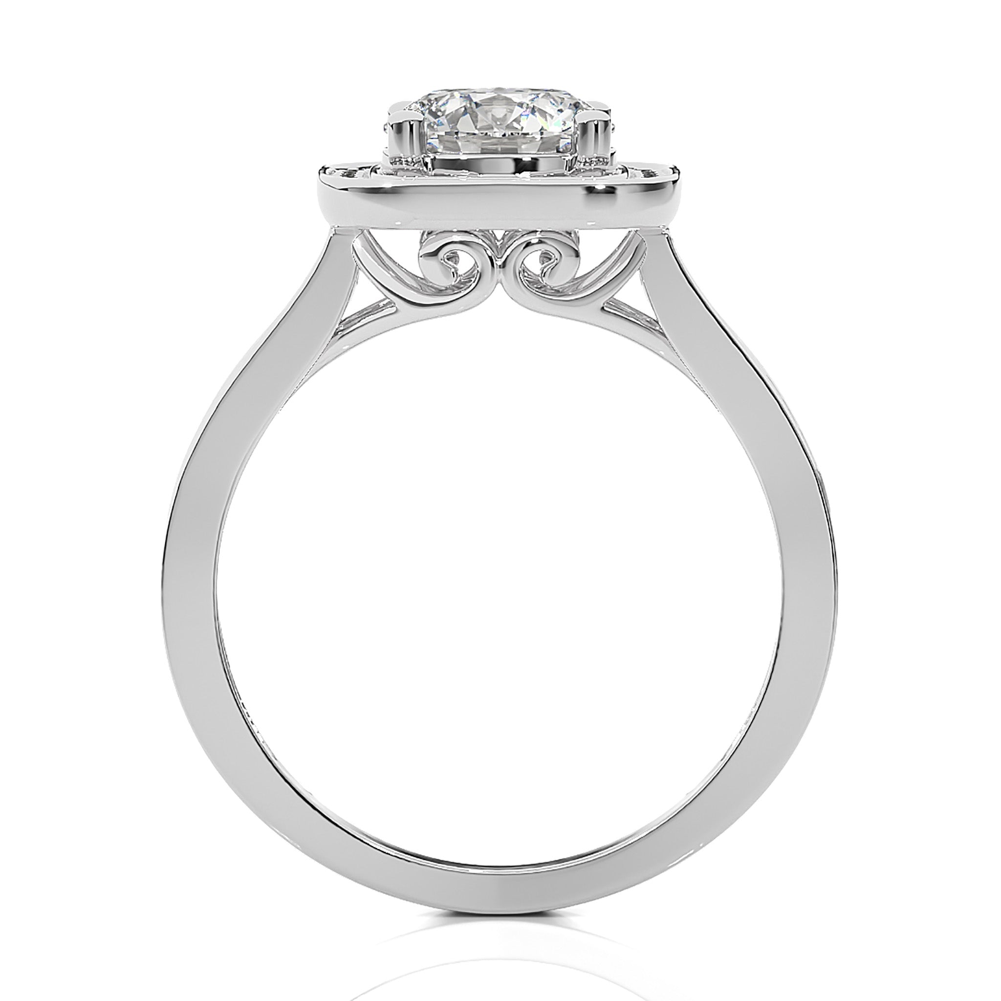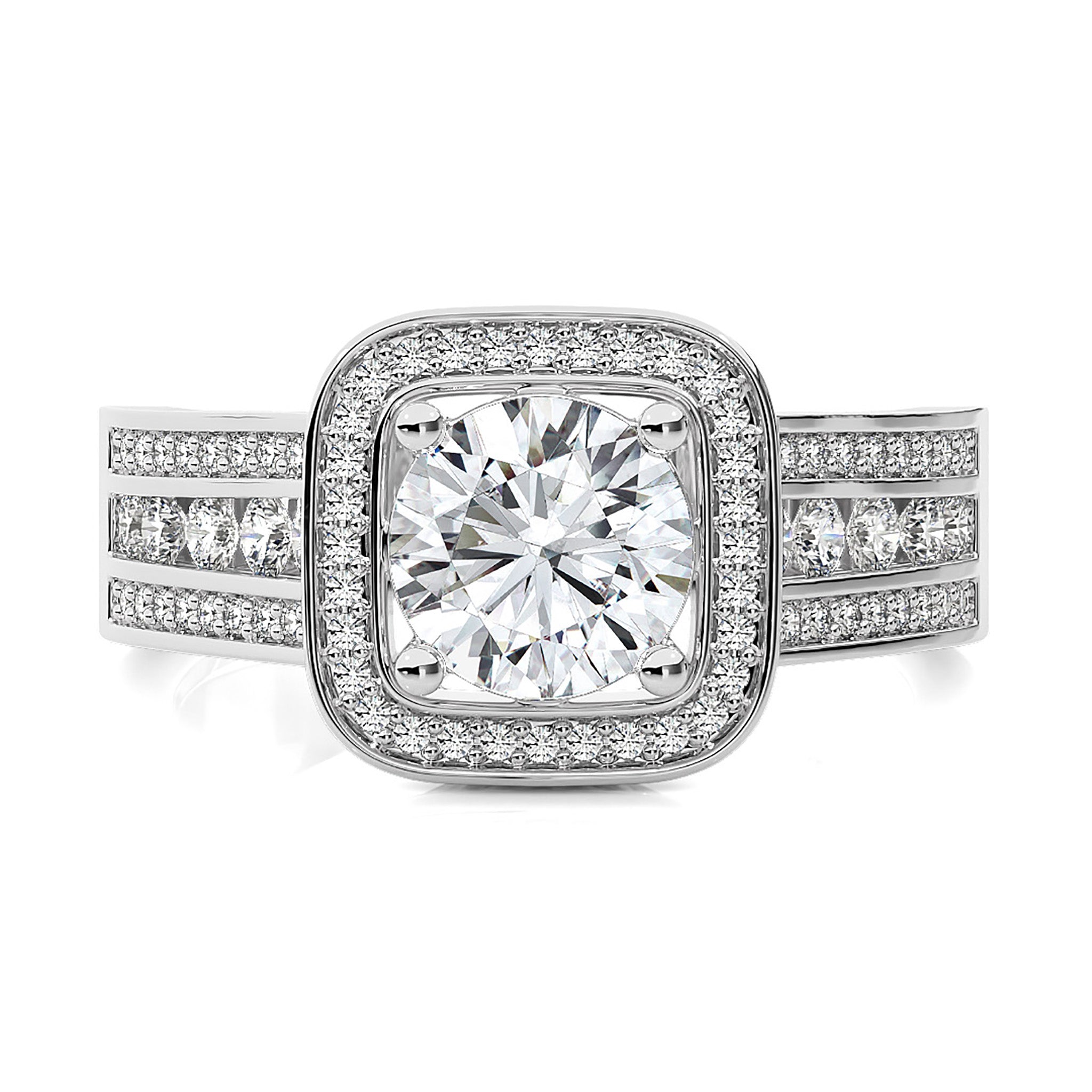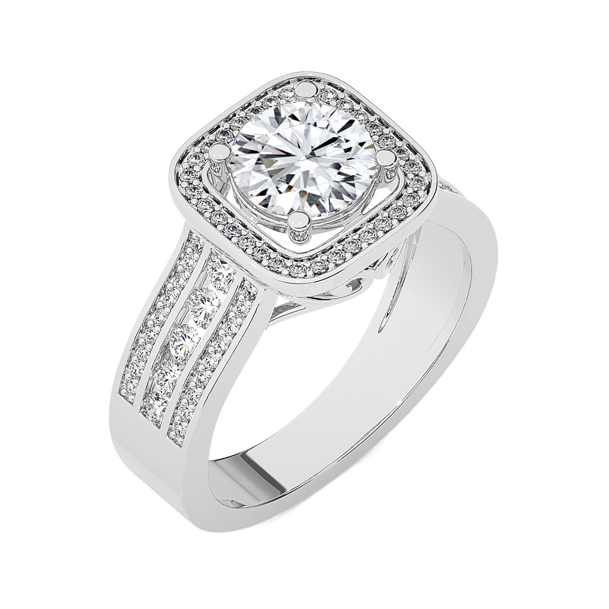 Embrace eternal love with our Contemporary Diamond Halo Engagement Ring. Set in a refined pave channel and held by graceful prong settings, this ring epitomizes classic elegance with a touch of modern brilliance. A timeless symbol of commitment and sophistication.