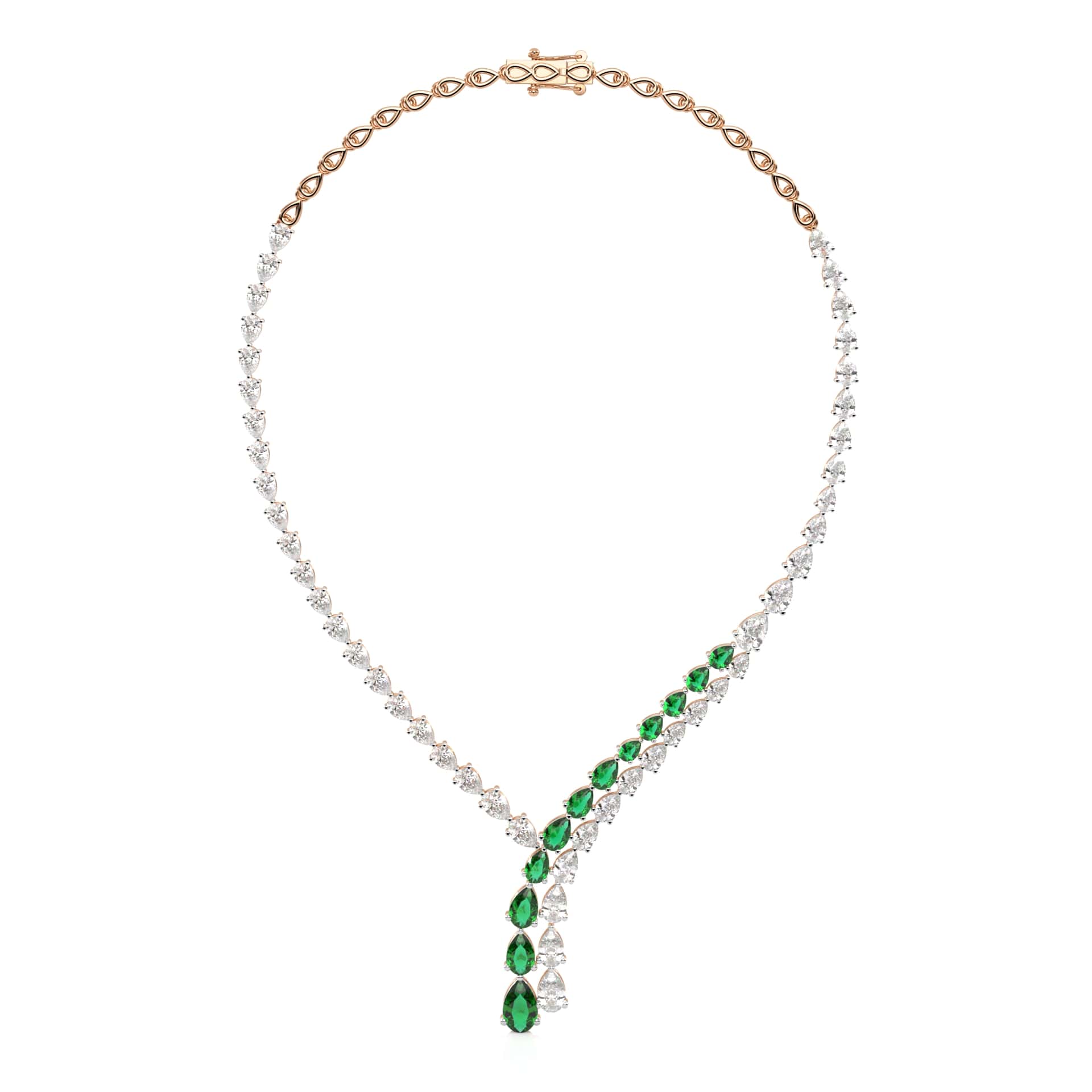 Treat yourself to elegance with this Pear Emerald and Natural Diamond Double Stranded Necklace. Set in a prong setting with H-I/I1-I2 quality diamonds, it perfectly combines the rich emeralds with dazzling diamonds for a luxurious, timeless design