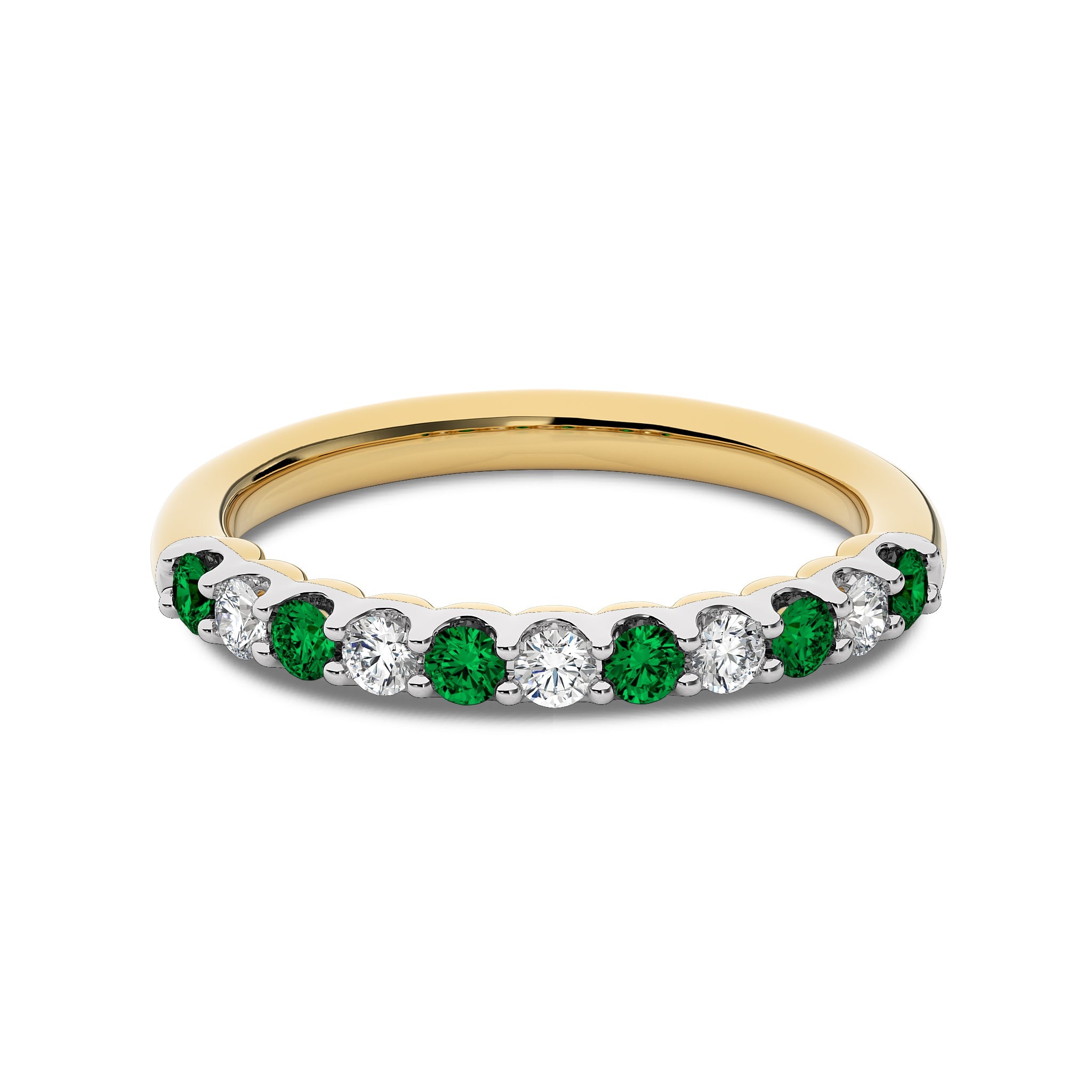 Enjoy the beauty of timeless design with this 3/8 CT. Natural Diamond and Emerald Round Half Eternity Band. Featuring a stunning combination of natural diamonds H-I/I1-I2 and vibrant emeralds, all set in a shared prong design. The alternating gemstones create a beautiful contrast, offering a sophisticated and luxurious touch. Make a lasting impression with this elegant band on your next memorable moment