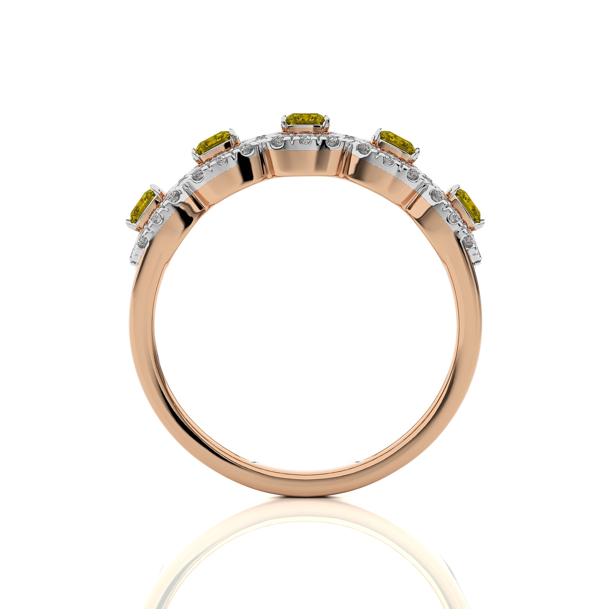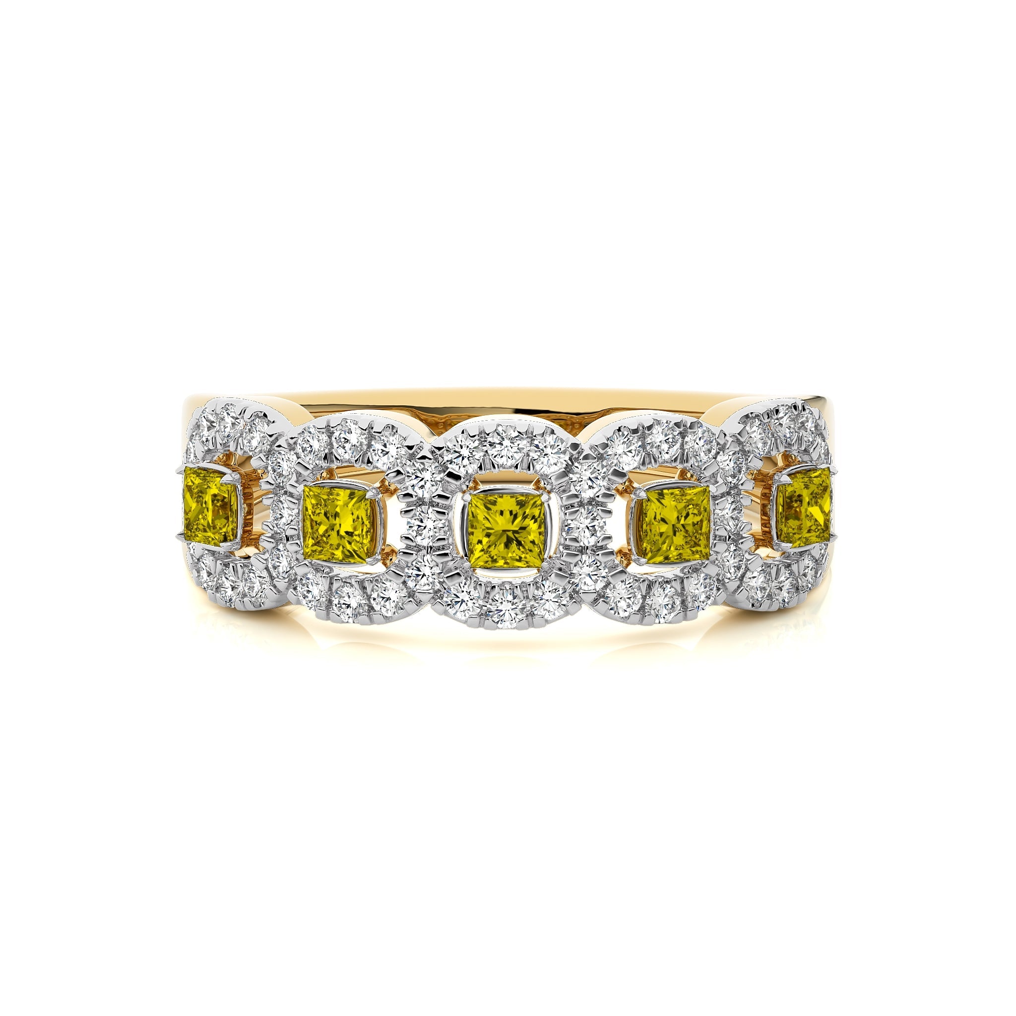 Experience the mesmerizing beauty of this exquisite ring, featuring a captivating blend of round and cushion fancy yellow natural diamonds totaling 1 carat. Each diamond, of DEF/VS quality, is meticulously set in a stunning micro split and prong setting, enhancing its brilliance and allure. A true masterpiece that exudes elegance and sophistication, perfect for making a statement on any occasion