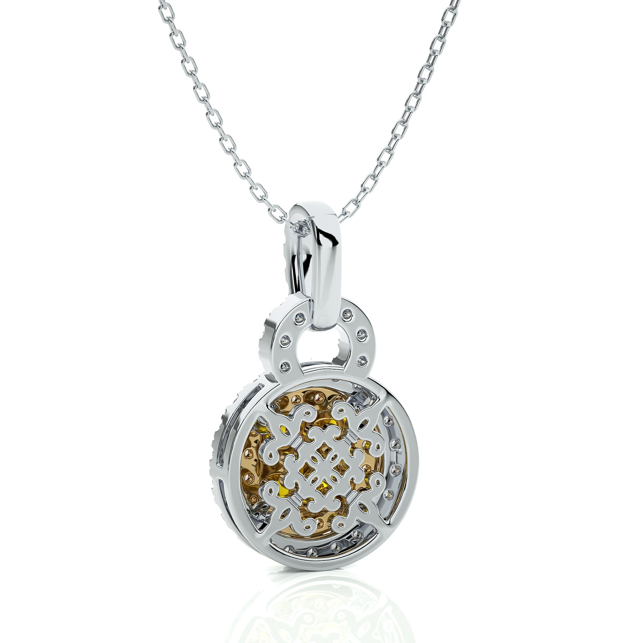 This stunning pendant features a captivating 5/8 carat Natural fancy yellow cushion and round diamond, elegantly set in a secure prong setting. A stunning 1/3 carat round diamond adds a touch of sophistication, set in a micro split to enhance the brilliance and beauty of this breathtaking piece. The rich and vibrant yellow diamond paired with the sparkling round diamond creates a harmonious balance of classic elegance and modern glamour, making this pendant perfect for any occasion.