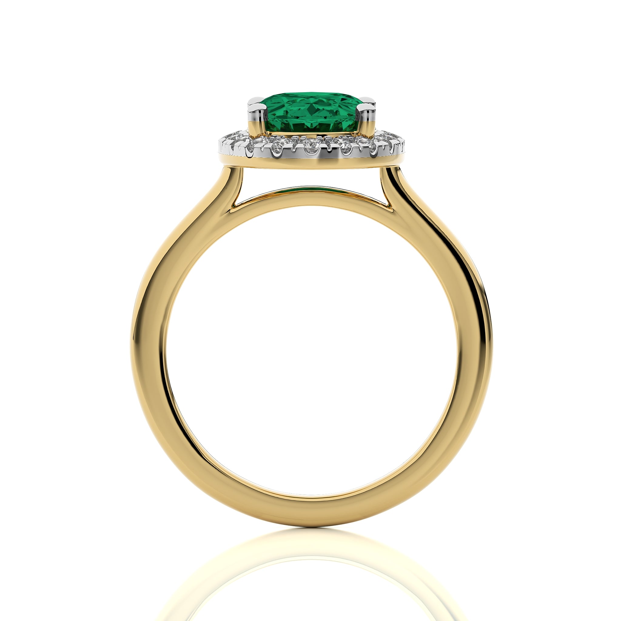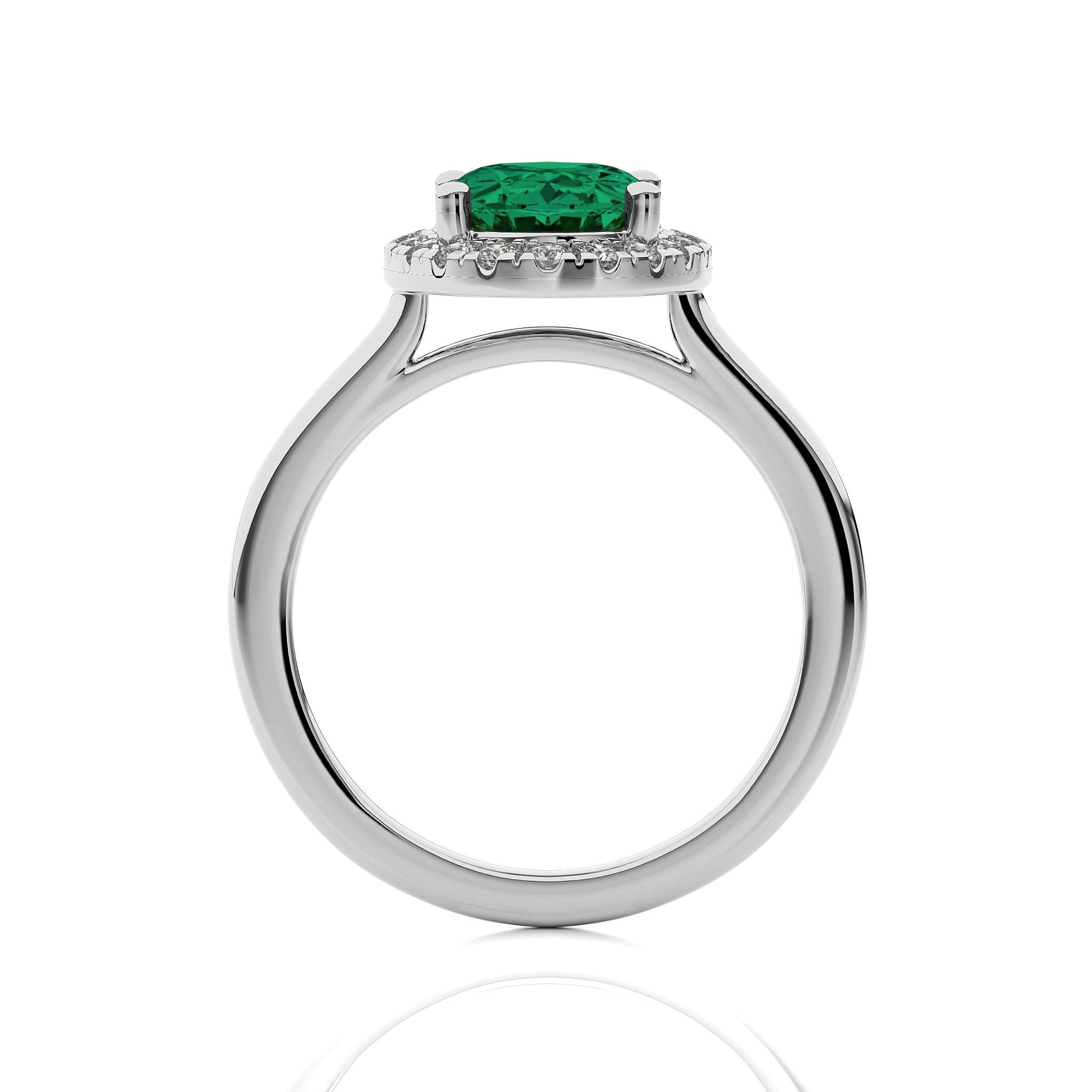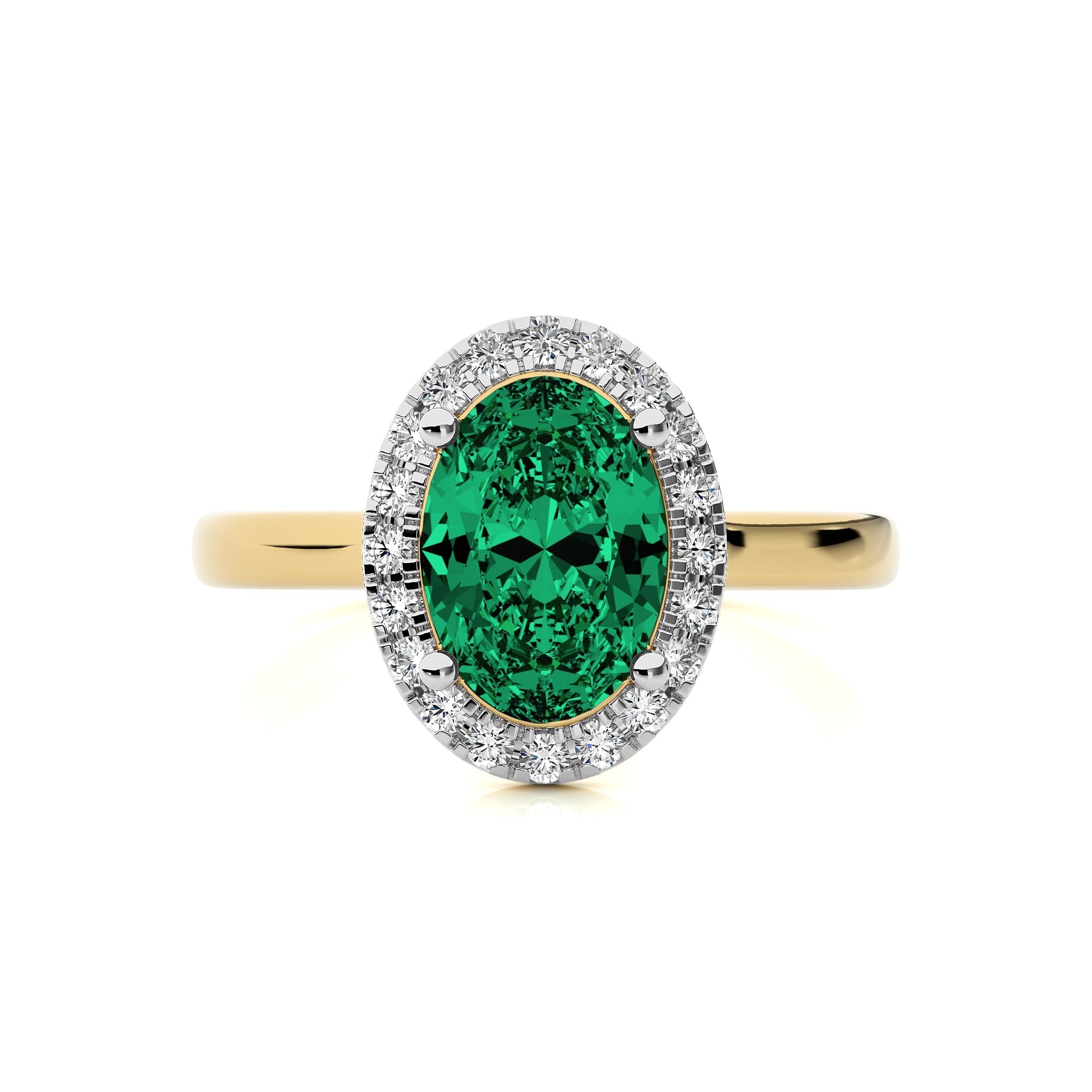 The Delicate Halo Engagement Ring features a stunning oval emerald gemstone surrounded by sparkling G-H/SI quality natural diamonds. Set in a prong setting, this ring's halo design adds a captivating touch of elegance to the classic beauty of the emerald centerpiece.