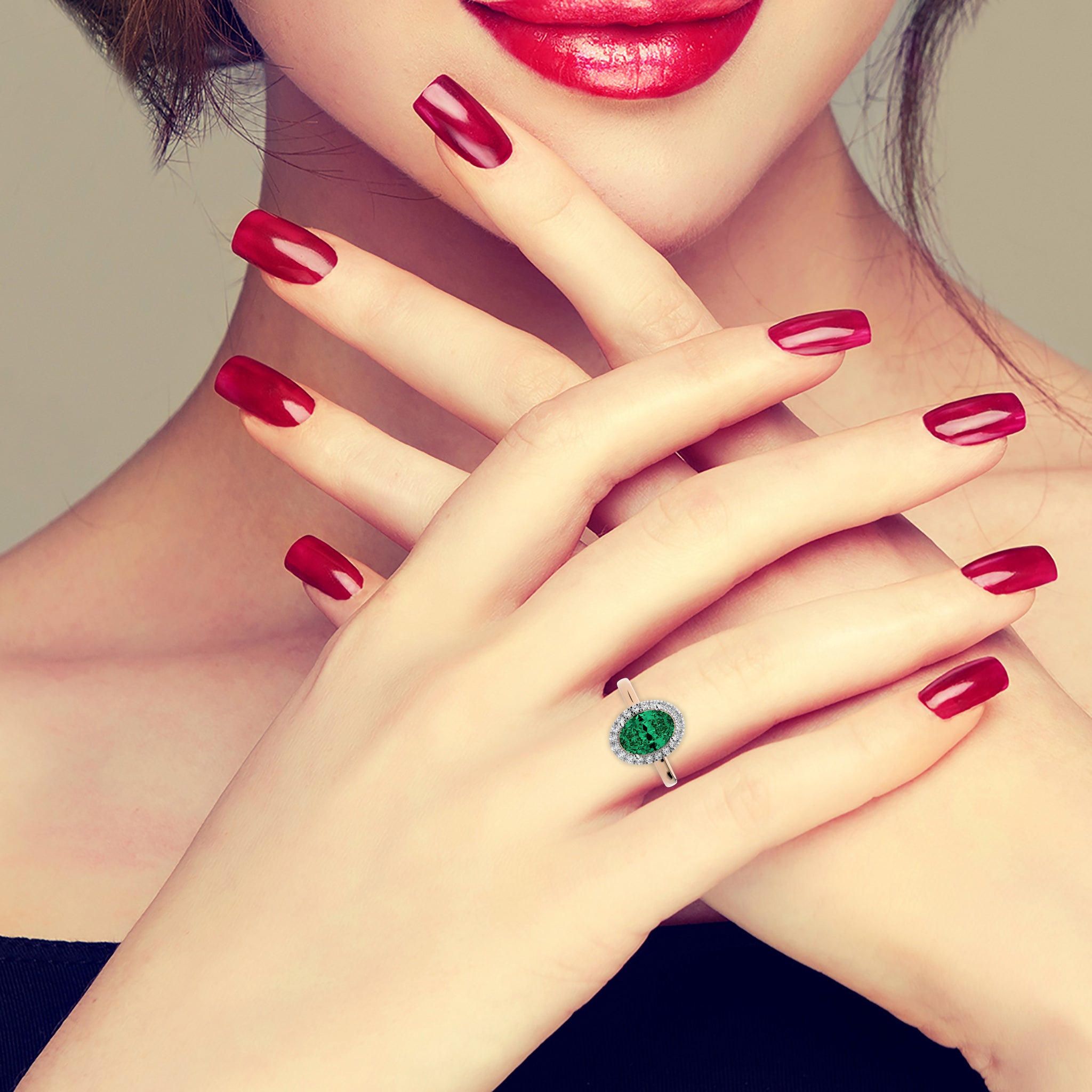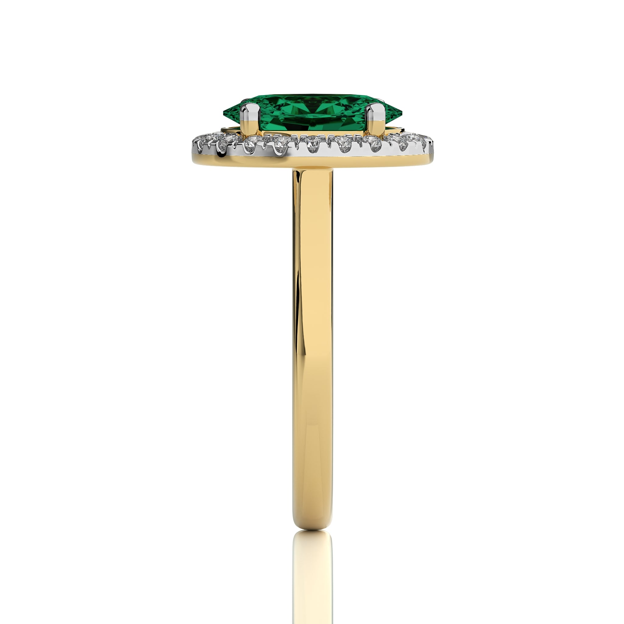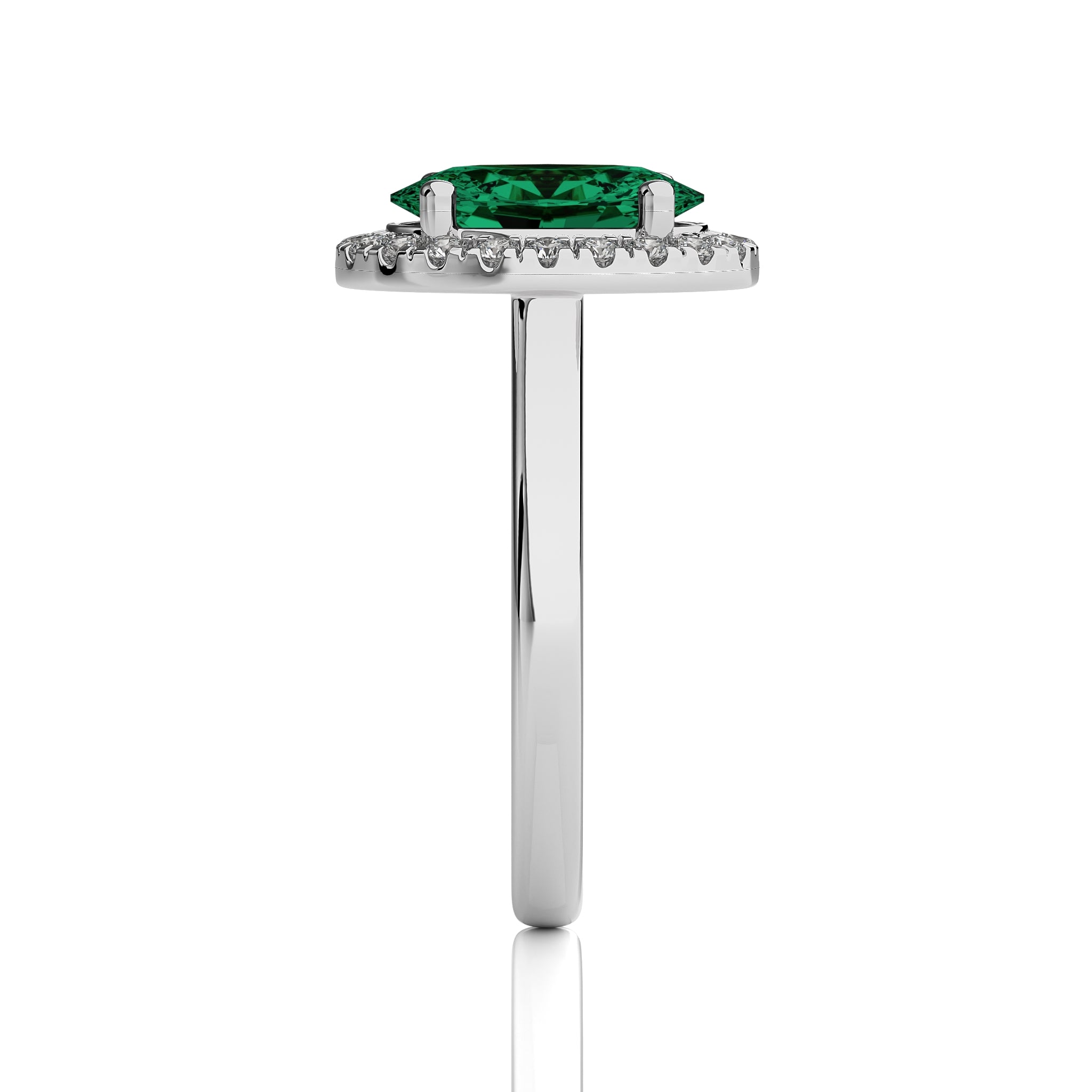 The Delicate Halo Engagement Ring features a stunning oval emerald gemstone surrounded by sparkling G-H/SI quality natural diamonds. Set in a prong setting, this ring's halo design adds a captivating touch of elegance to the classic beauty of the emerald centerpiece.