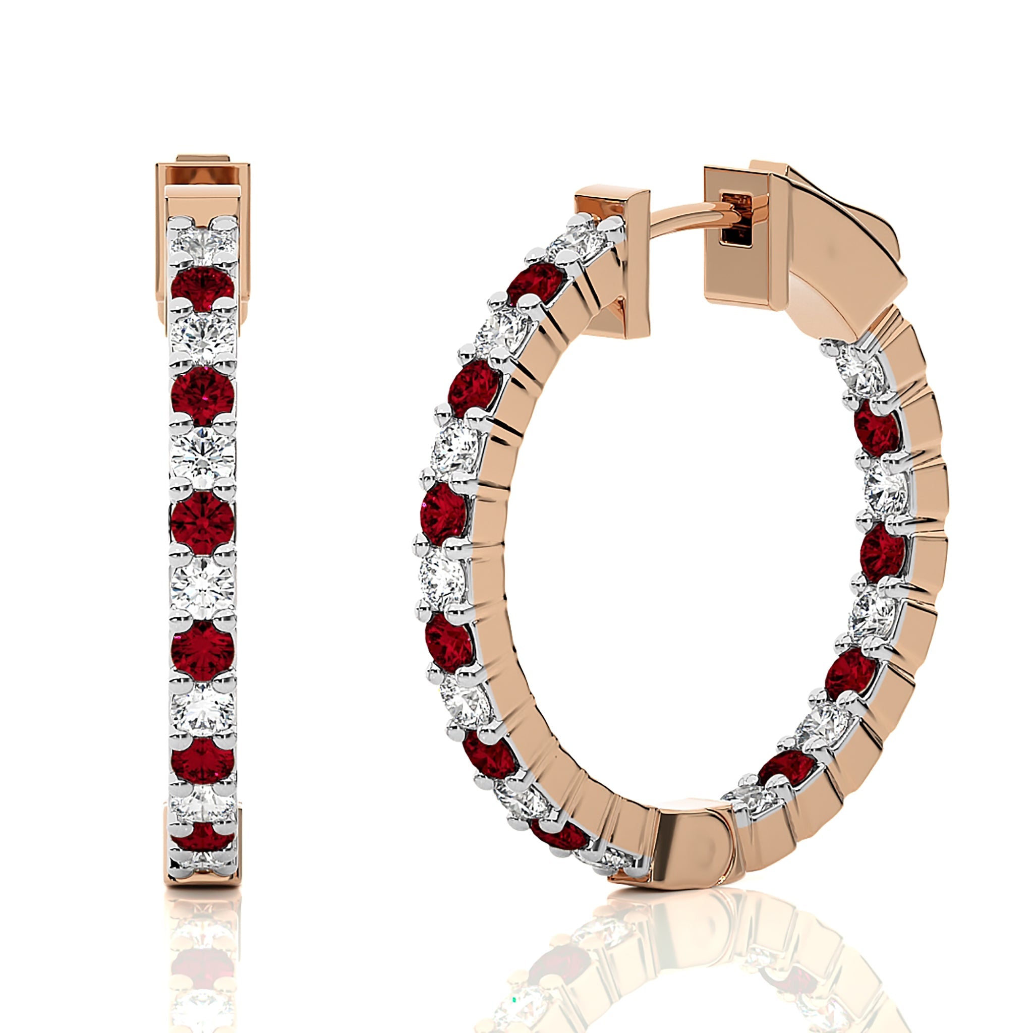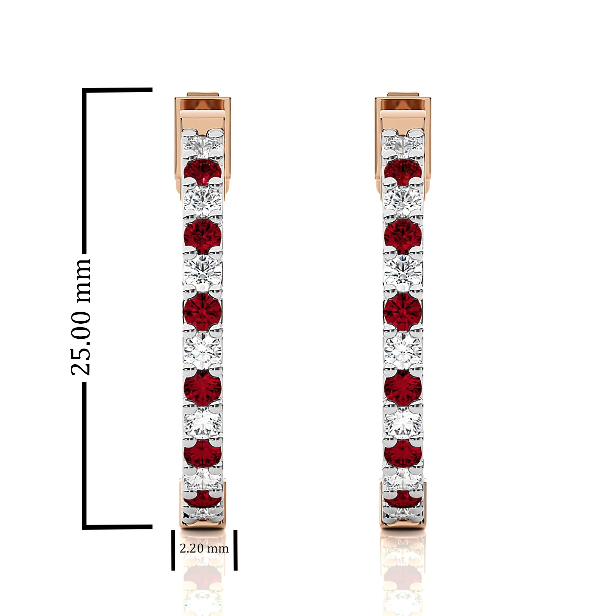Let's have a look at these stunning 2 CT. Inside Out Hoop Earrings, where shimmering round natural diamonds meet the bold allure of rubies. Set in a classic prong design, the diamonds boast H-I color and I1-I2 clarity, providing a radiant sparkle, while the rubies add a rich, fiery red touch. The inside out setting ensures that every turn captures light beautifully, making these hoops a striking choice for both day and evening elegance