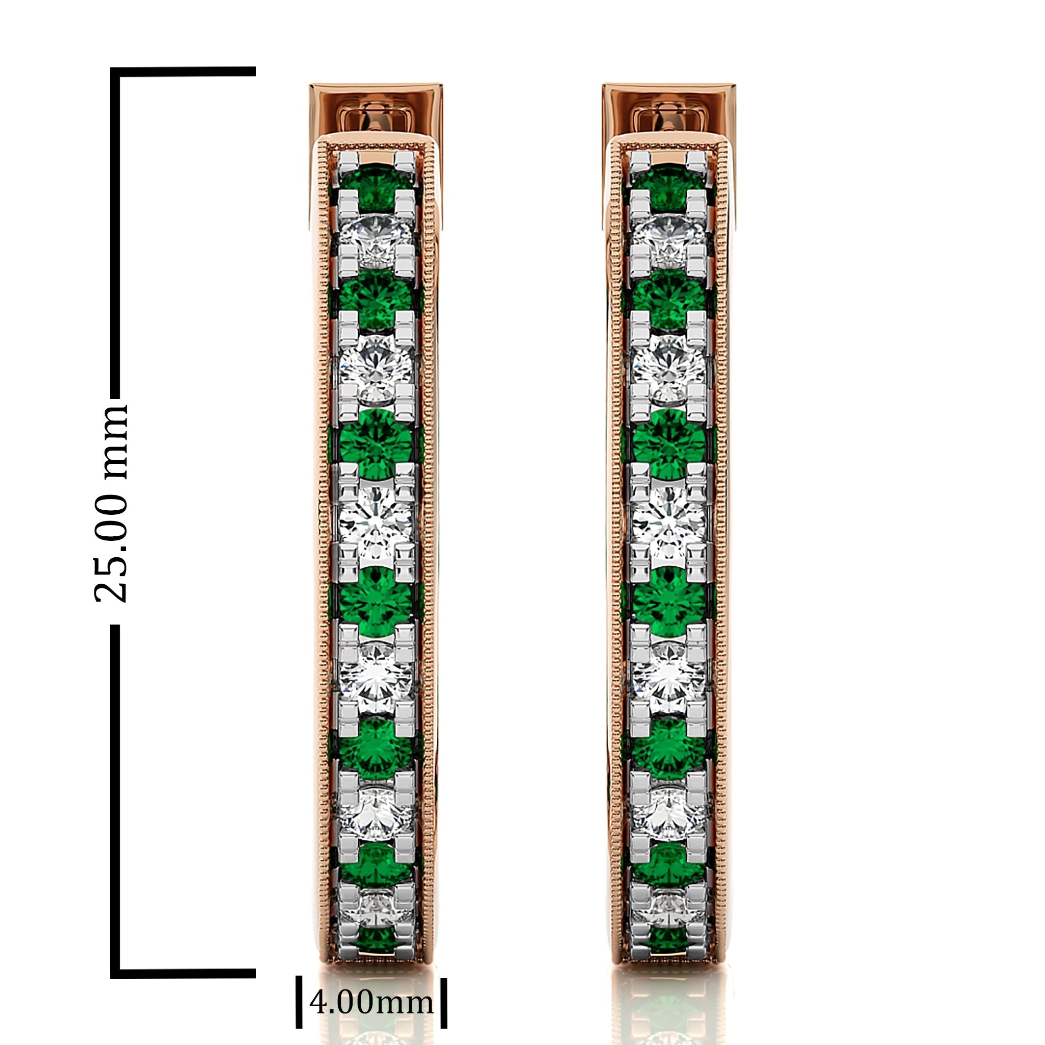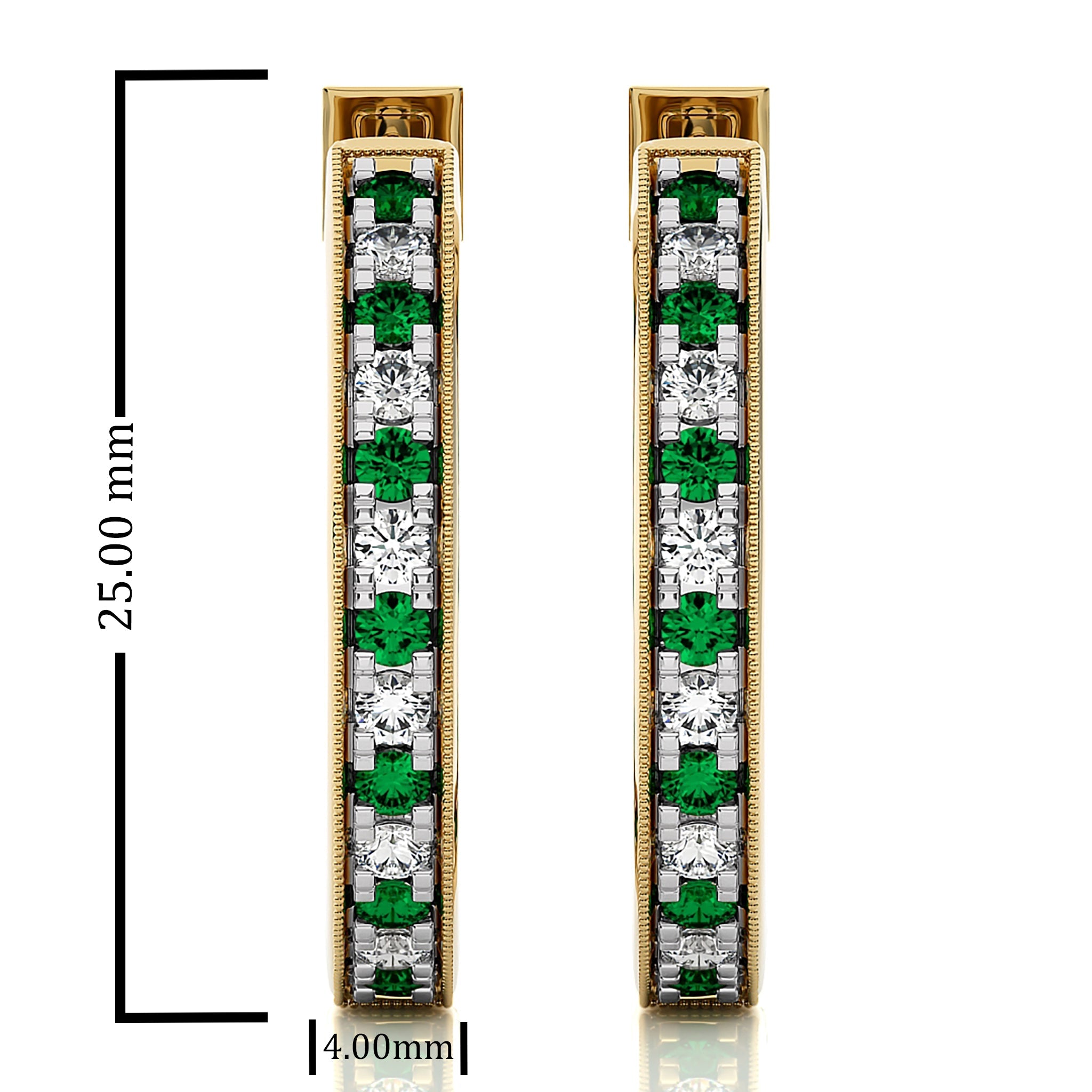 Pamper yourself with these 1 3/4 CT. Round Natural Diamond and Emerald Inside Out Hoop Earrings. The elegant design features alternating diamonds H-I/I1-I2 and radiant emeralds, set in a micro-split style for a stunning visual effect. A perfect way to add a touch of glamour to any look. Impress with elegance at your next special occasion with these earrings