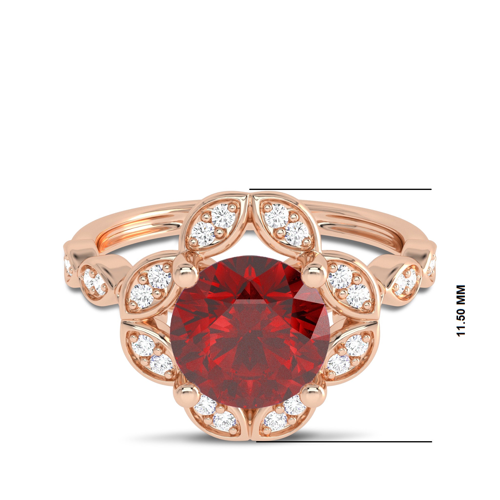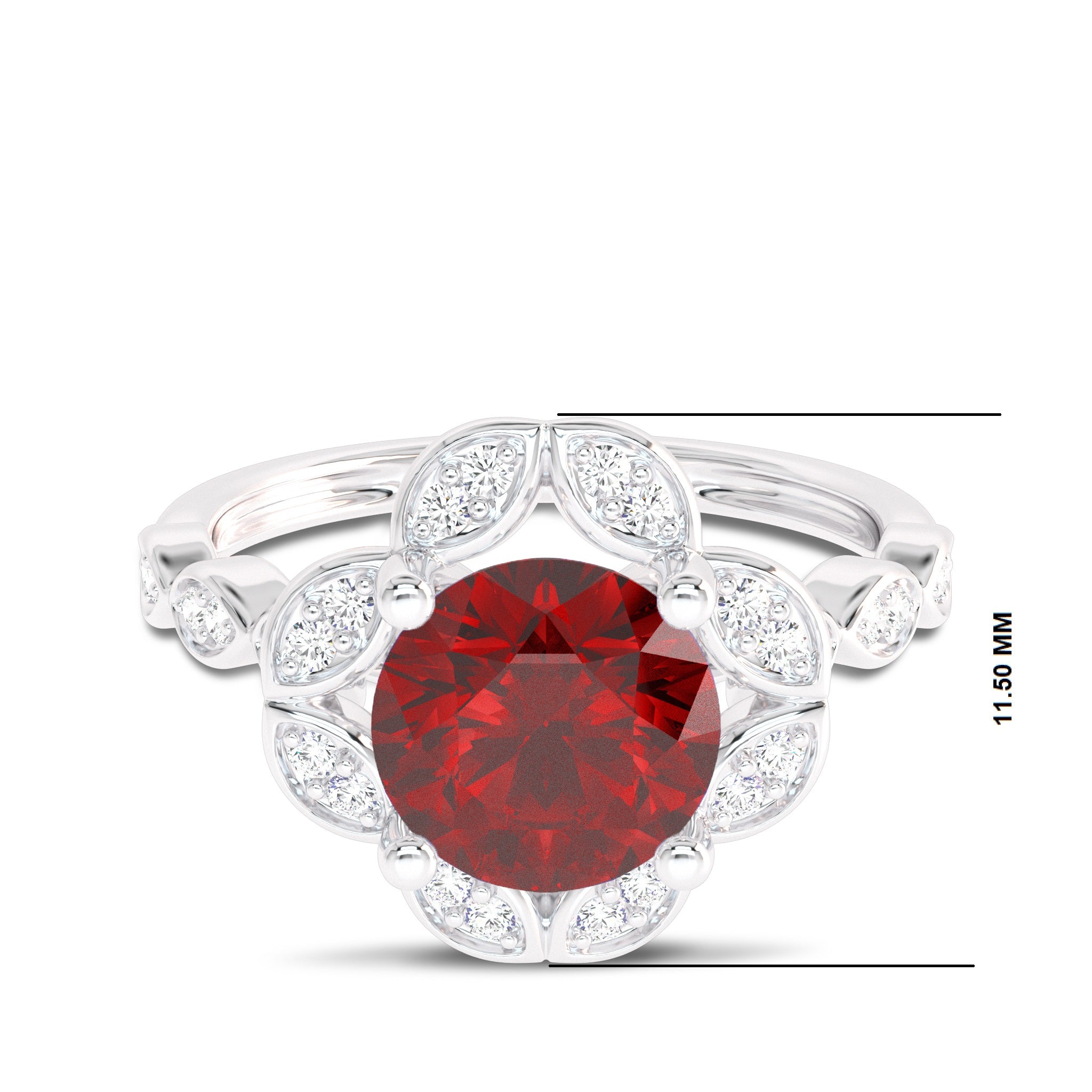The Fiery Passion Engagement Ring is a stunning piece featuring a vibrant round ruby accompanied by sparkling I-J/SI quality natural diamonds. Set in a combination of pave and prong settings, this ring captures the essence of passion and elegance, making it a striking choice for an engagement ring.