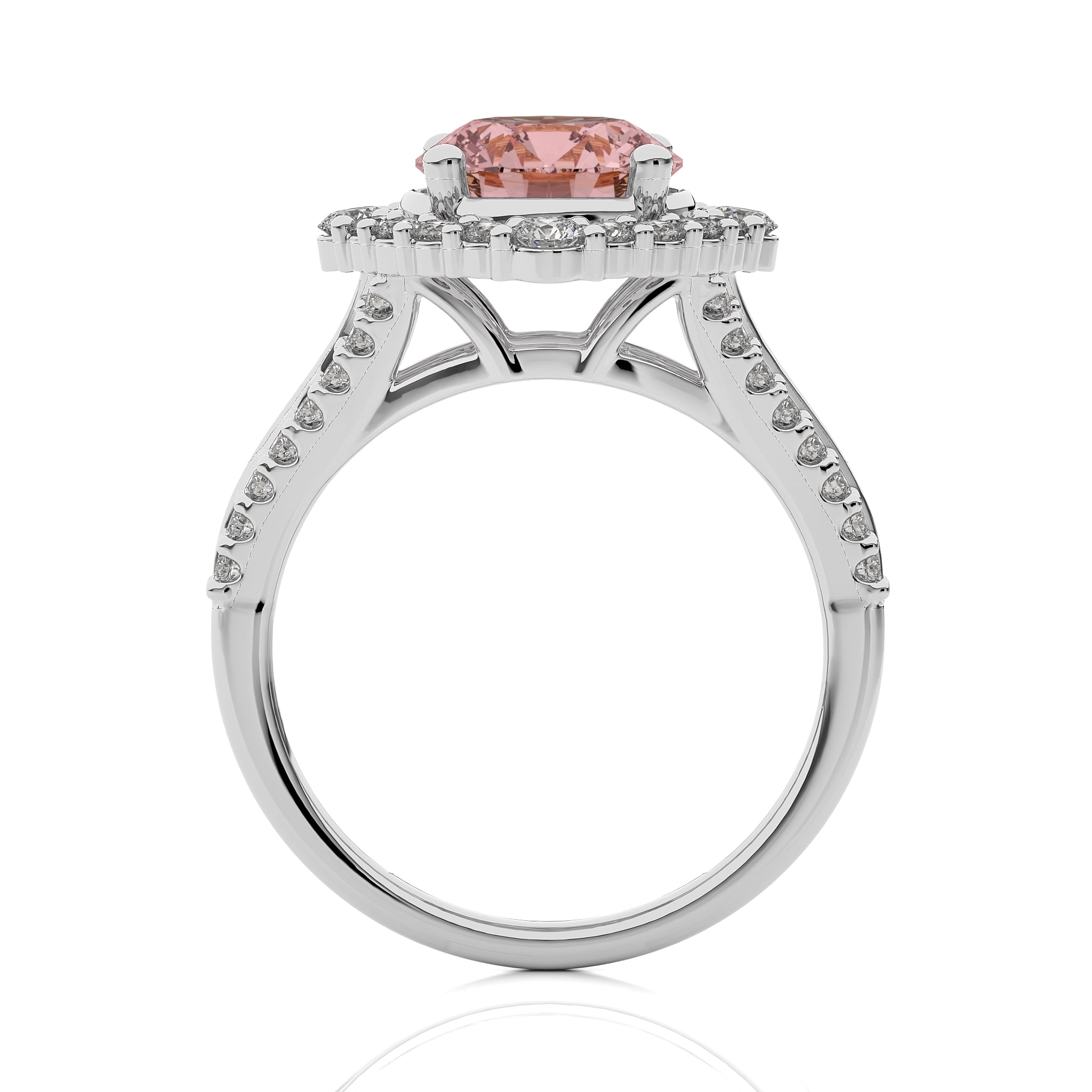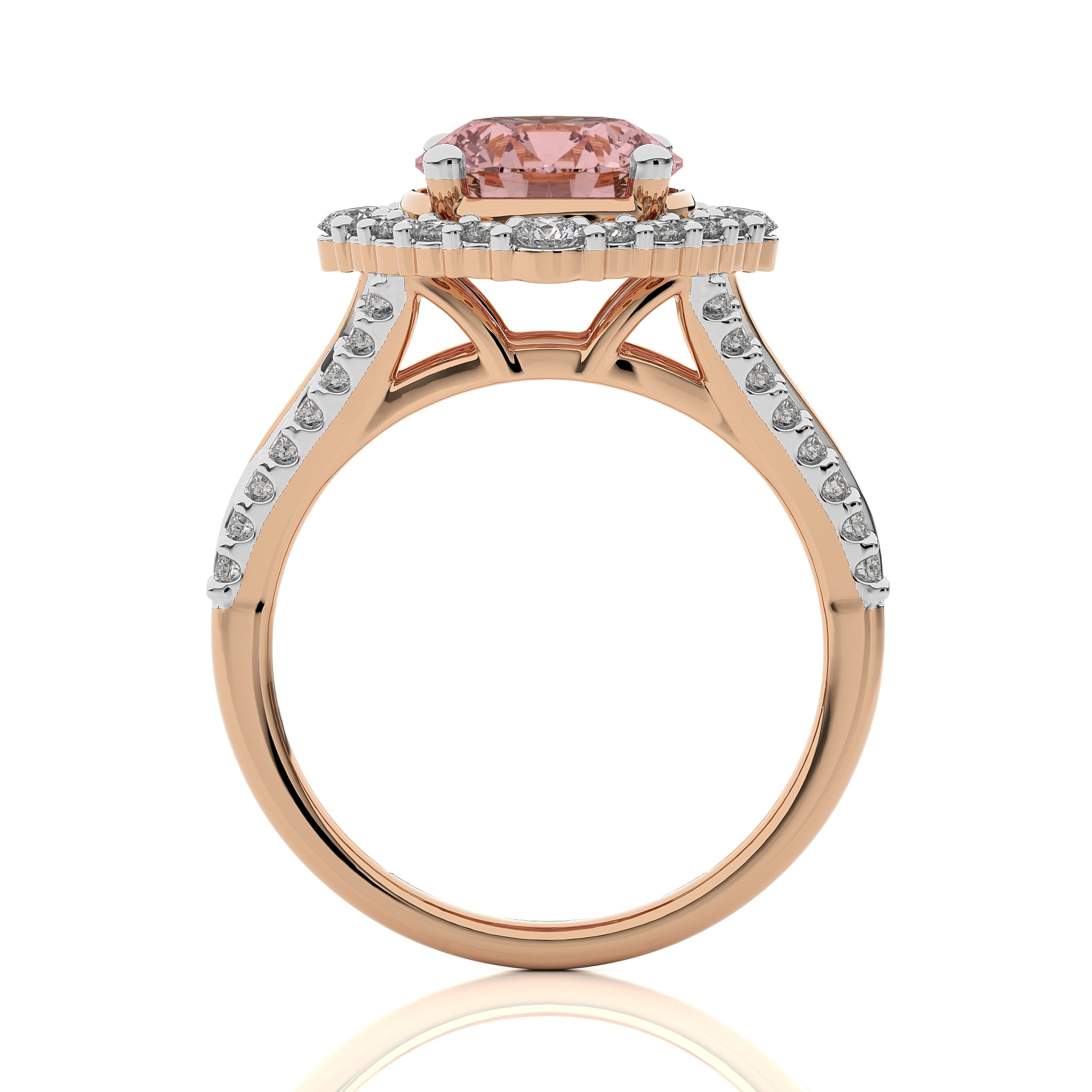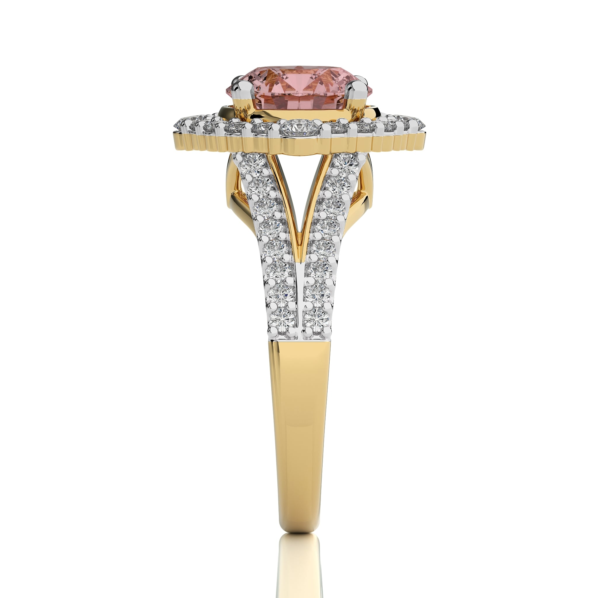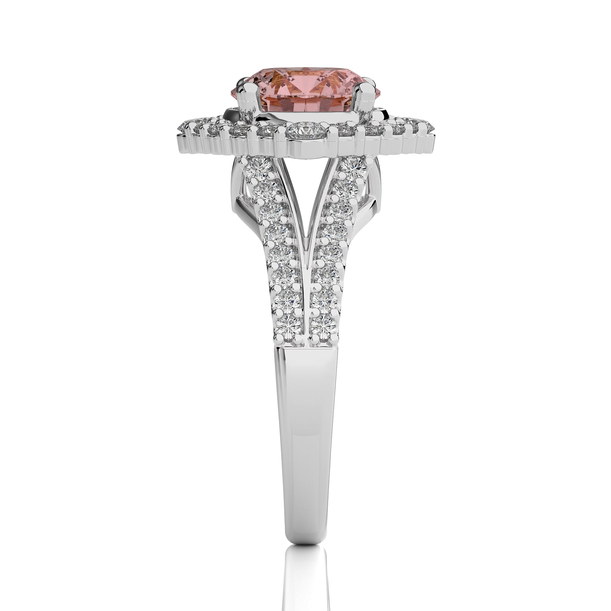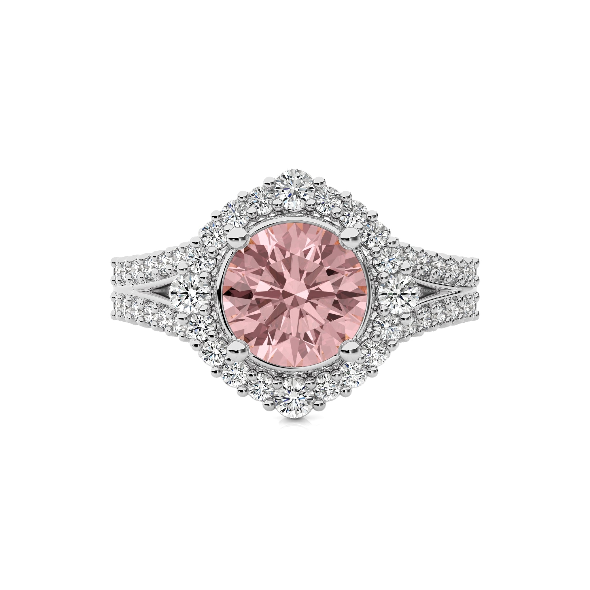 The Gentle Glow Engagement Ring showcases a brilliant round morganite gemstone with I-J/SI quality natural diamonds, set in a prong setting. Its unique twisted wire V shank design adds a modern twist to the classic elegance, making it a captivating choice for any engagement.