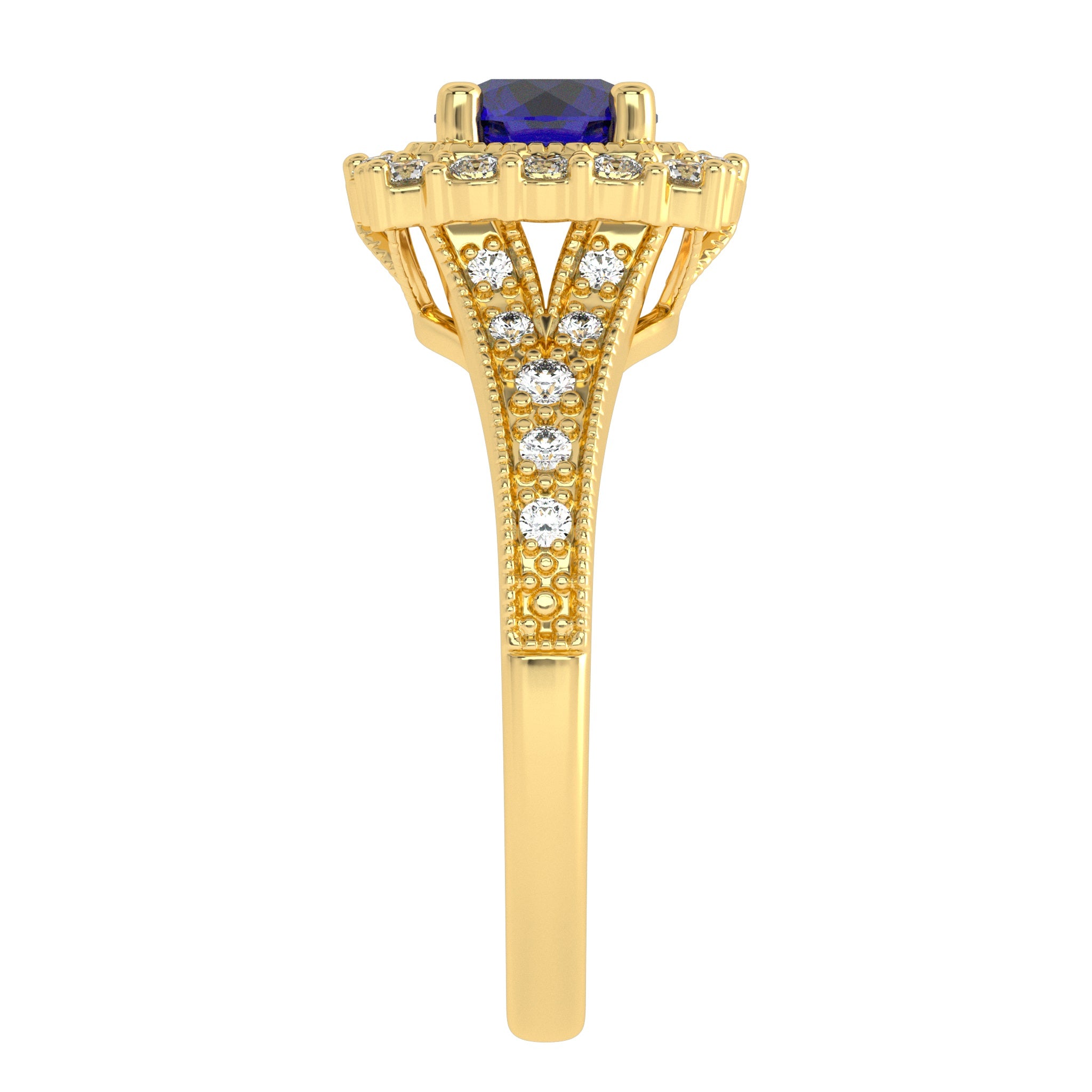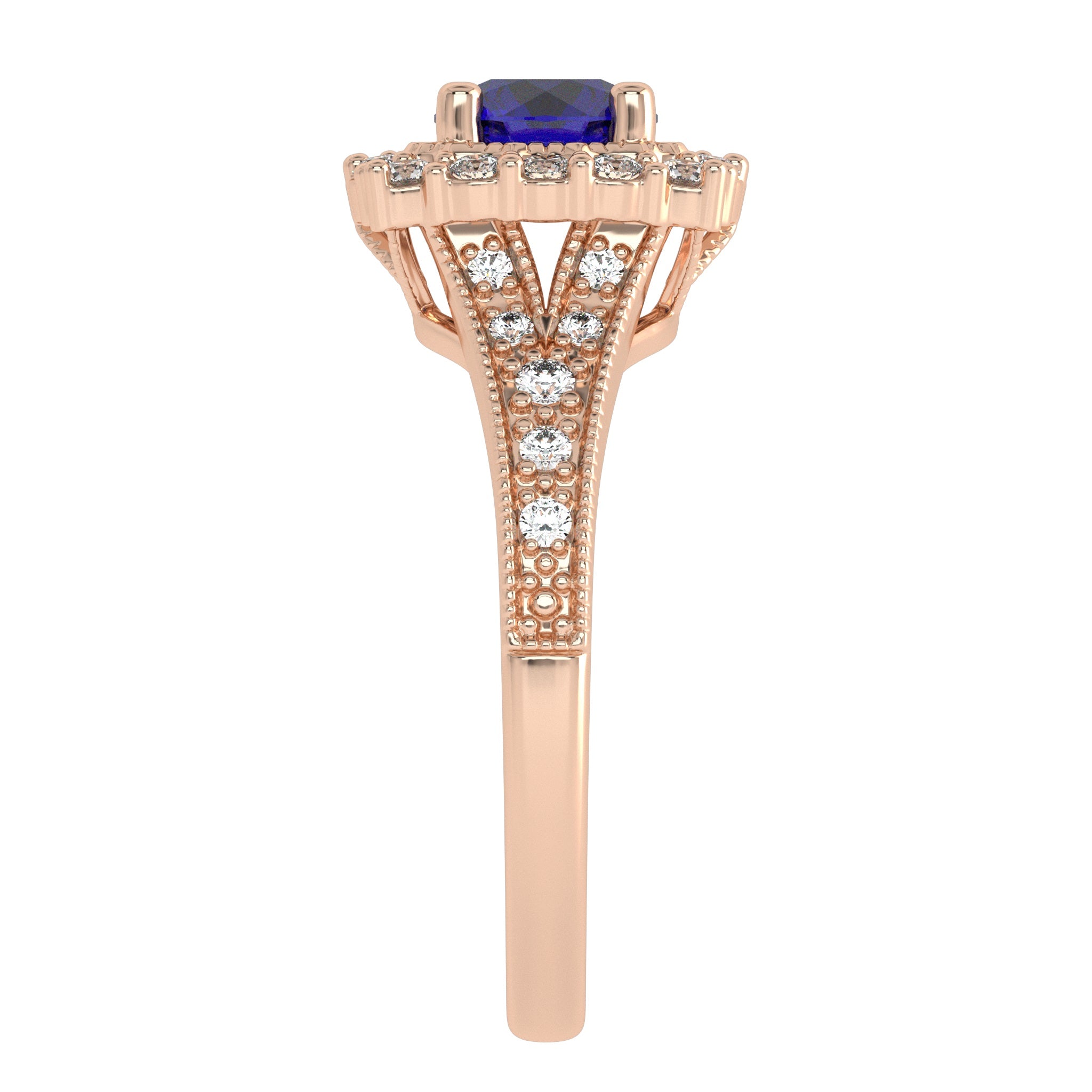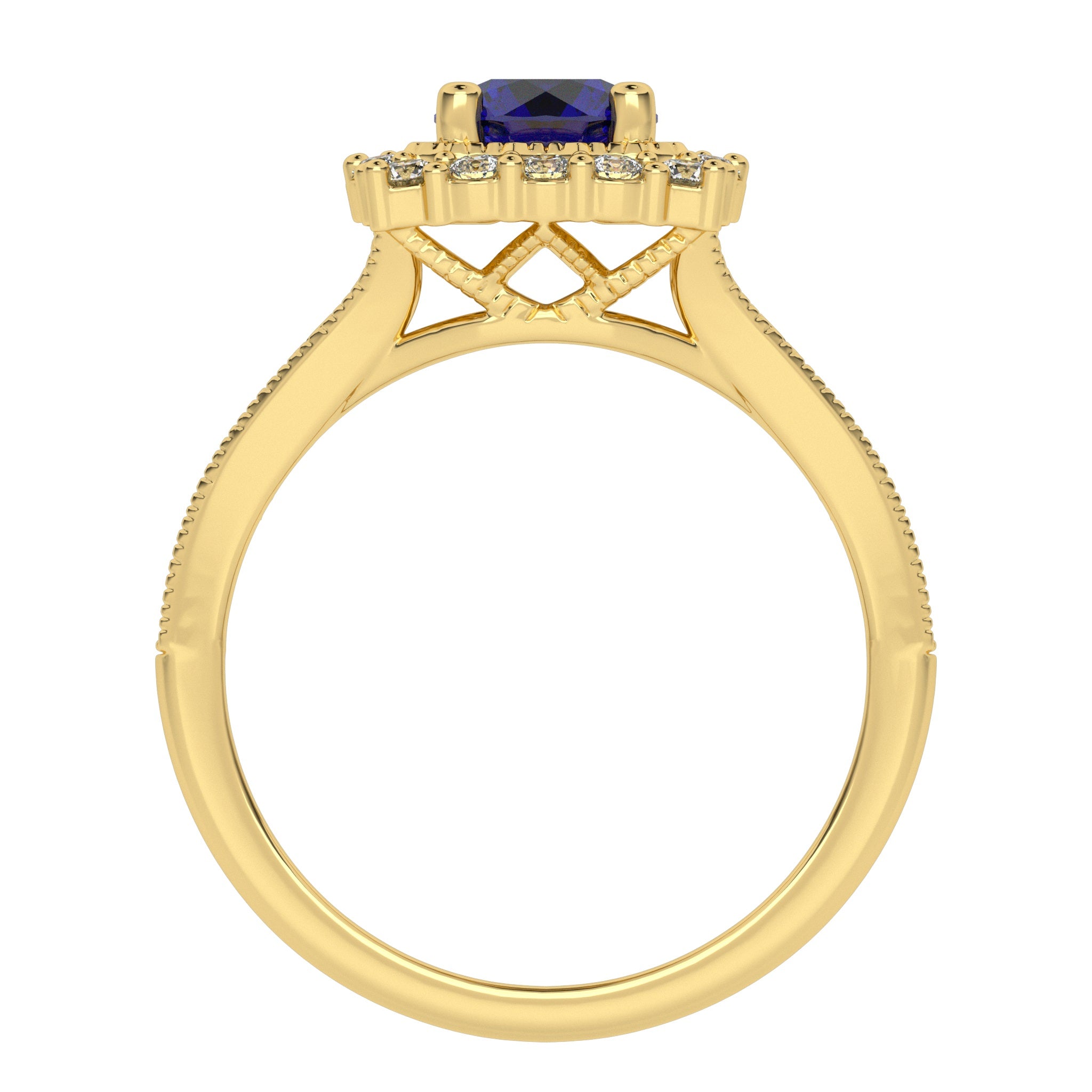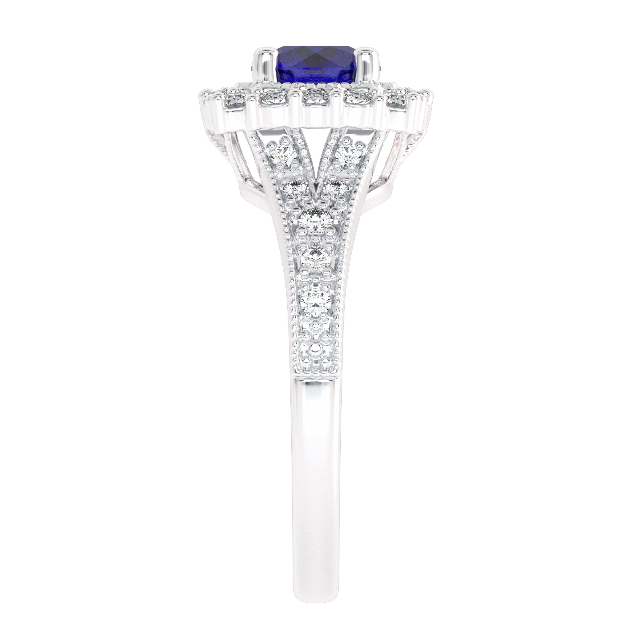 The Retro Romance Engagement Ring features a round blue sapphire and natural diamonds set in high-quality I-J/SI diamonds in a vintage-inspired design with a prong setting. This ring is a perfect blend of retro charm and timeless elegance.