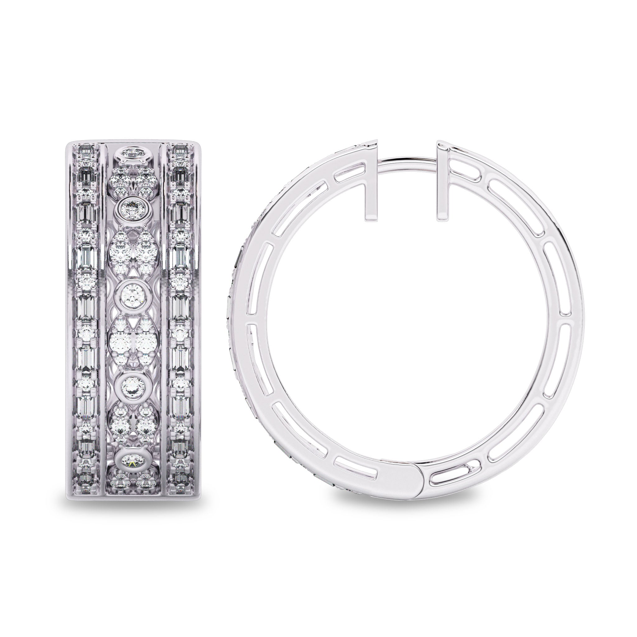 Elevate your elegance with our 1 1/2 CT. Lab Created Round and Baguette Diamond Studded Designer Hoop Earrings. Impeccable DEF/SI quality diamonds are meticulously set within a combination of prong, micro split, and bezel settings, creating a timeless and captivating pair that adds a touch of luxury and brilliance to your look