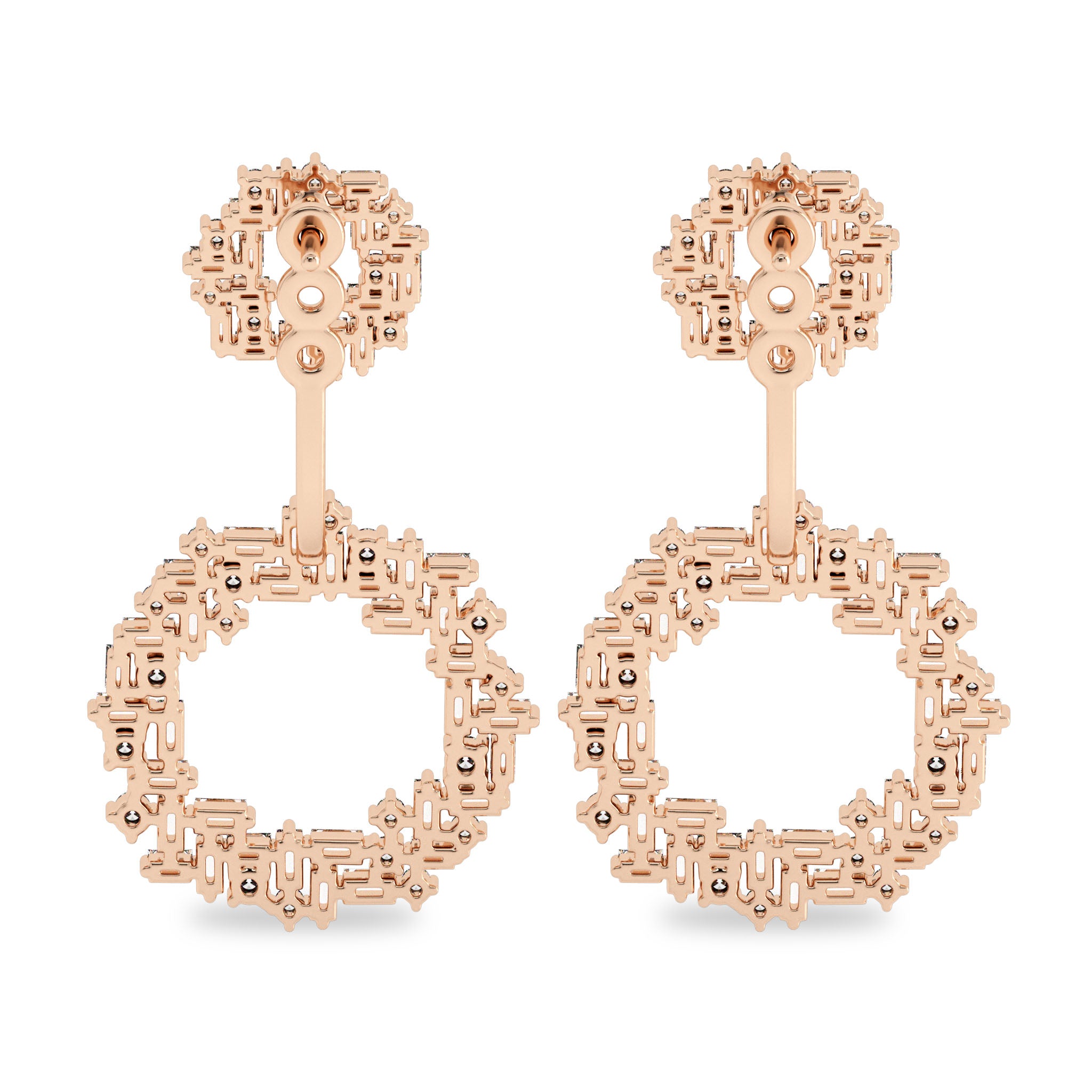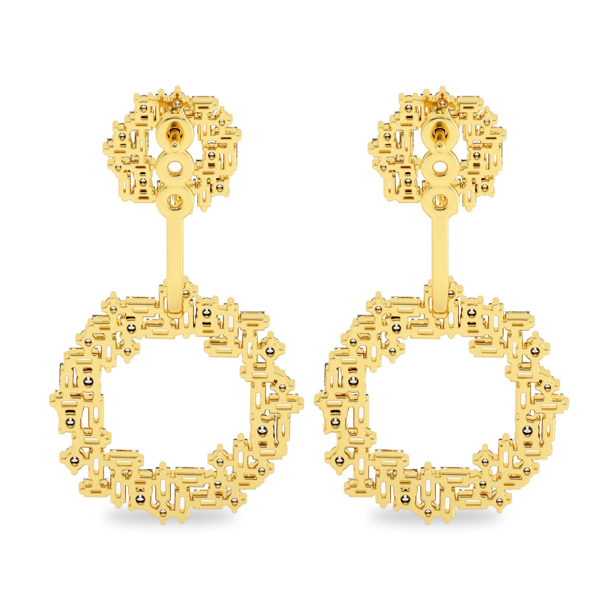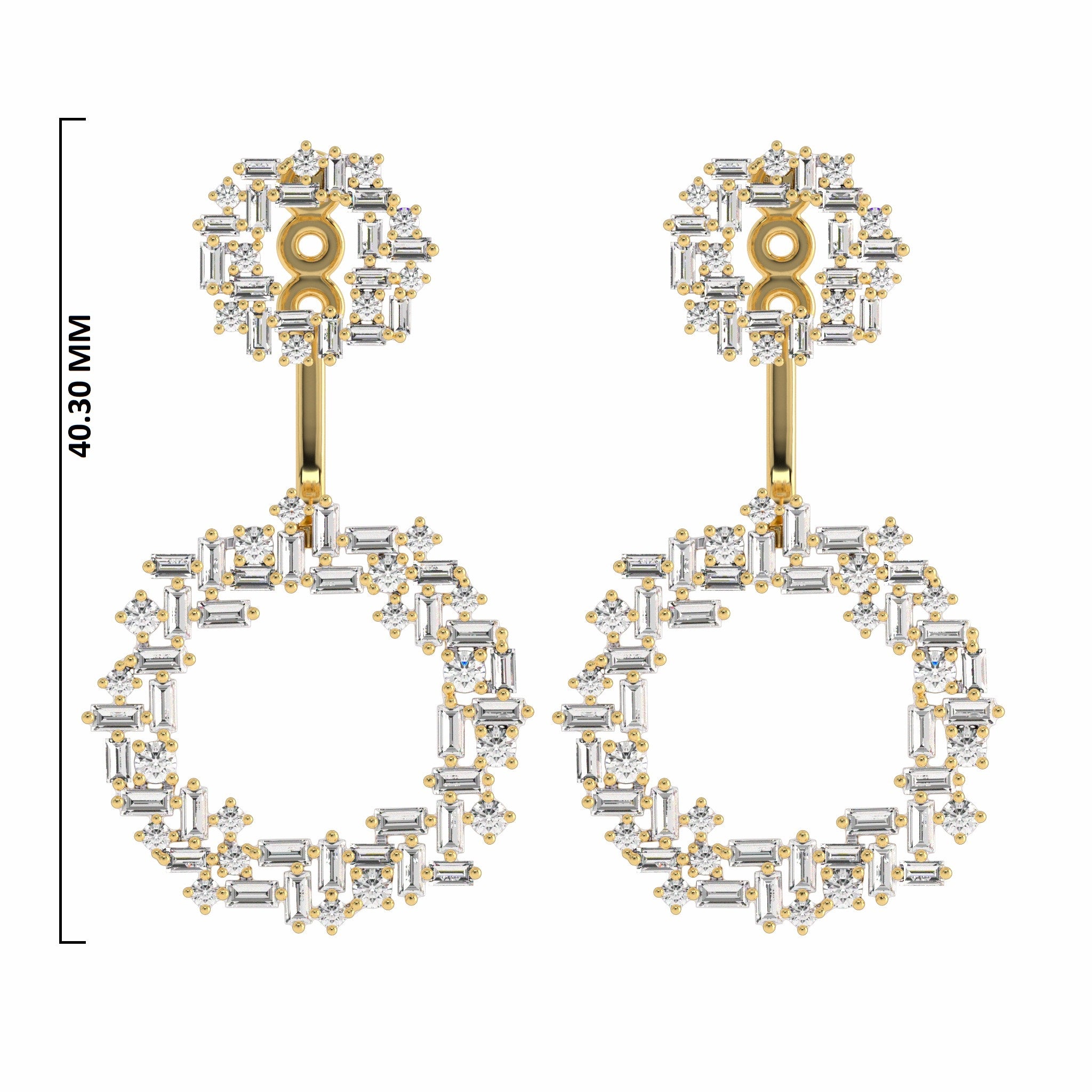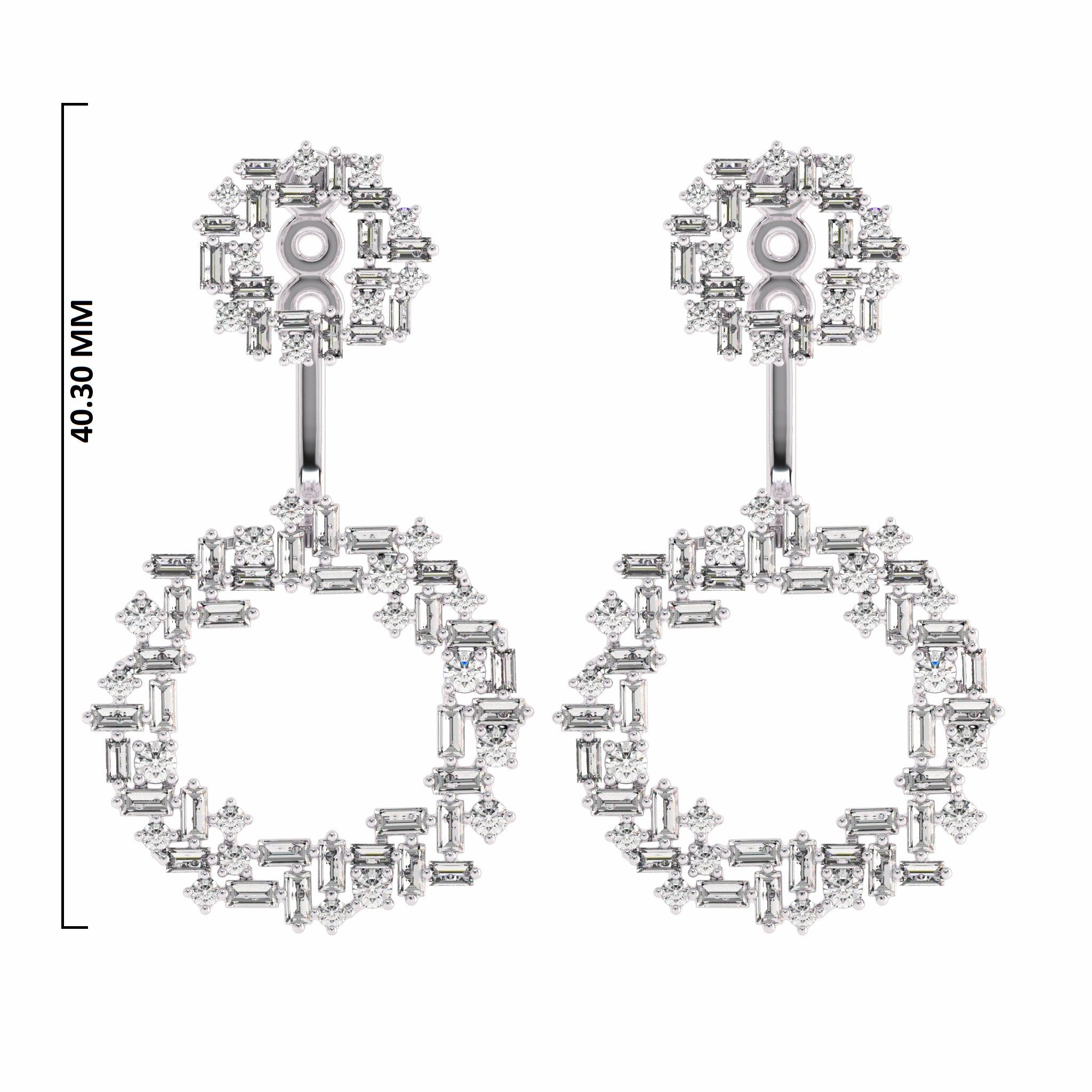 Unveil the symphony of light with our 2 3/4 CT. Lab Created Round and Baguette Diamond Studded Designer Cubism Circular Dangling Hoop Earrings. A unique masterpiece that harmonizes the brilliance of DEF Color and SI Clarity diamonds in both round and baguette cuts.These diamonds, carefully secured in a prong setting, create a mesmerizing dance of shapes and sparkle