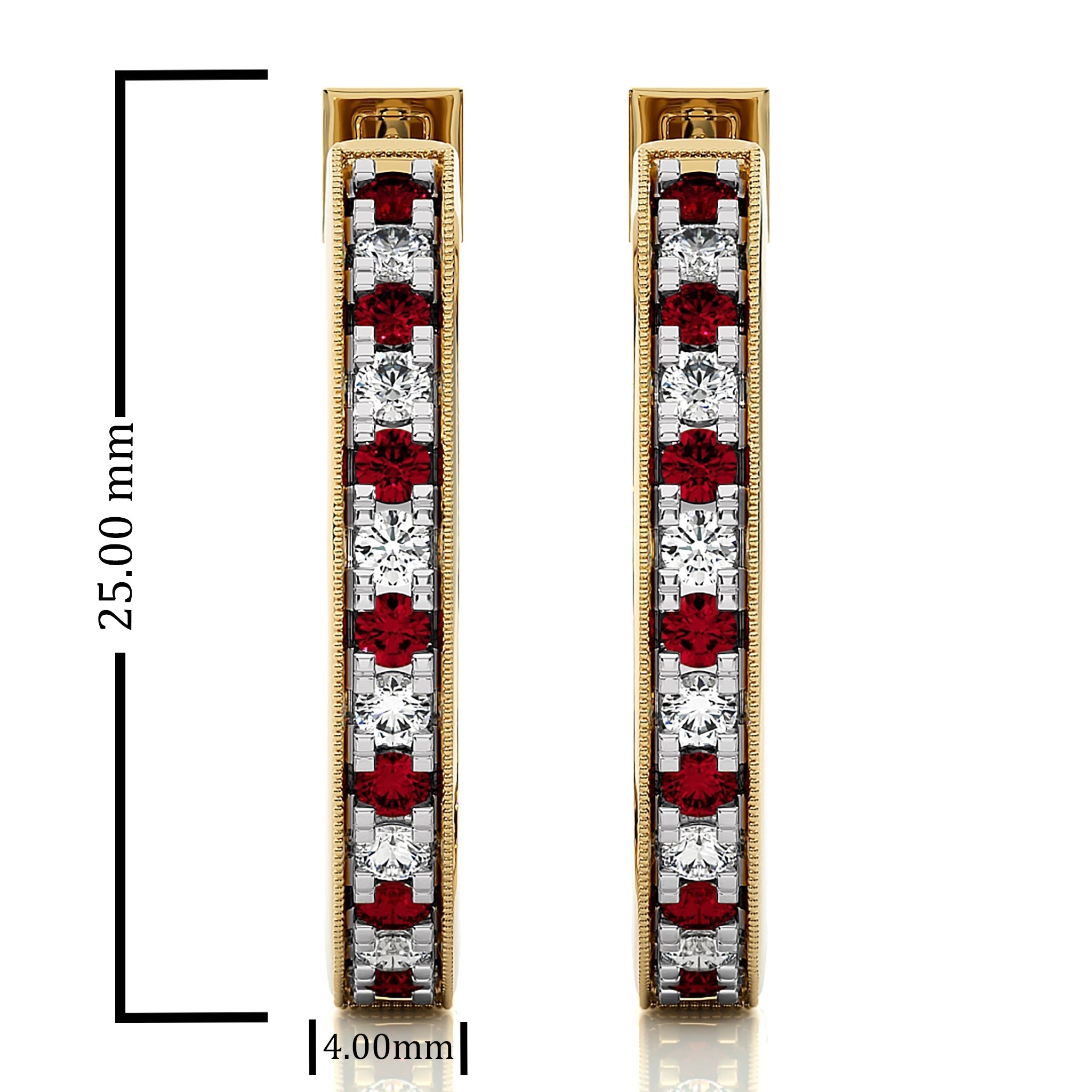 Pamper yourself with these 2 CT. Round Natural Diamond and Ruby Inside Out Hoop Earrings. The elegant design features alternating diamonds H-I/I1-I2 and radiant rubies, set in a micro-split style for a stunning visual effect. A perfect way to add a touch of glamour to any look. Impress with elegance at your next special occasion with these earrings