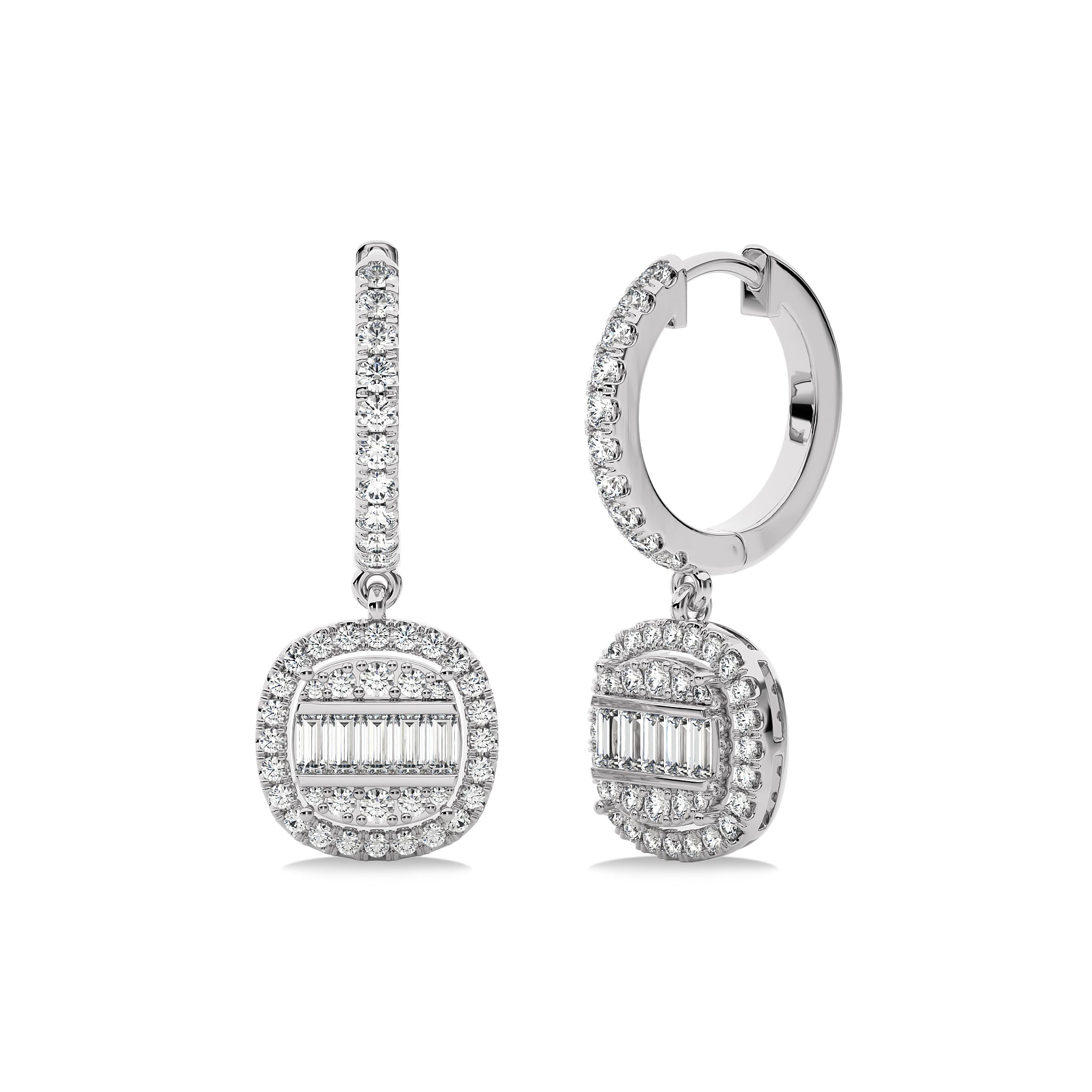 7/8 CT. Baguette and Round Natural Diamond Lever back Halo Drop Earrings