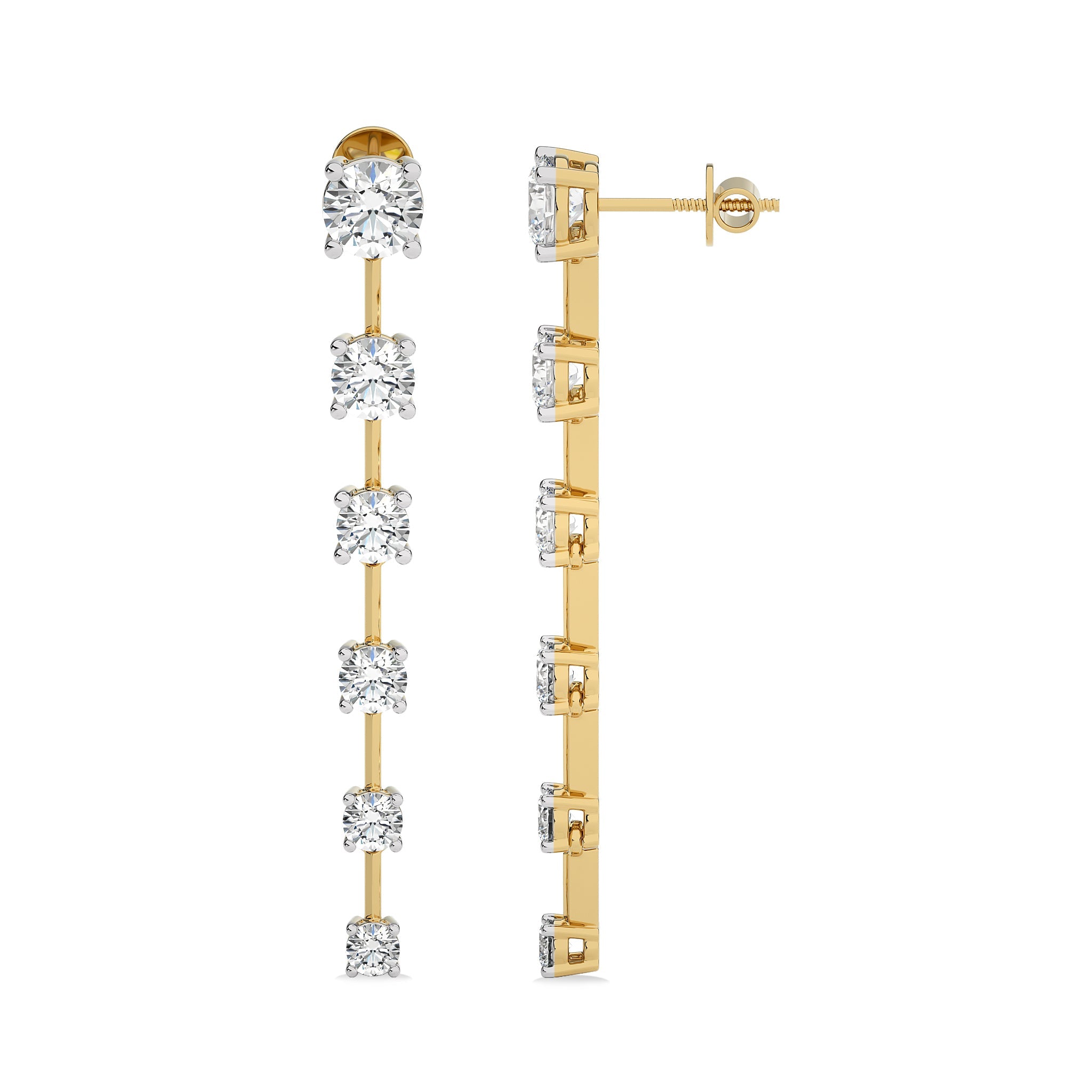 Command attention with these stunning 3 CT. Six Stone Round Natural Diamond Gradual Drop Earrings, featuring H-I/I1-I2 quality diamonds set in a prong setting. Their elegant design and radiant sparkle make them the perfect accessory to elevate any outfit, ensuring you shine on every occasion