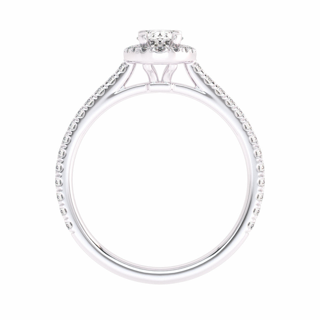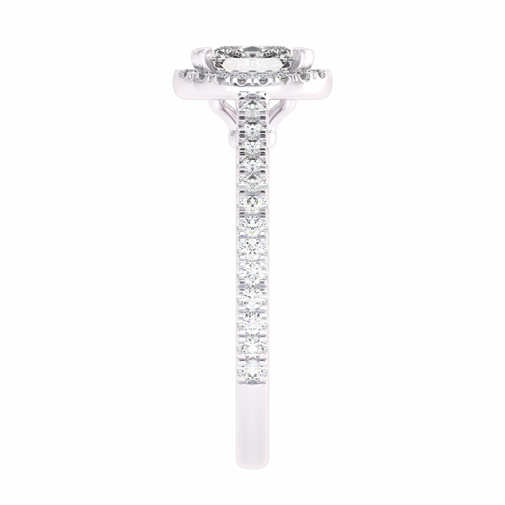 A Classic Halo Engagement Ring with a Glowing 1/2 carat center diamond in a prong setting, surrounded by 1/3 carat lab Created diamonds set in micro Spilt, creates a classic and elegant ring with a total weight of 3/4 carat. The DEF/SI quality diamonds making this a truly magnificent piece of Jewelry