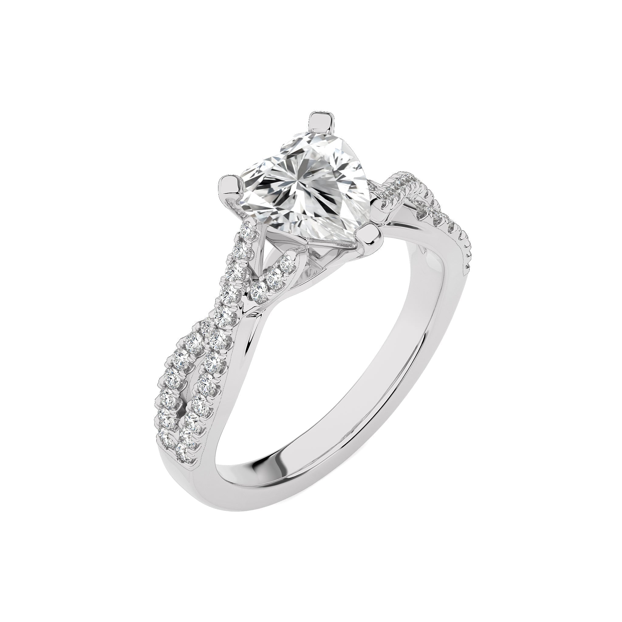 Embrace the beauty of the Dynamic Twist Heart Lab Created Diamond Engagement Ring. Showcasing a brilliant 1 1/2 carat heart shaped center stone, this 1 3/4 total carat piece is crafted in DEF/SI quality. The micro split and prong setting enhances its contemporary charm, making it an unforgettable symbol of love