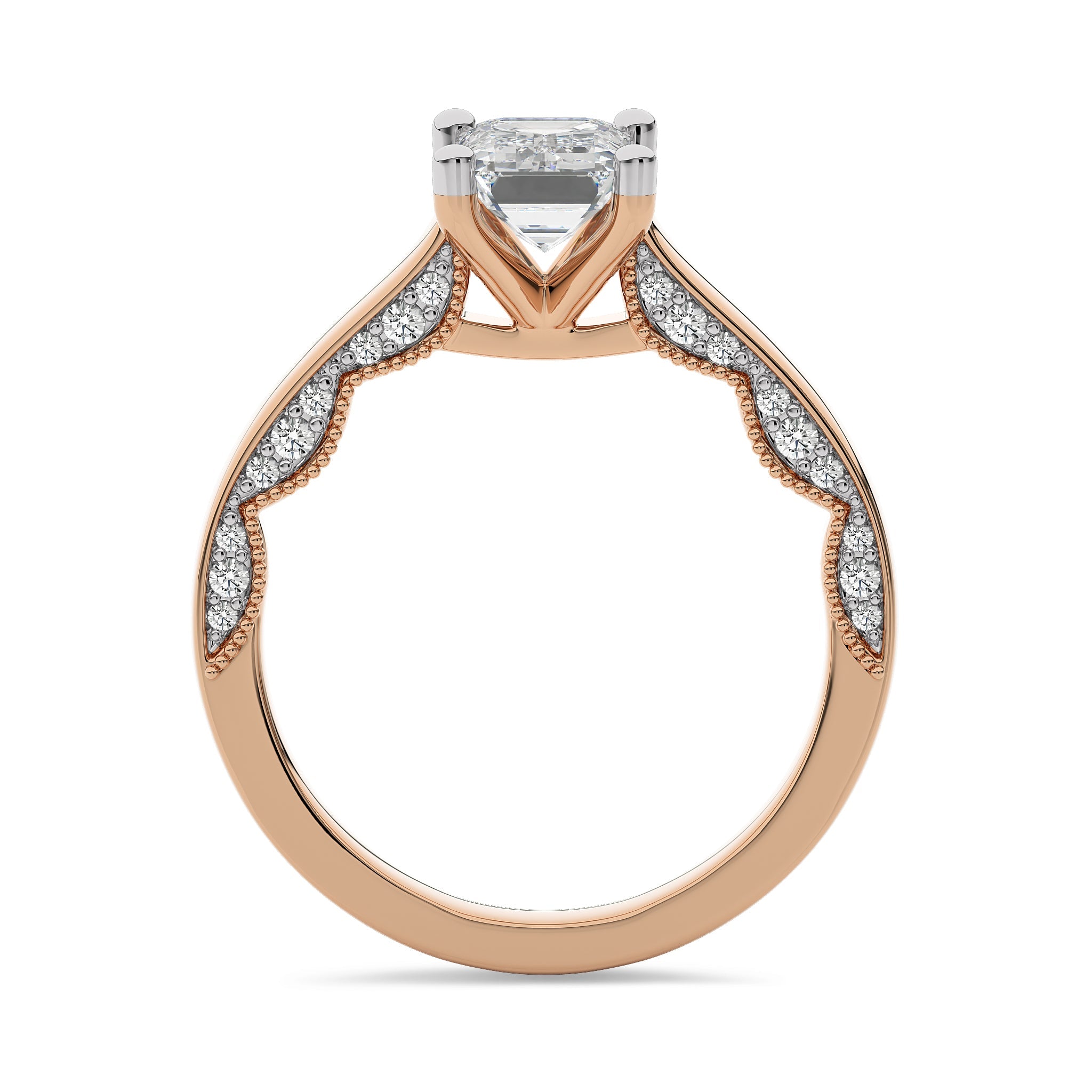 Showcase your style with this vintage 1 3/4 carat emerald cut solitaire Lab Created diamond engagement ring. The studded edge offers a classic touch, while the pave and prong settings highlight the DEF color, SI clarity diamond's dazzling brilliance. Celebrate your special moments with this timeless and striking ring