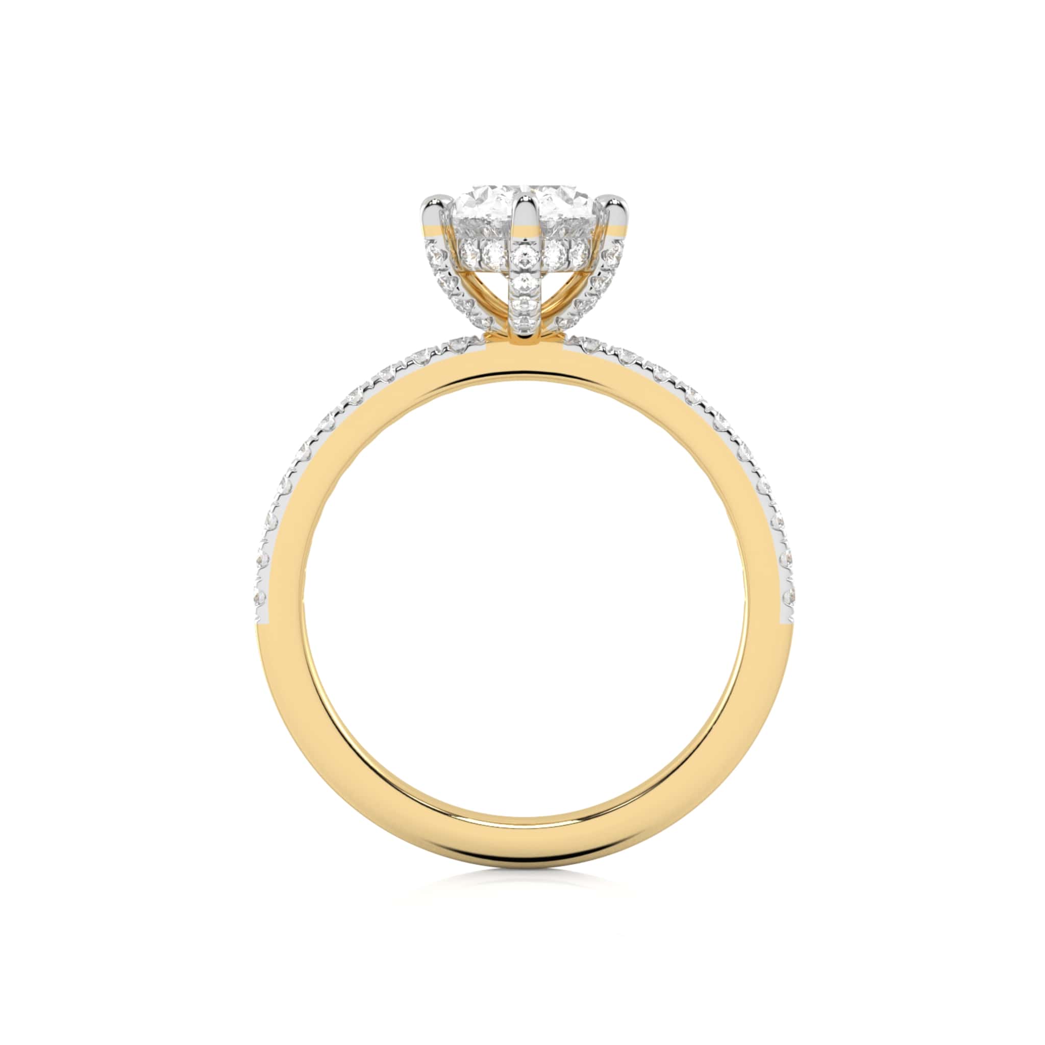 Presents a mesmerizing 2 carat oval center stone alongside 1/4 carat round side stones crafted with lab-created diamonds of DEF/SI quality, it shines as an everlasting symbol of romance and beauty