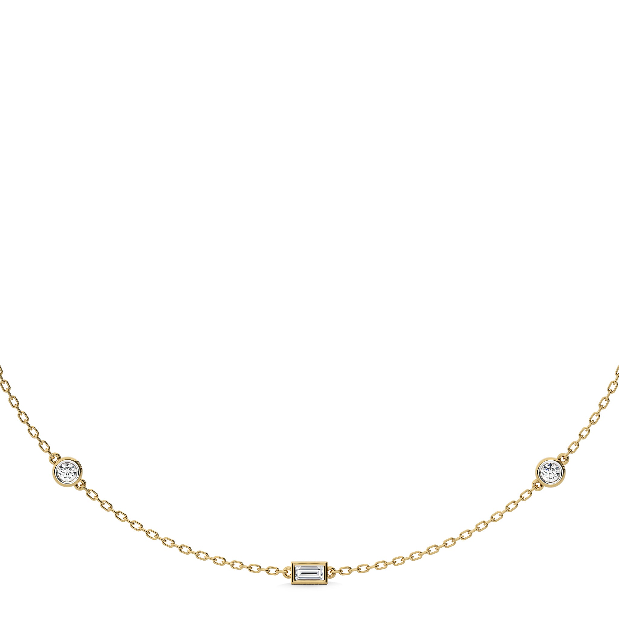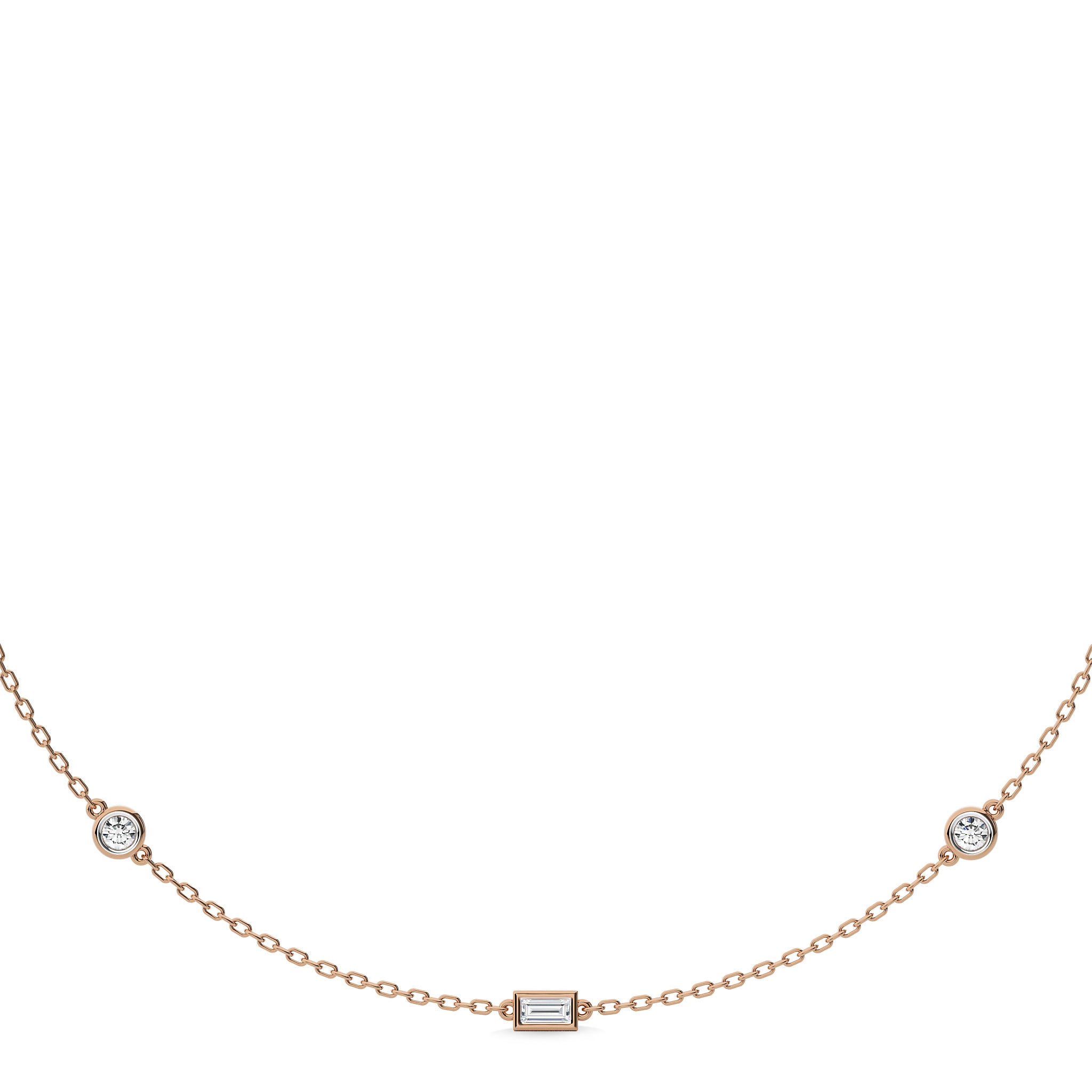 Savor the elegance of our Zenith Brilliance Fusion Necklace, a stunning blend of baguette and round Lab Created diamonds totaling 1 carat of DEF/SI quality,this necklace adds a touch of glamour to any outfit.The meticulous bezel setting of each diamond gives this necklace a contemporary elegance that enhances any attire