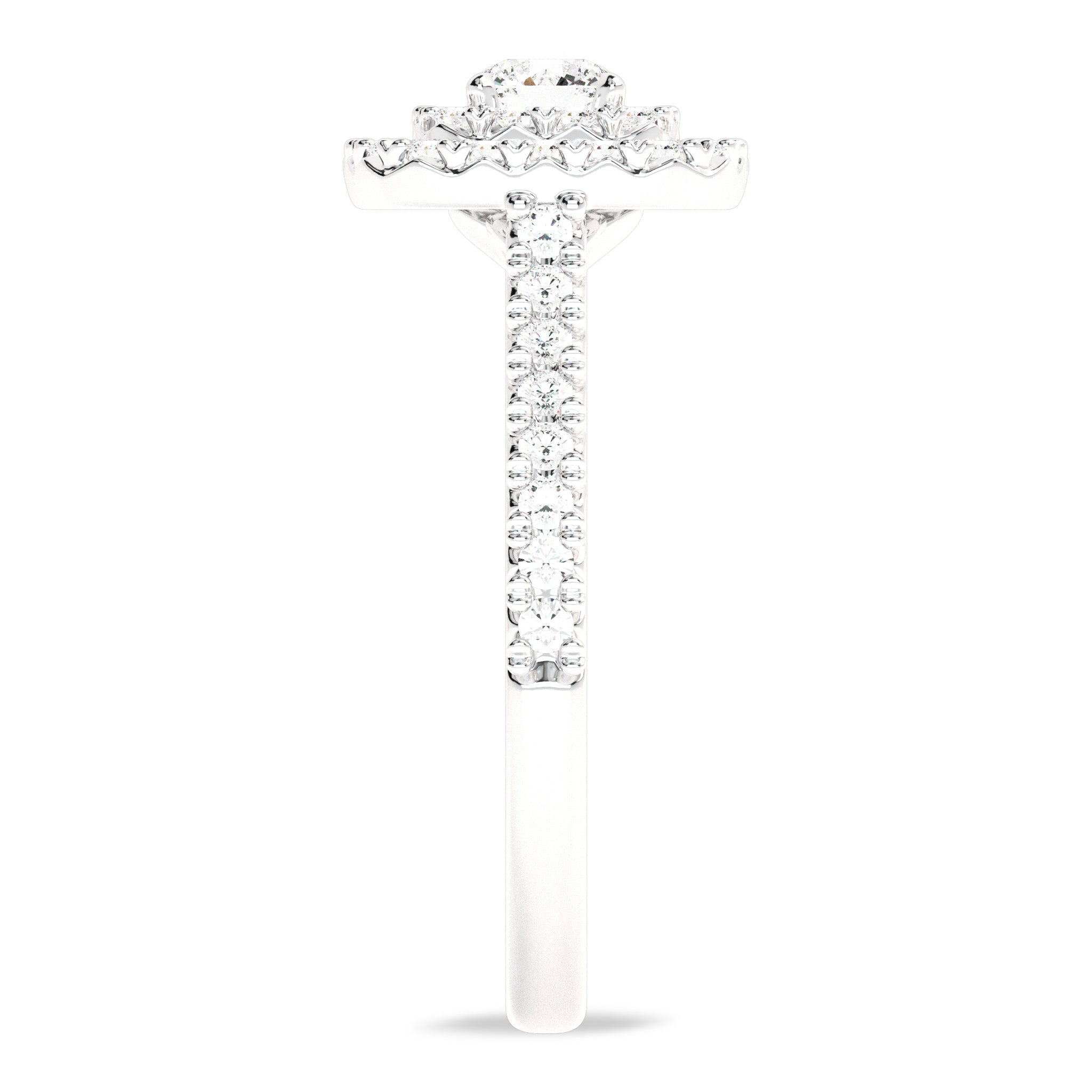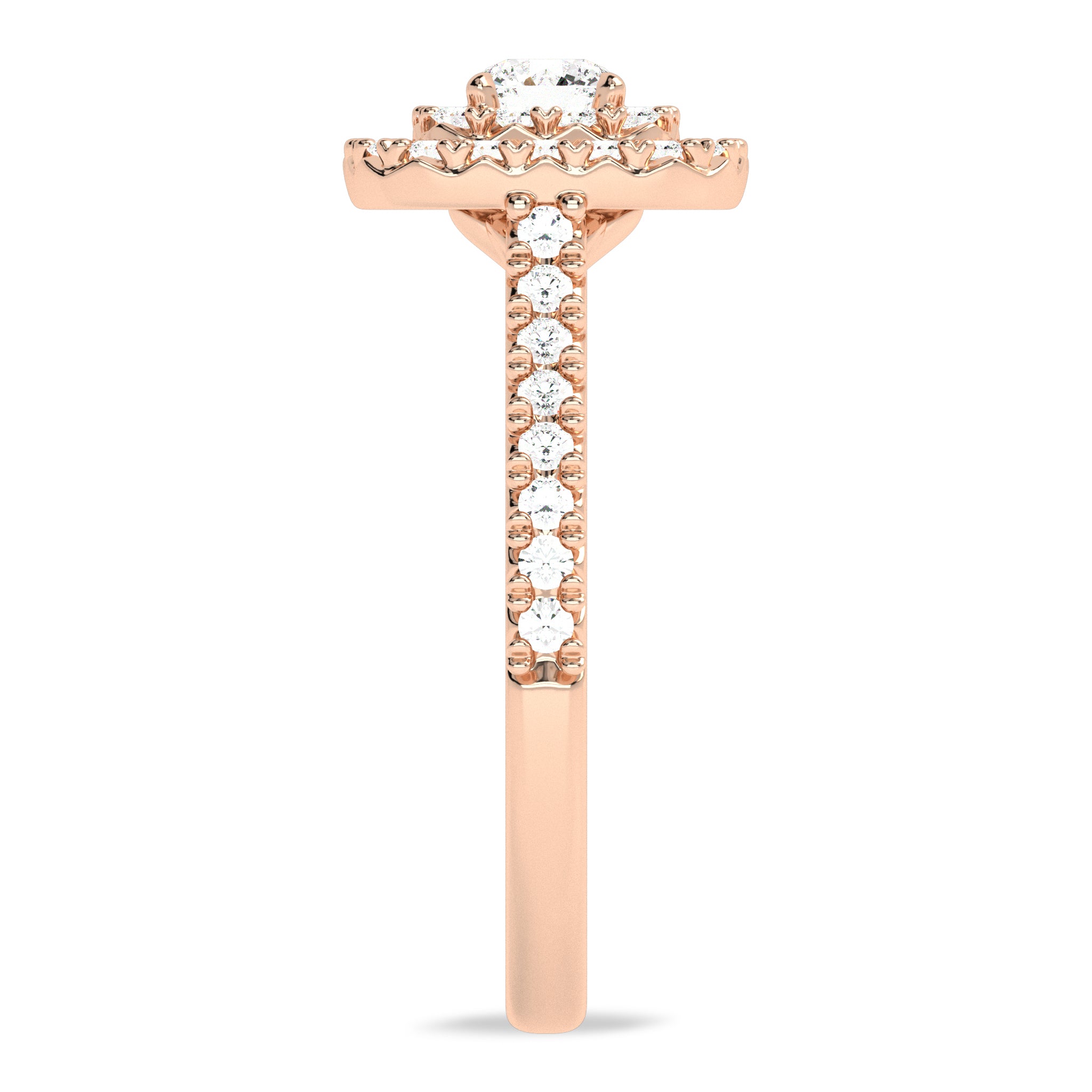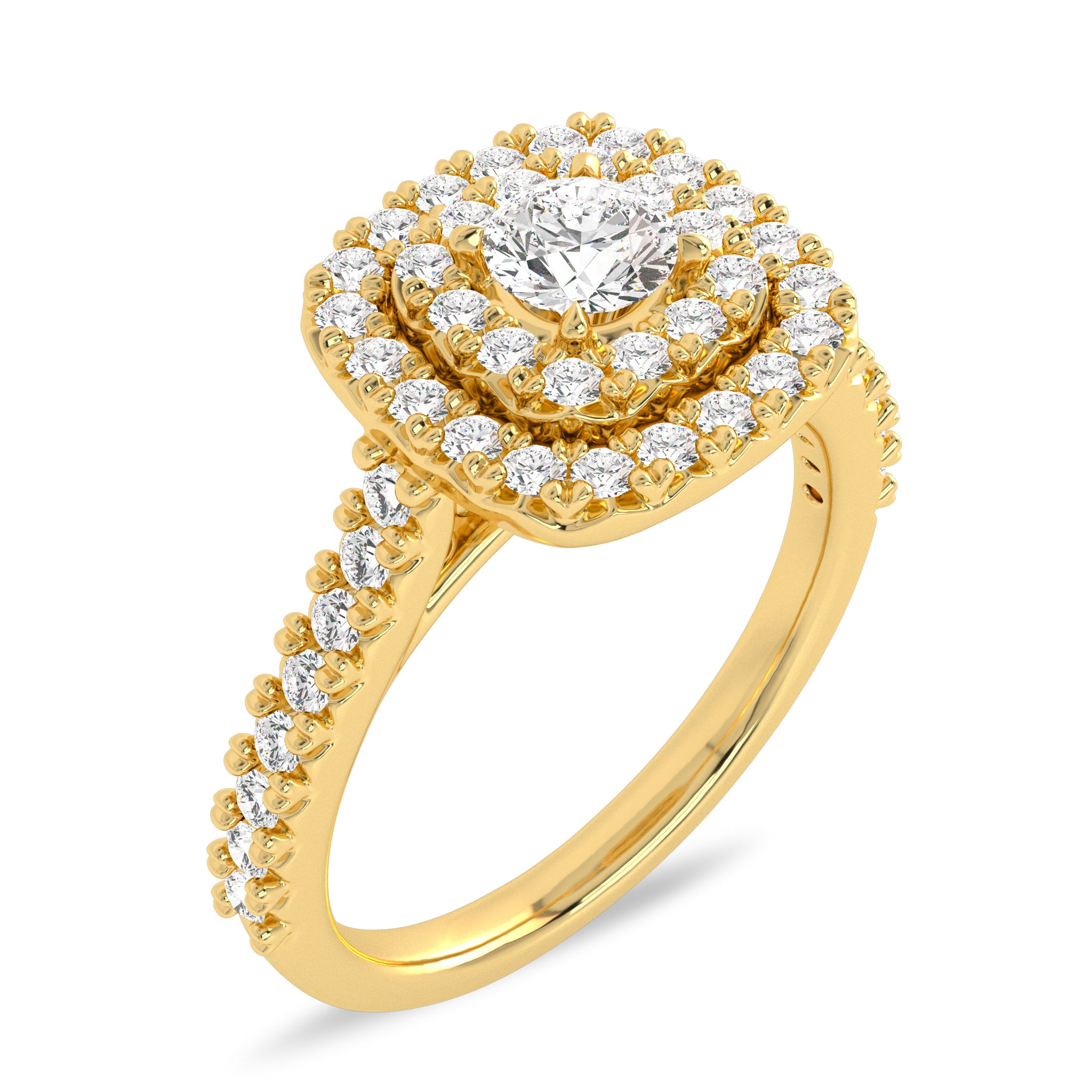 The Regal Majesty showcases a Cushion Cut Lab Created Diamond encircled by two halos of smaller diamonds, creating a mesmerizing display of sparkle and elegance. Crafted with F-G/SI quality in a micro split and prong setting,Perfect for those who appreciate classic beauty with a modern twist, this ring is a timeless piece that will be cherished for generations.