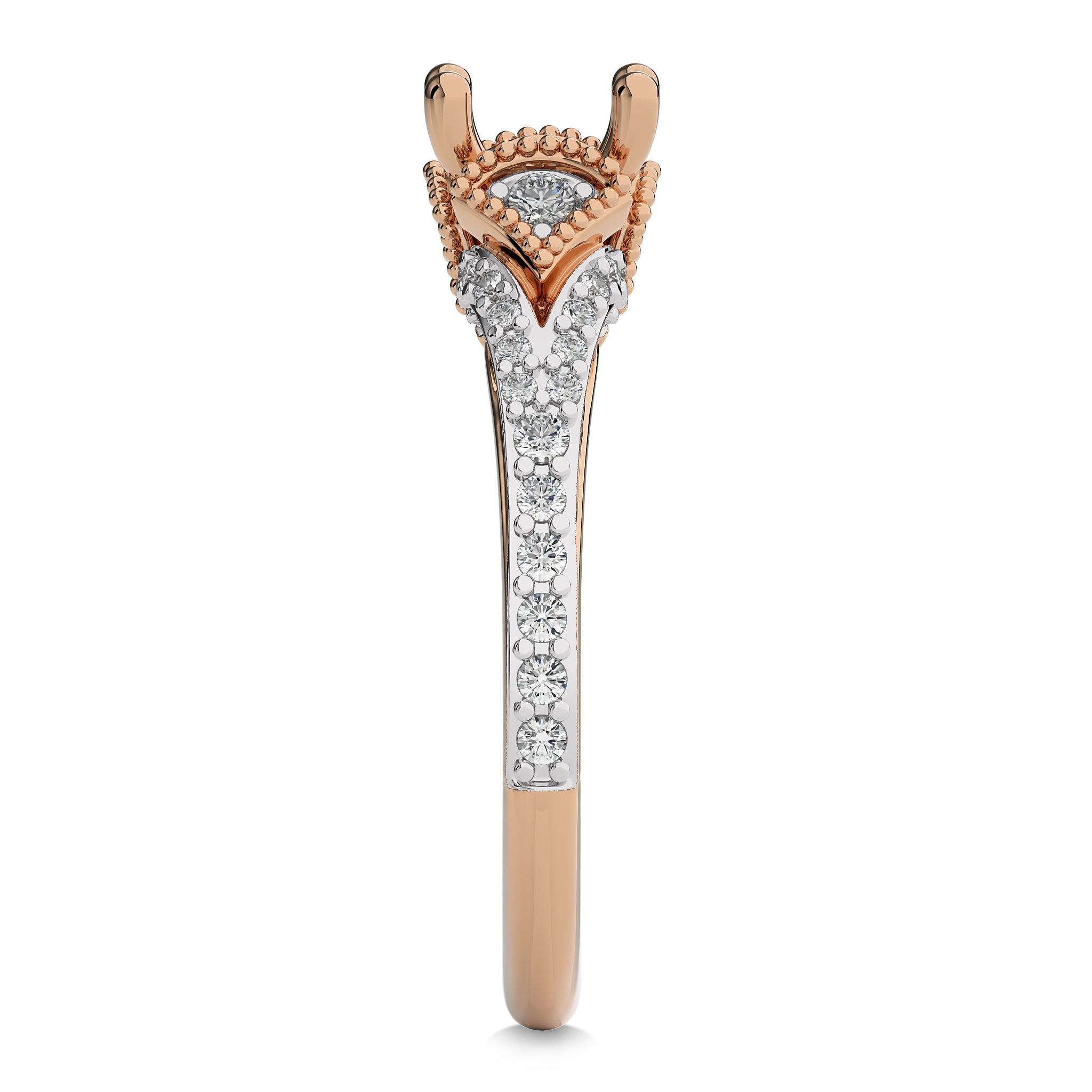 The Luminary Promise 1/2 carat round diamond, set in a split shank design that symbolizes the intertwining of two lives. The J-K/I1-I2 quality diamond sparkles with a radiant glow, symbolizing the bright future ahead. The combination of pave and prong settings adds a touch of glamour and sophistication, making this ring a stunning choice for a memorable proposal