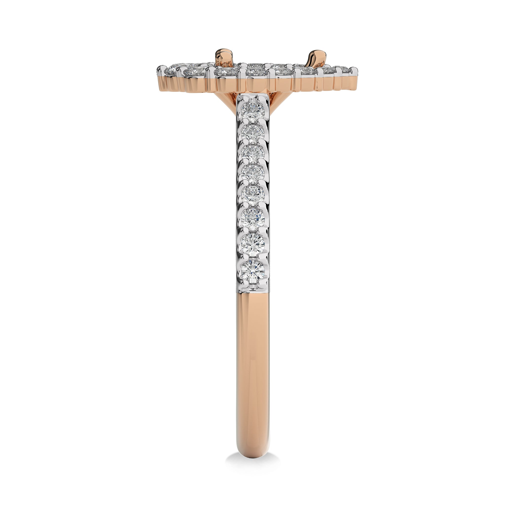 This Whispering Serenade captivating ring features a 1/2 carat round diamond of J-K/I1-I2 quality, set within a halo of sparkling diamonds. The micro split and prong settings add a touch of intricate detail and enhancing the ring's elegance, making it a perfect symbol of your enduring commitment