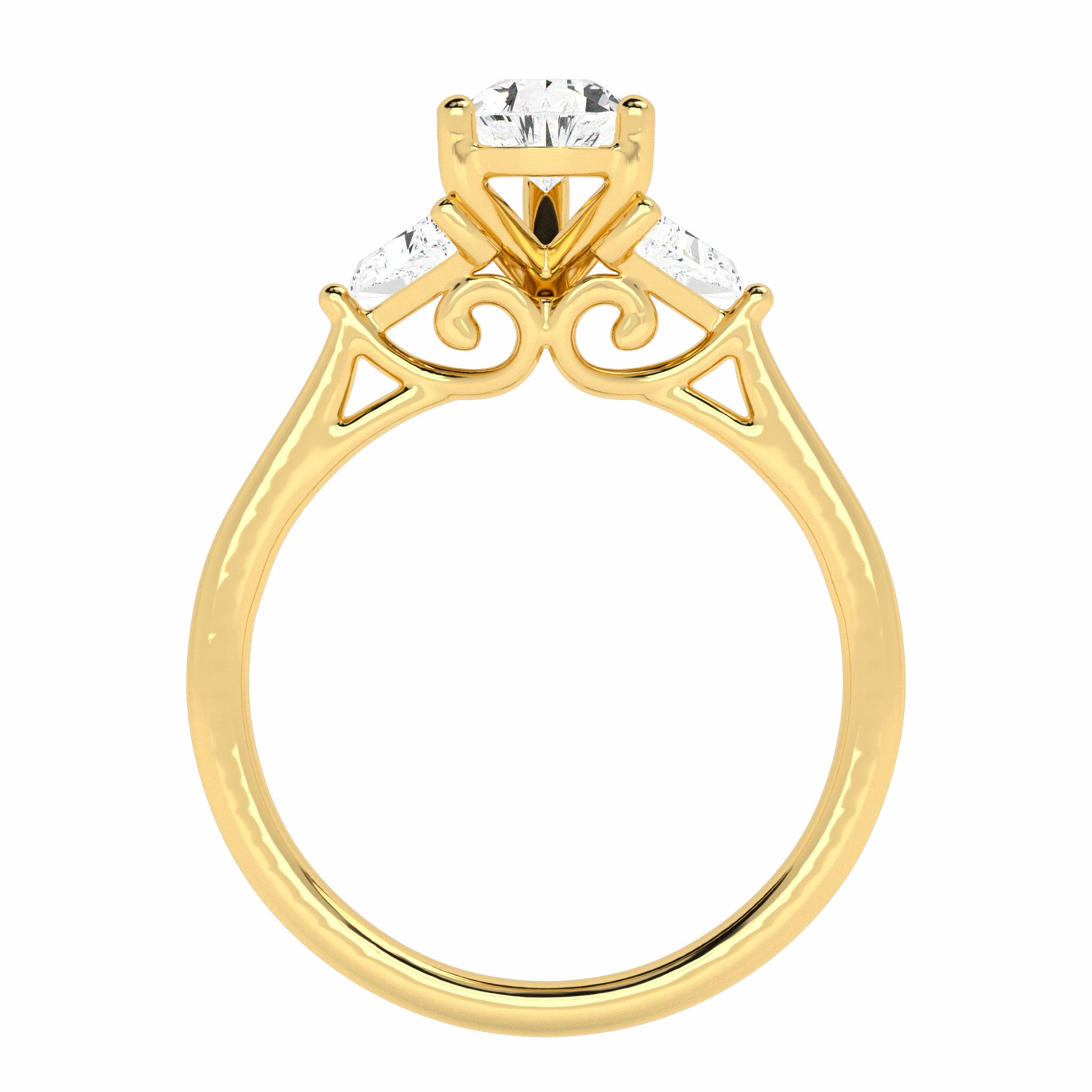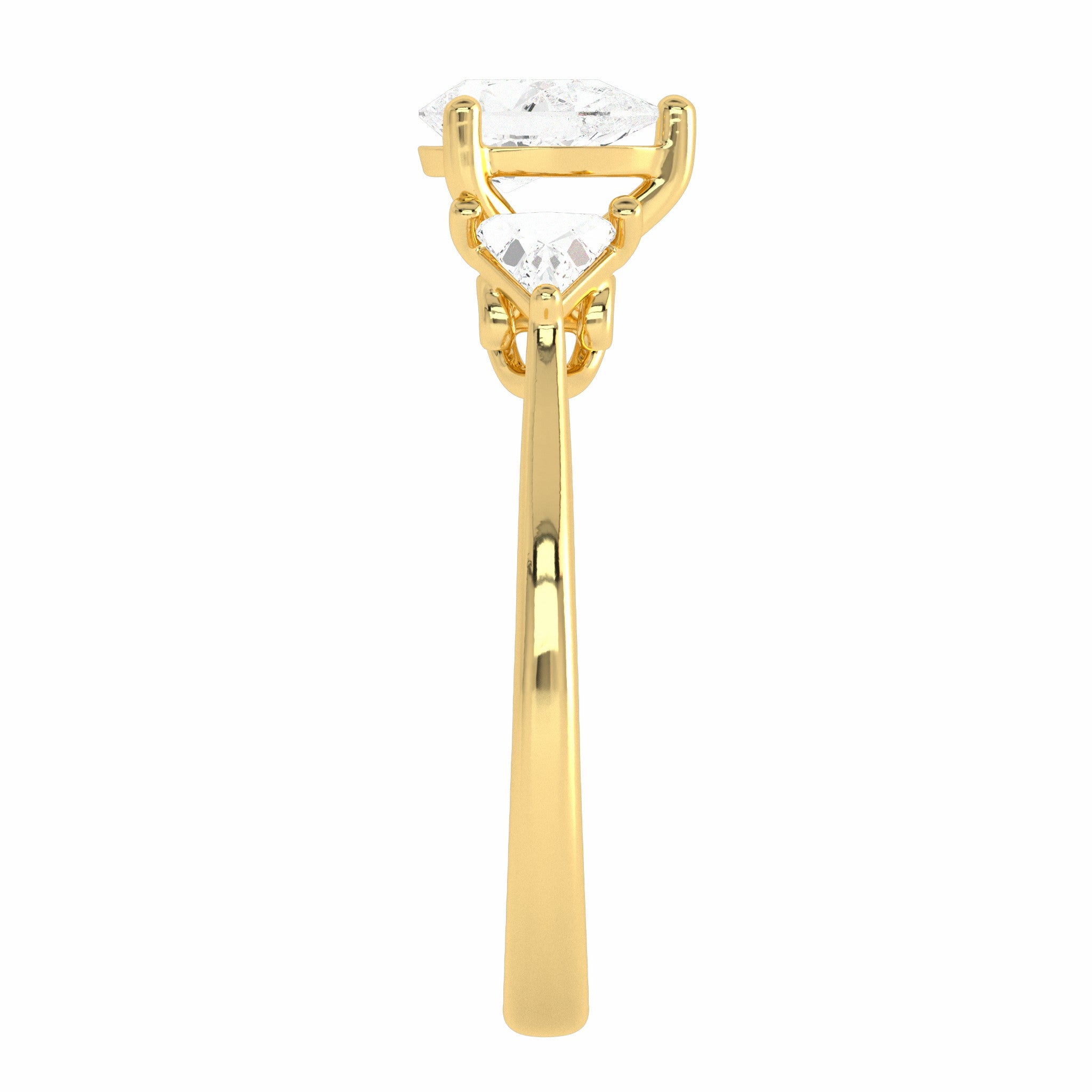 Delight in timeless elegance with our Three Stone Featuring a captivating combination of a pear cut Lab Created diamond flanked by two trapezoid cut diamonds, this ring radiates sophistication. The F-G color and SI clarity of the diamonds ensure exceptional quality and brilliance. Set in a classic prong setting, this ring exudes understated luxury and contemporary allure. Perfect for commemorating special moments or adding a touch of glamour to your everyday look.