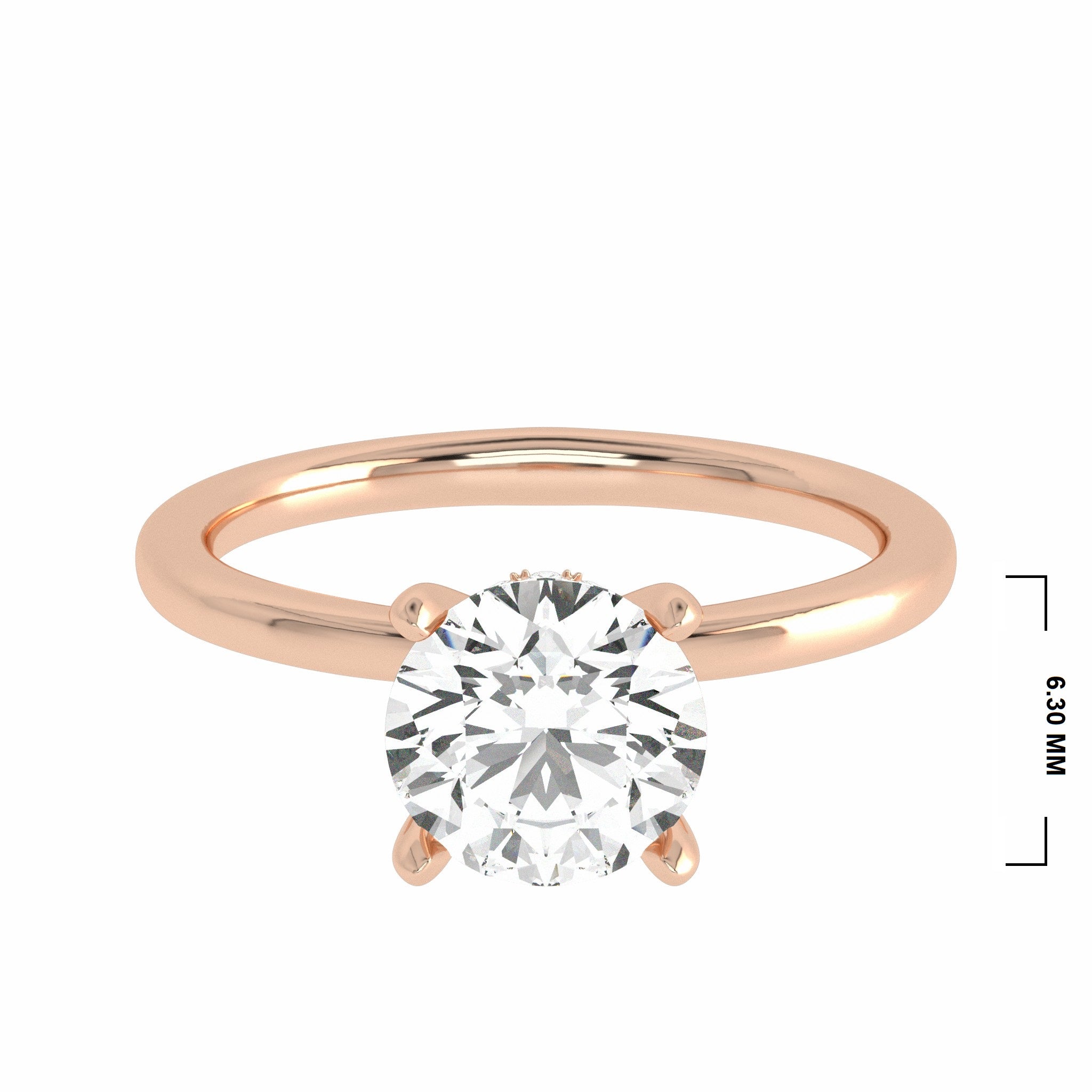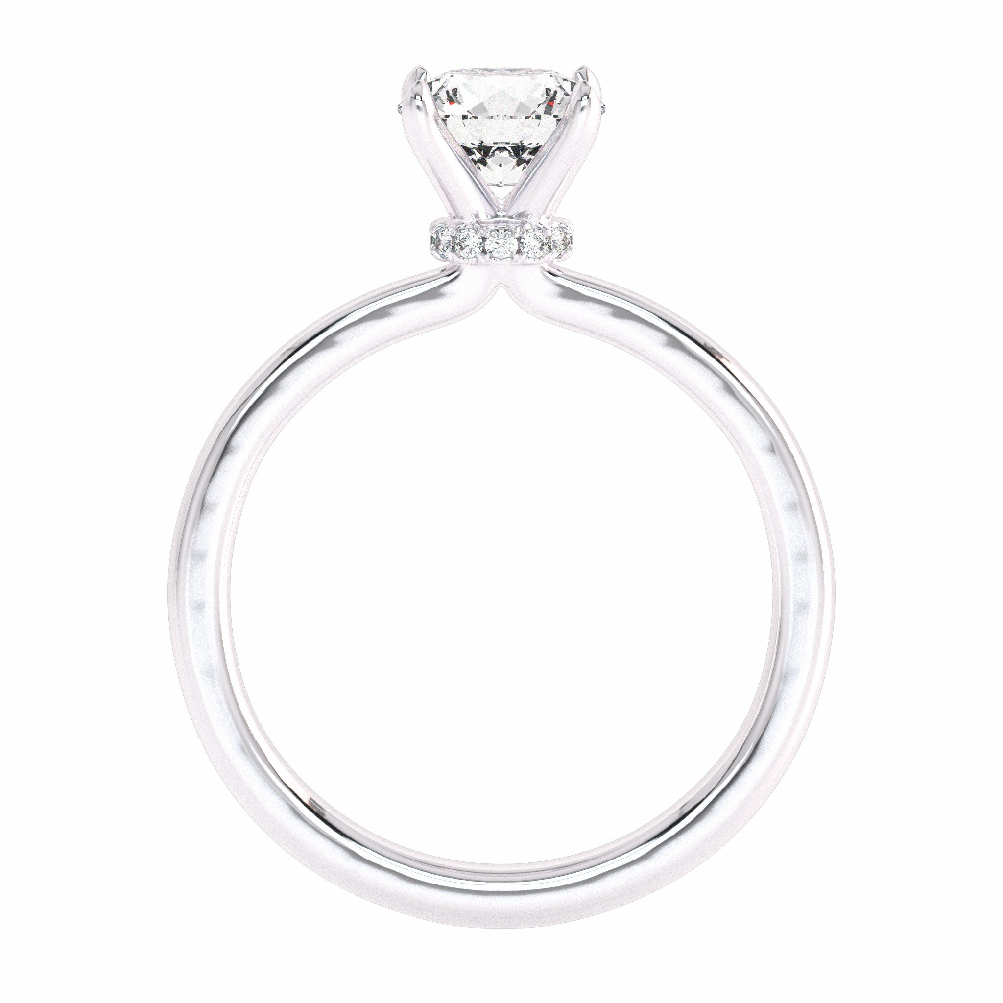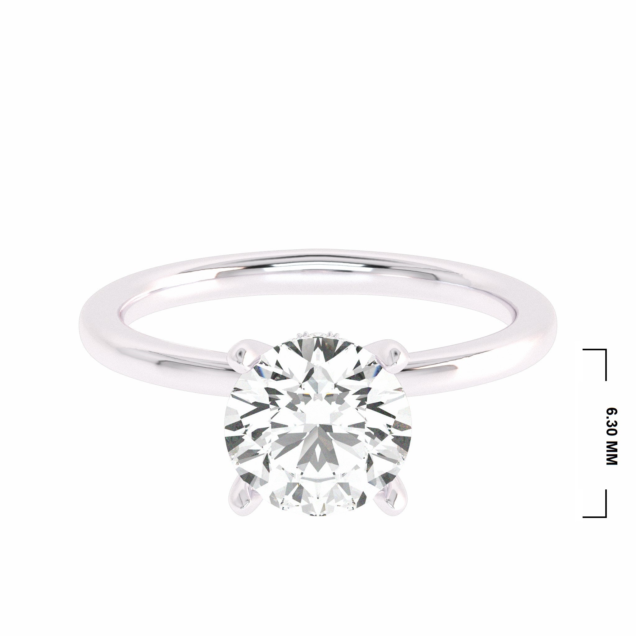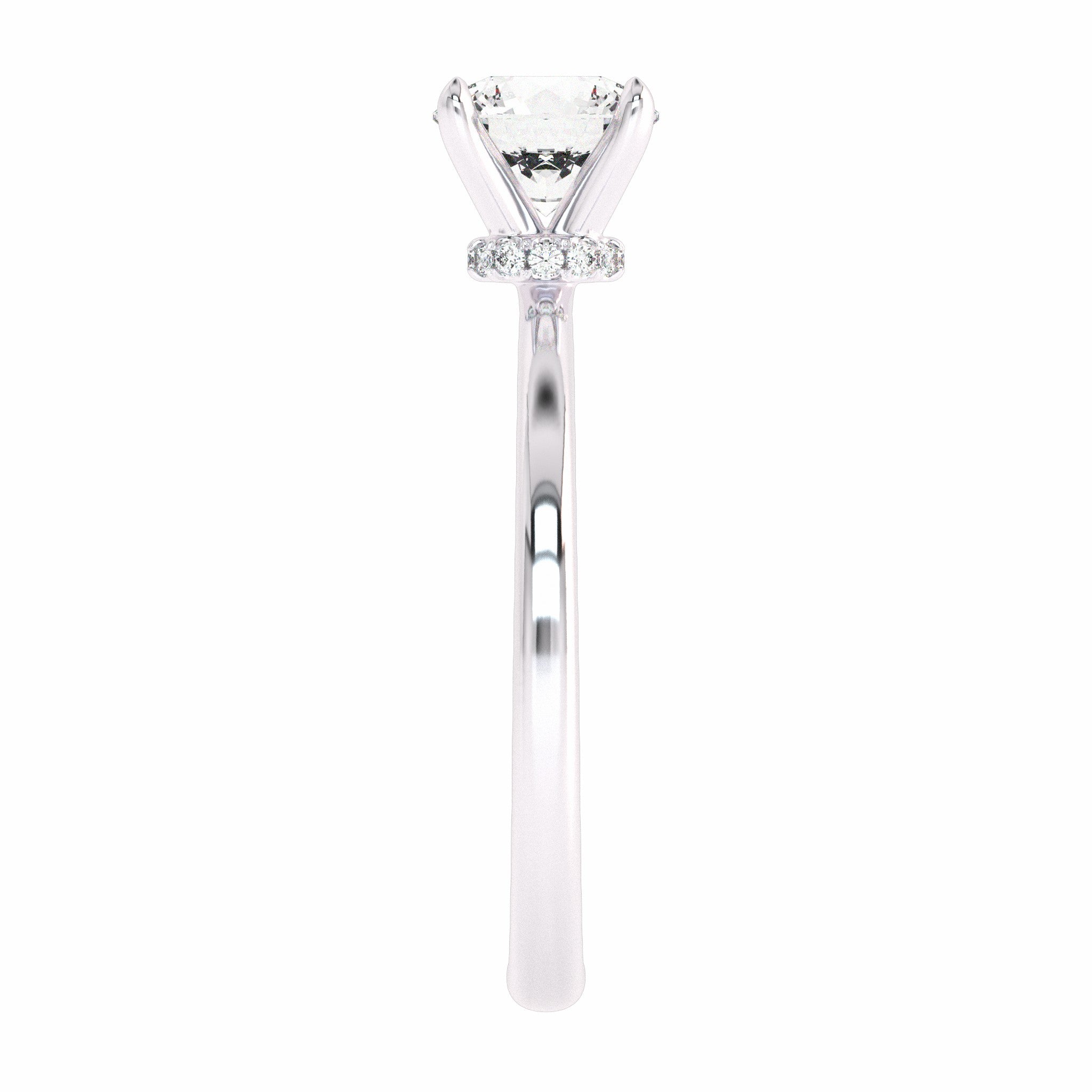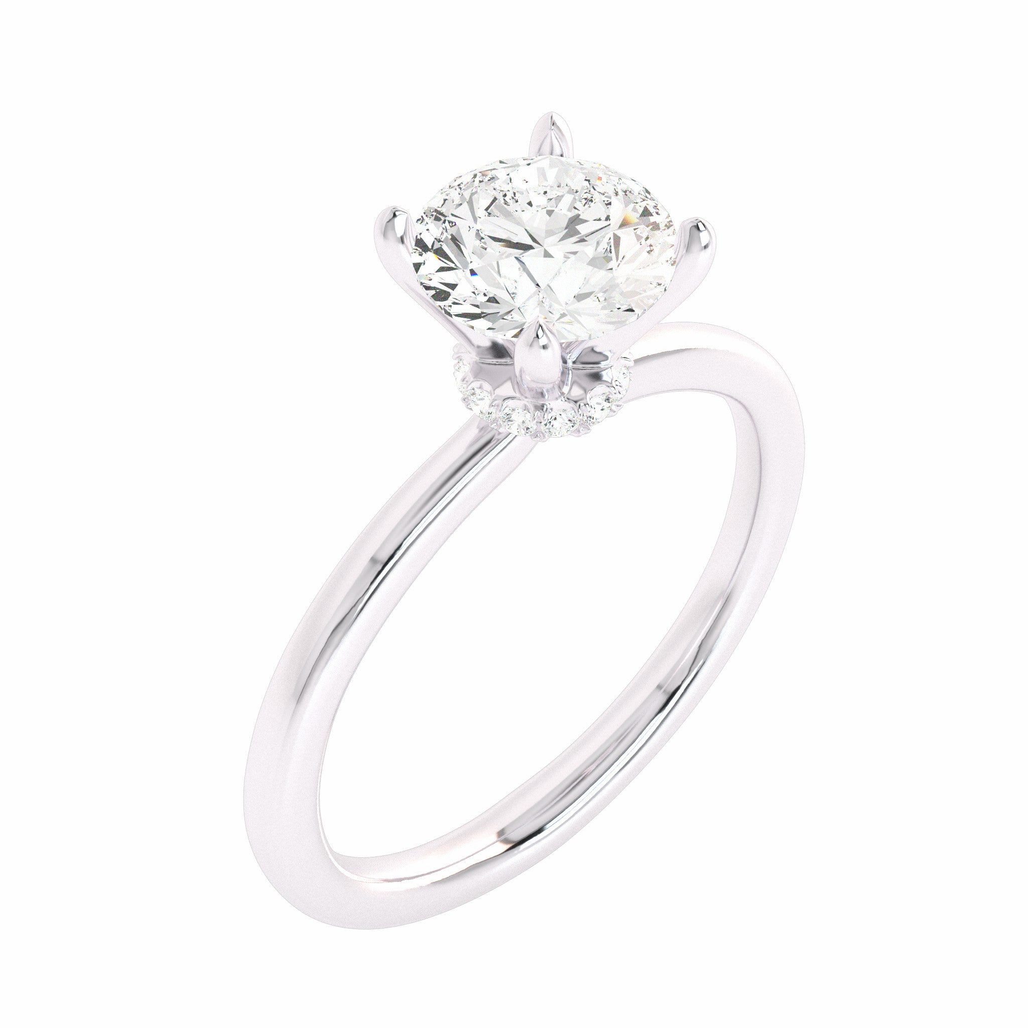 The Serenity Sparkle round cut diamond in a solitaire setting, surrounded by a hidden halo of smaller diamonds, this ring exudes elegance and sophistication. Crafted with DEF/VS quality diamonds set in a micro split and prong setting, an enchanting choice for those seeking a blend of classic beauty and a touch of celestial charm in their engagement ring.