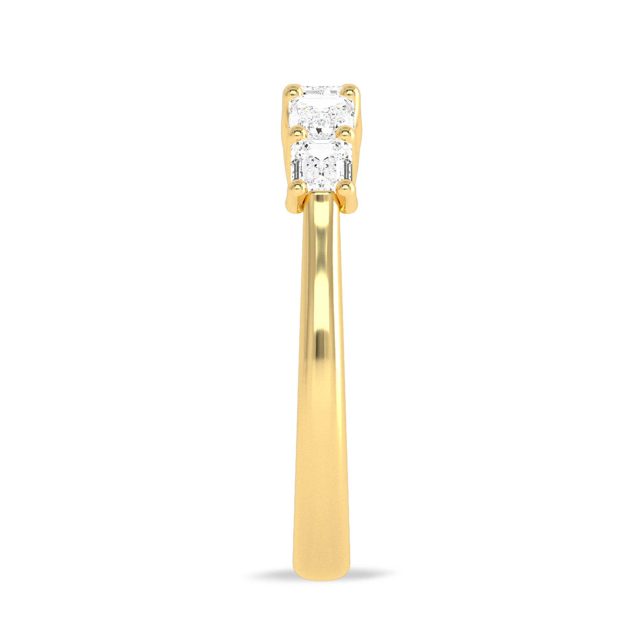 Crafted to perfection, this unique Trellis-style ring features five stunning Emerald cut Lab Created diamonds, exuding a mesmerizing aura. Set in a prong setting, these diamonds dazzle with F-G color and SI clarity, ensuring a one of a kind elegance.