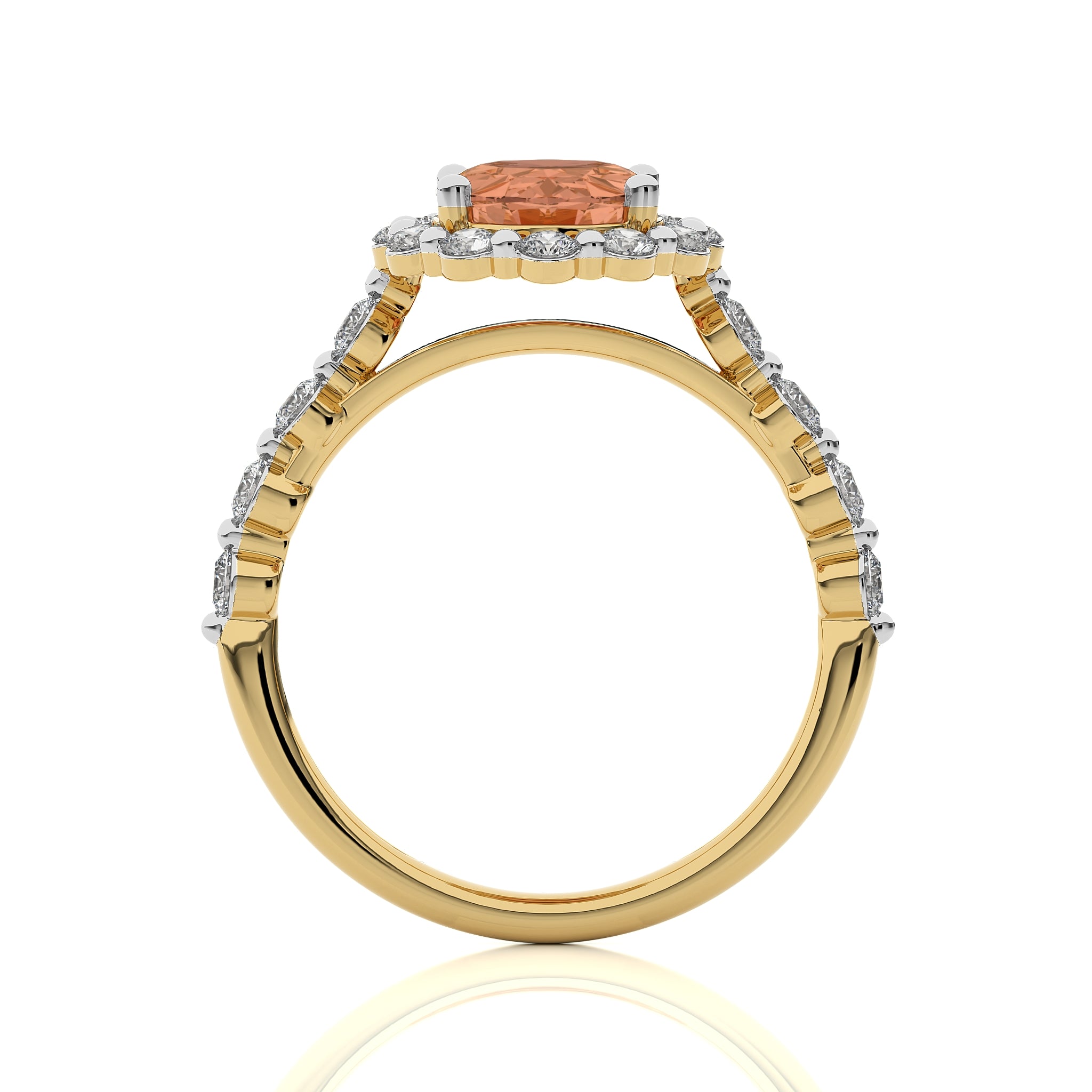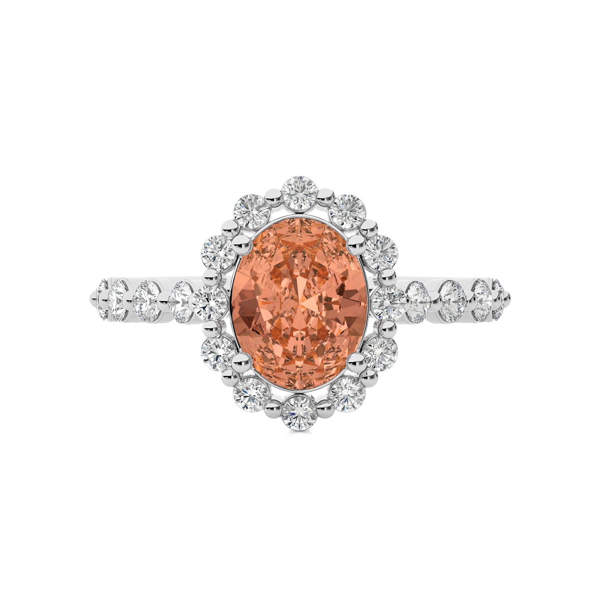 The Ethereal Blossom Engagement Ring features a stunning oval morganite gemstone surrounded by I-J/SI Quality diamonds in a prong setting, creating a captivating blend of elegance and brilliance.