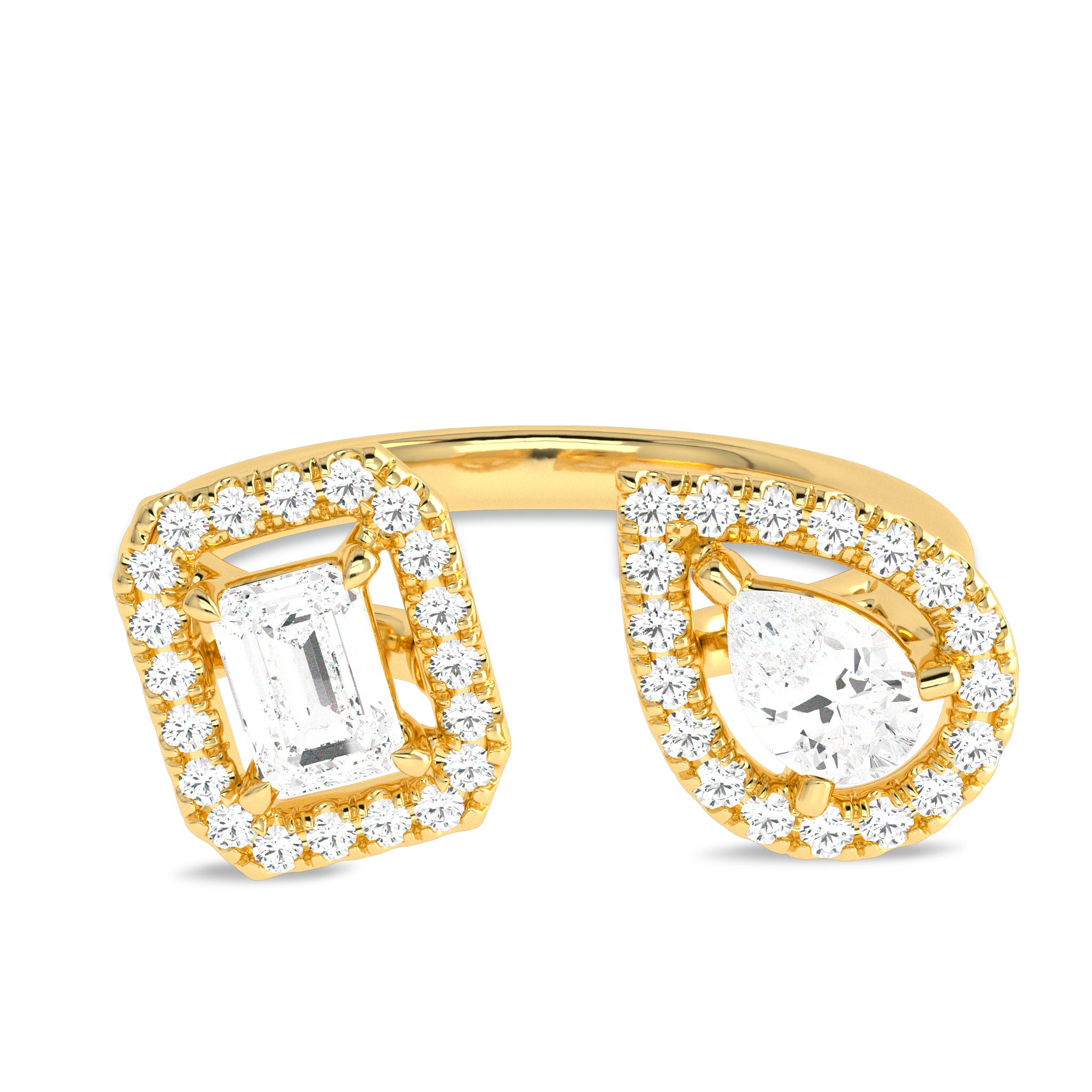 Discover the enchanting allure of this Two-Headed Pear and Emerald Cut Lab Created Diamond Ring. With a captivating design that blends two exquisite diamond cuts, this ring is truly exceptional. Set in a micro split and prong setting, these diamonds radiate brilliance. With F-G color and SI quality, ensuring a stunning sparkle that captivates at every angle.