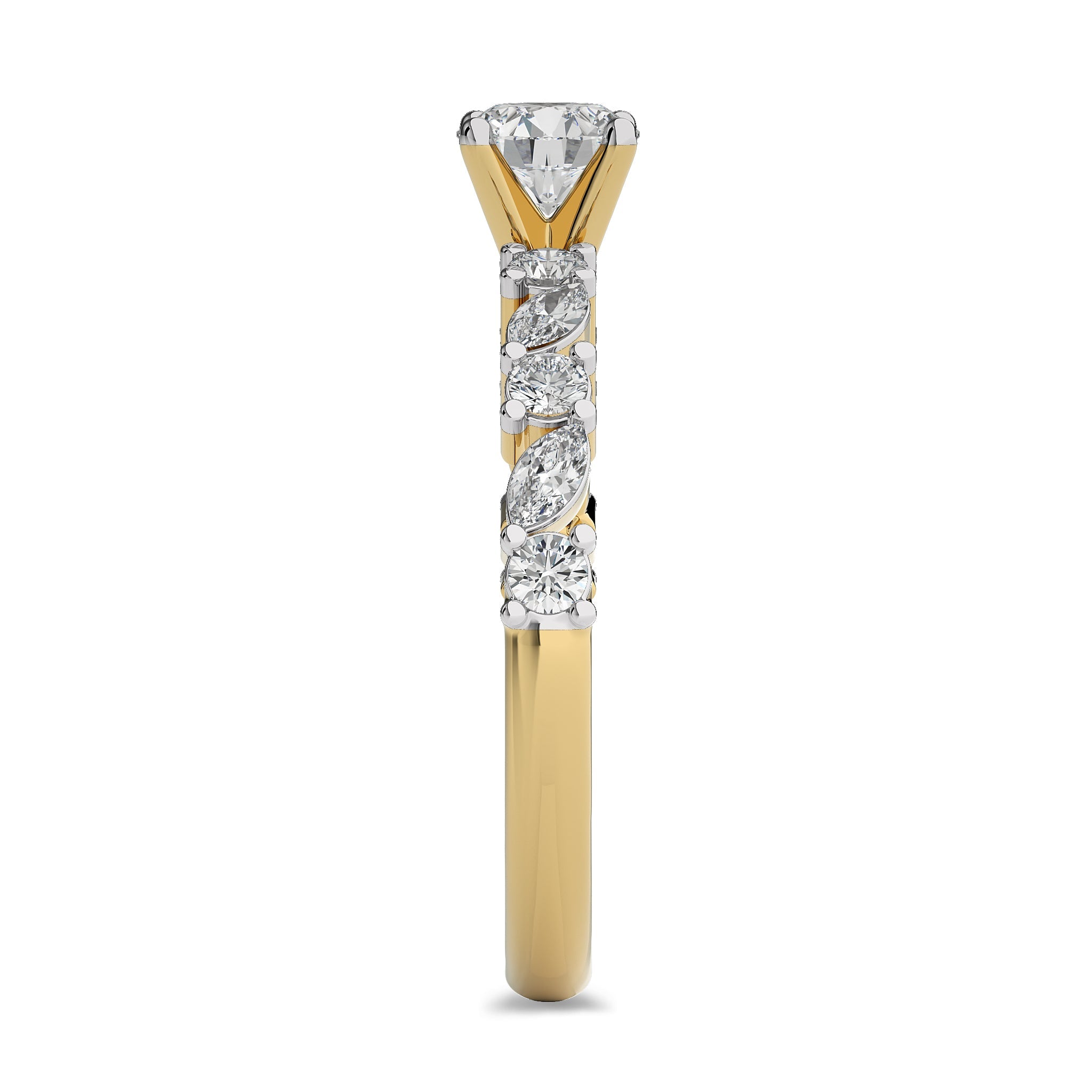 This striking engagement ring showcases a 1 carat cocktail of round and marquise lab-created diamonds, set in DEF/SI quality with precision prong settings. The blend of shapes and sparkle creates a captivating allure. Celebrate your love story with this dazzling ring, perfect for making every moment extraordinary