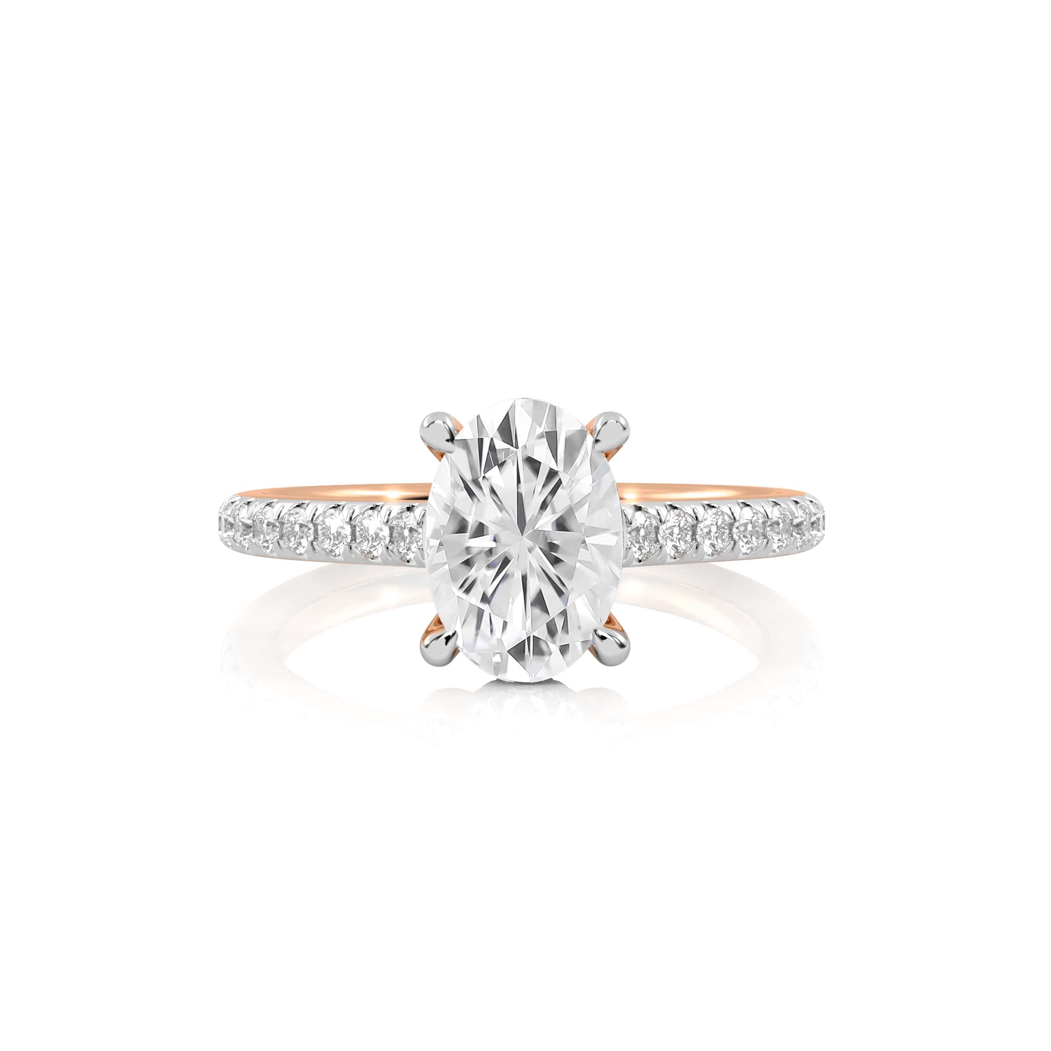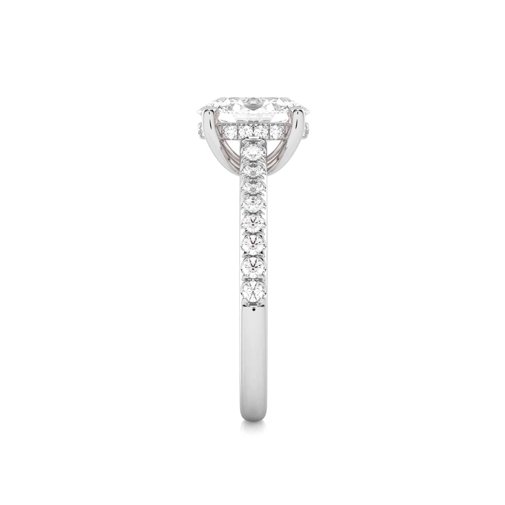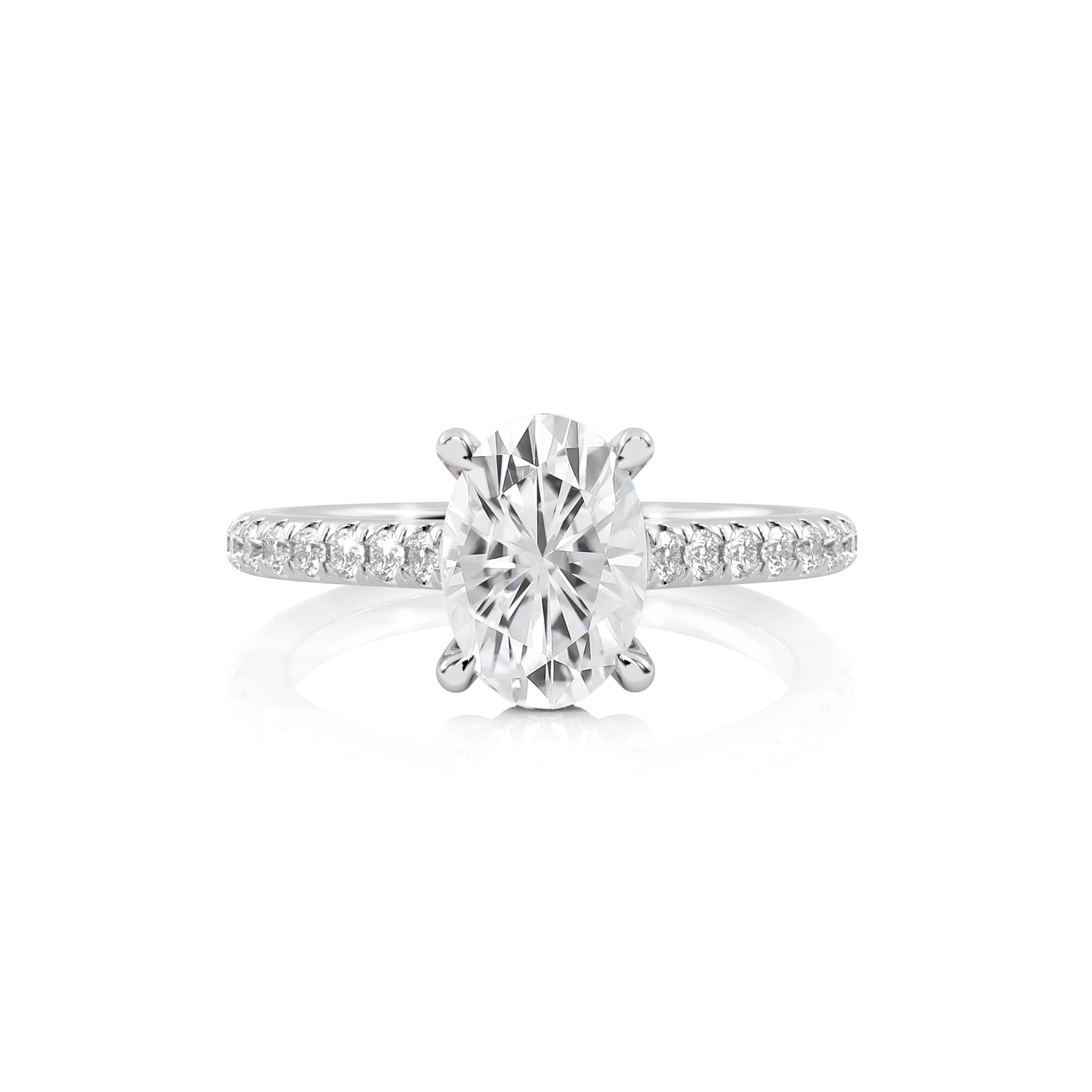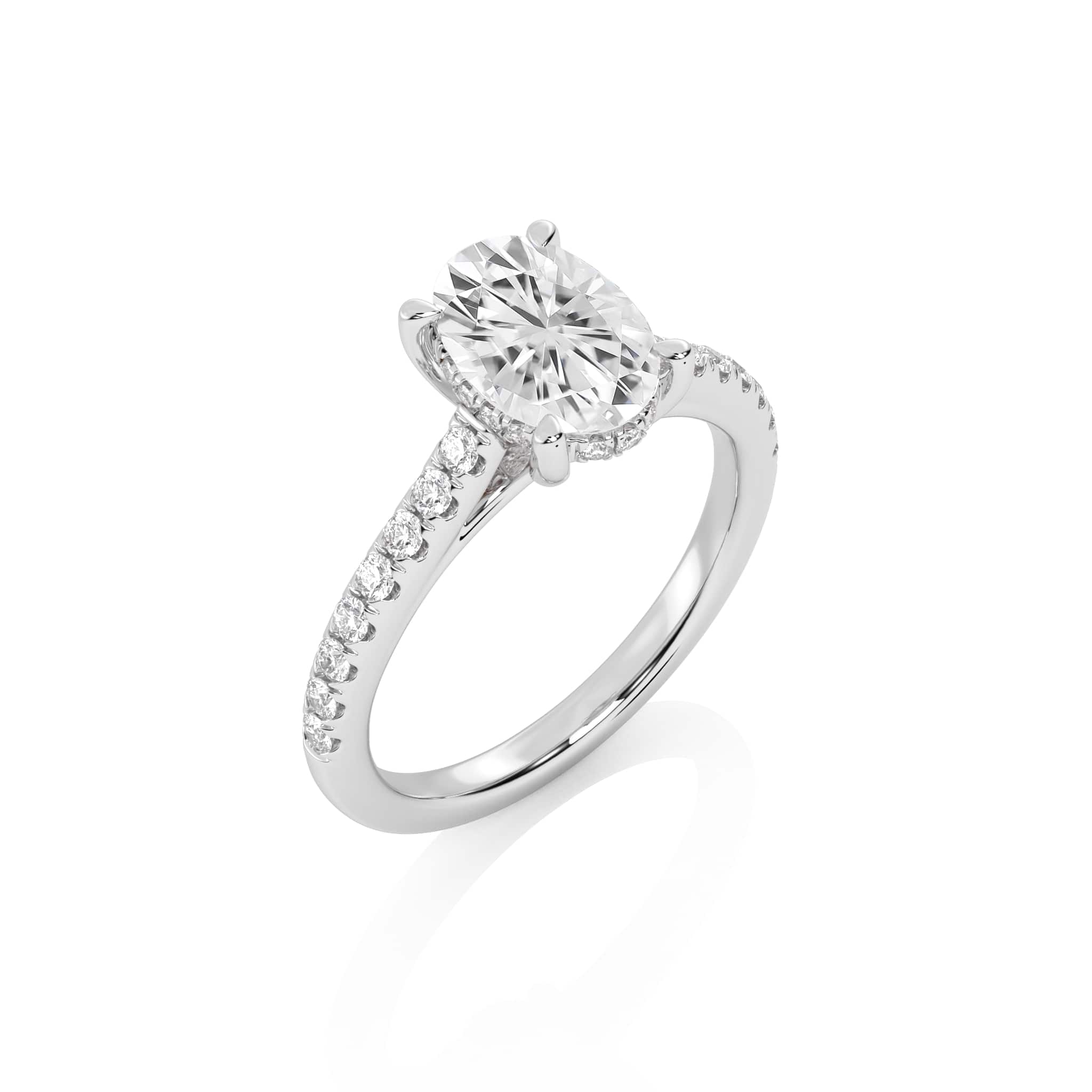 This ring features a breathtaking 2 carat oval center stone highlighted by 1/3 carat round side stones crafted with Natural diamonds in a refined micro-prong and prong setting, it offers a naturally graceful and timeless appeal